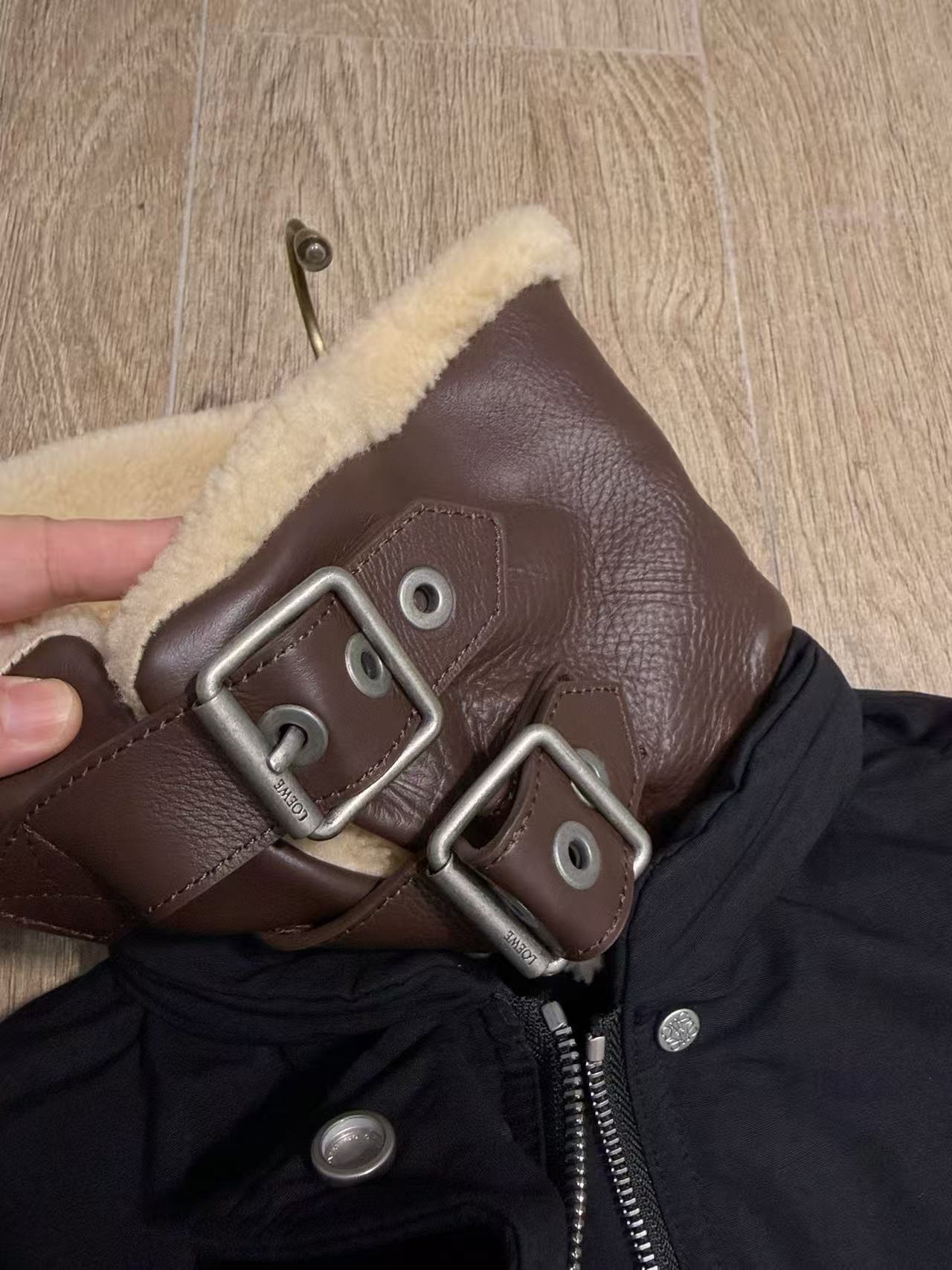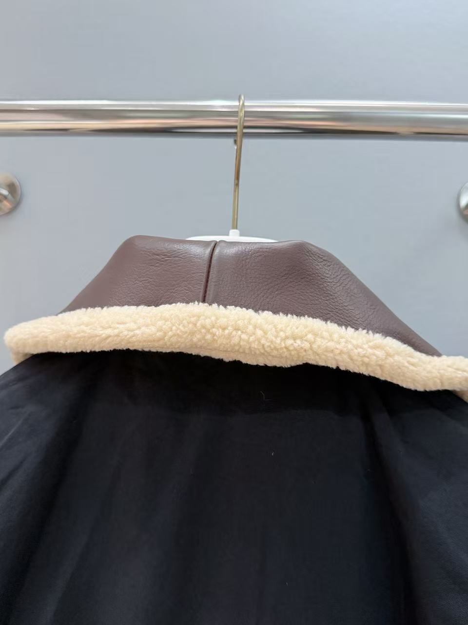領口底層採 定制真皮翻領,可拆卸,也能立起來當圍脖使用,防止寒風灌入,設計貼心實用。