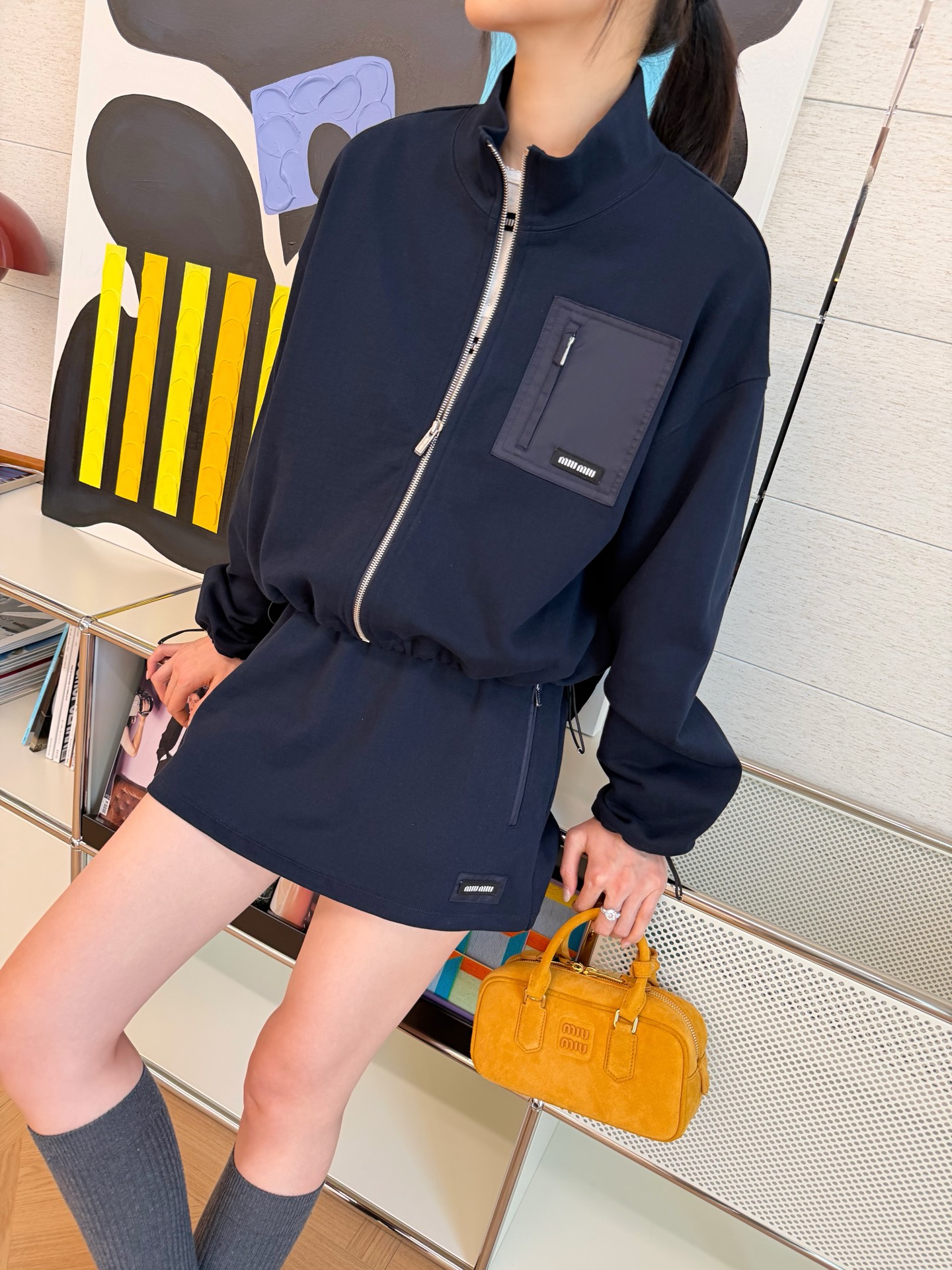 這款一眼就讓人留下深刻印象。低調卻很有存在感的深藍色調,結合短版剪裁與運動元素,穿起來俐落有型,輕鬆詮釋現代休閒風格。