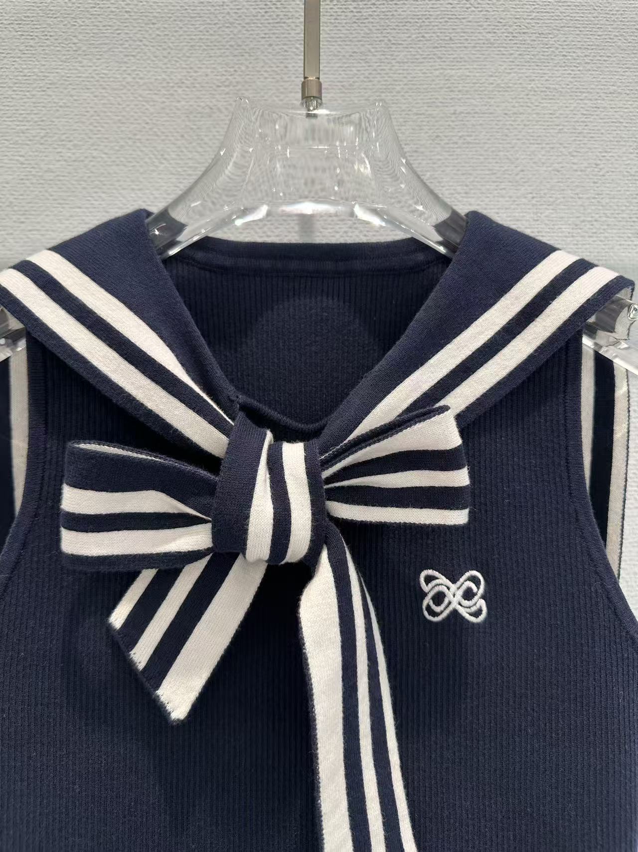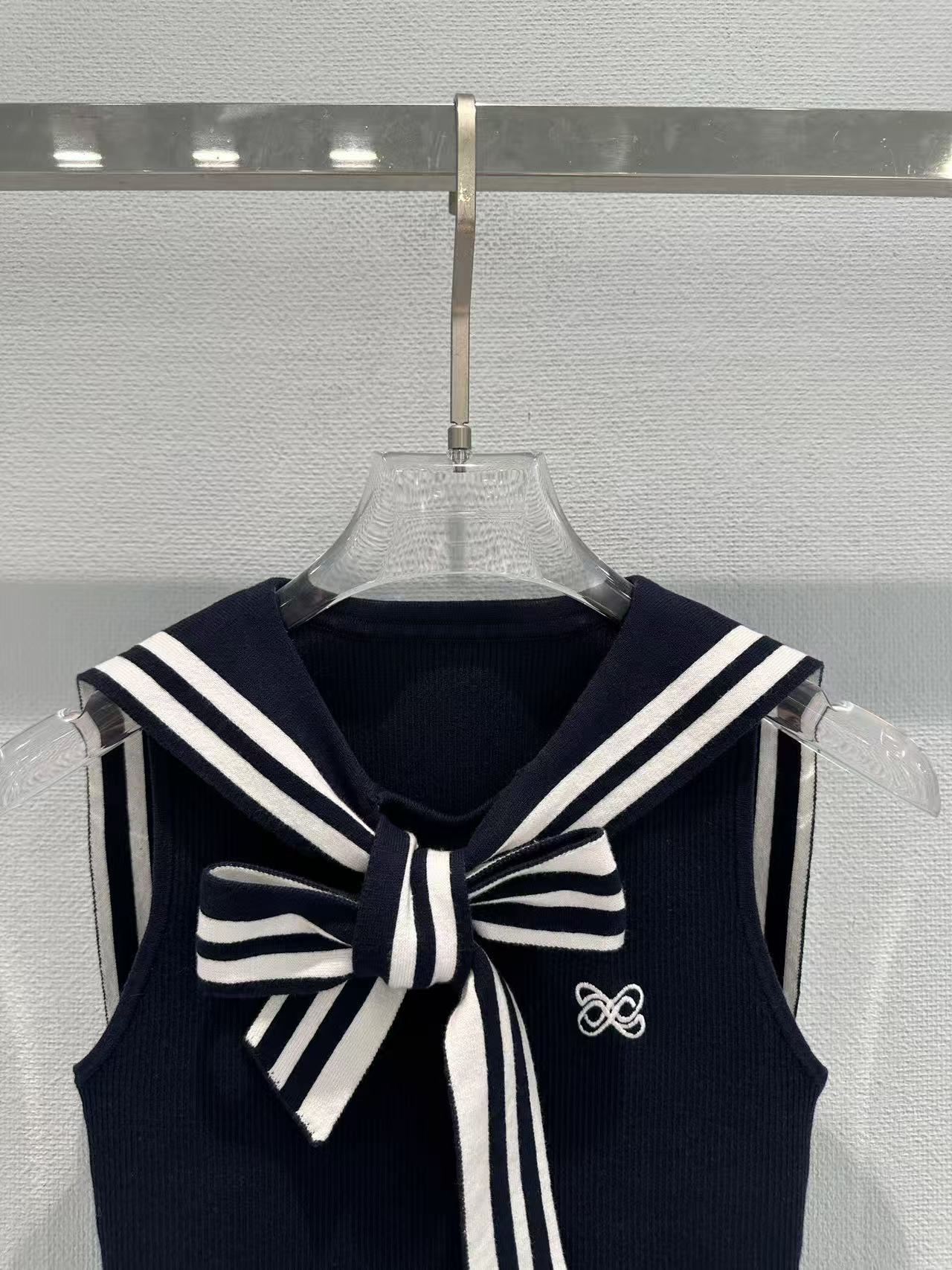 以深邃且具備知性氣質的藏青色為基底,透過肩部的白色條紋點綴與領口別緻的蝴蝶結設計,精確勾勒出充滿青春活力的視覺節奏感。