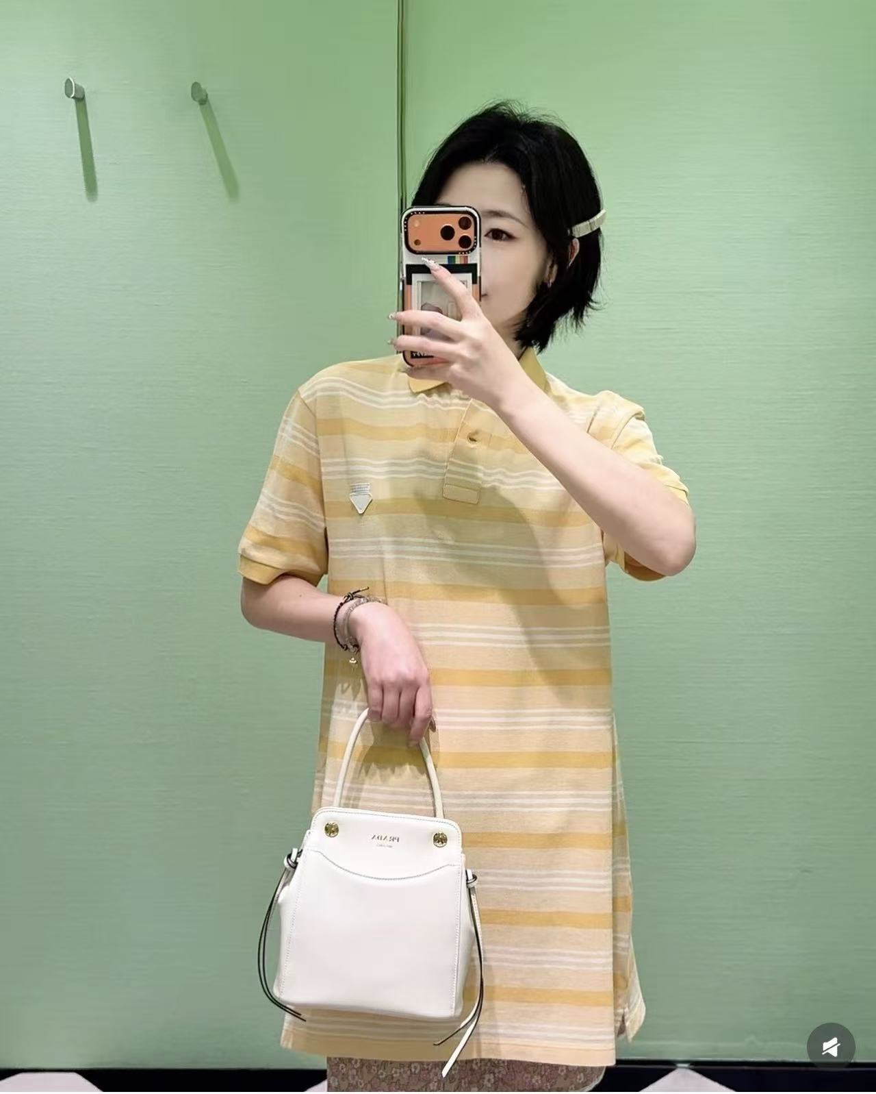 經典 Polo 領結合胸前三角標細節,在隨性中注入了精品成衣的俐落感,
