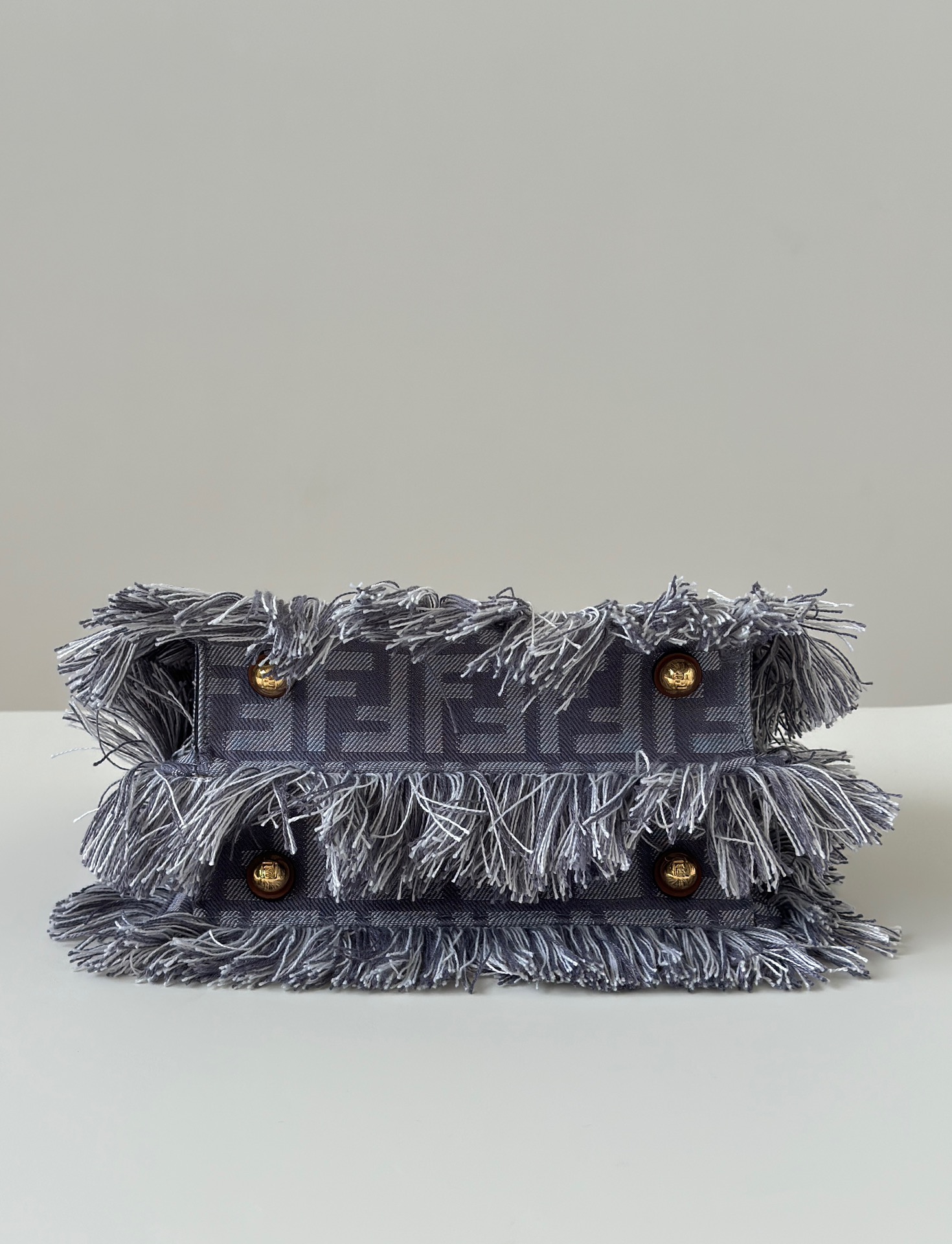 主體以牛仔提花製作,紋理清晰、耐看又有設計感。搭配品牌標誌性 FF 元素與流蘇裝飾,既經典又不失玩味。金屬扣件則採用全鋼材質,光澤細緻,提升了包款的高級氛圍與耐用度。