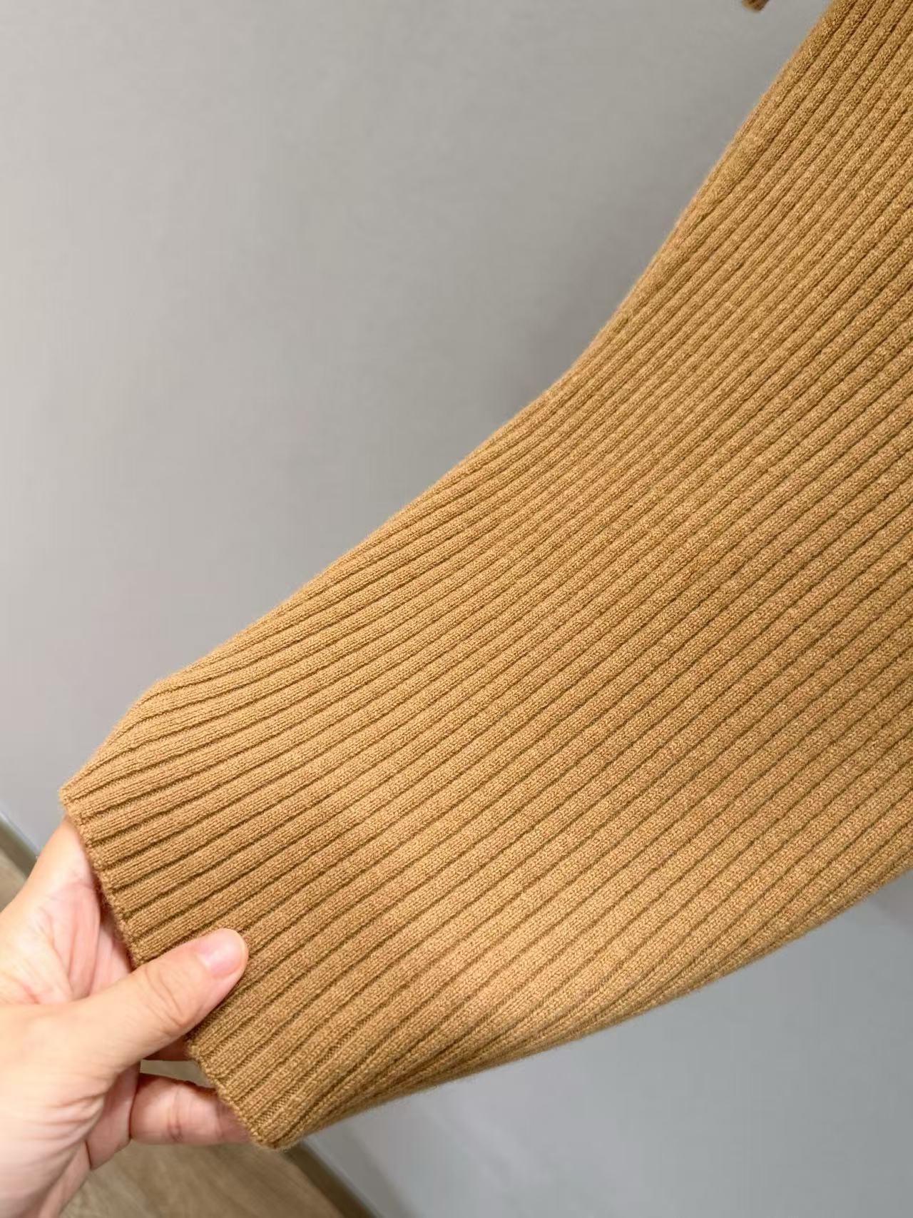 採用高比例羊絨混紡紗線,觸感柔滑親膚,透氣性佳,秋季單穿或作為內搭都十分合適。羅紋結構使毛衣在修飾身型的同時保有舒適彈性。