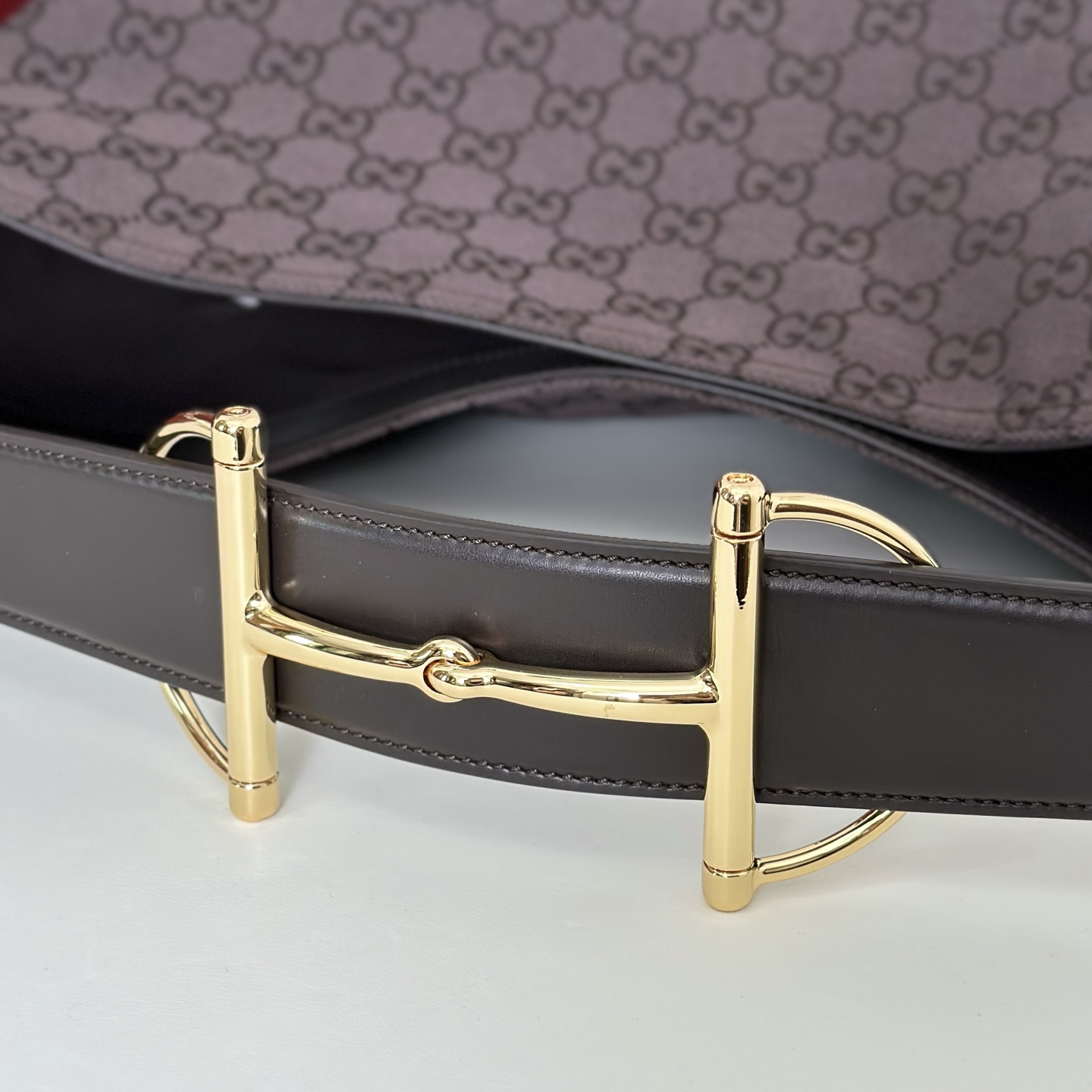 主體採用經典GG花紋帆布,質地堅韌耐磨,搭配細緻牛皮邊飾,整體更添高級層次。金色調五金件則為整體注入一抹溫潤亮點,讓整體設計更顯精緻與立體感。