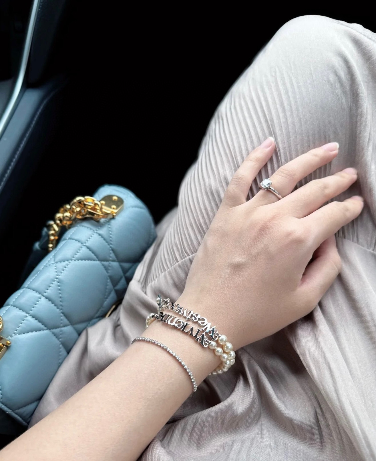 字母結合土星元素,再搭配溫潤的珍珠,讓整體風格在率性與優雅之間取得完美平衡,帶點龐克感,卻又保留少女的細膩氣質。