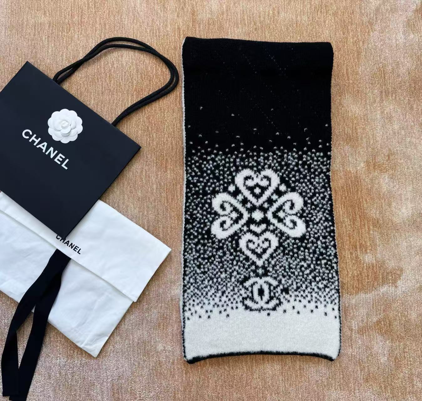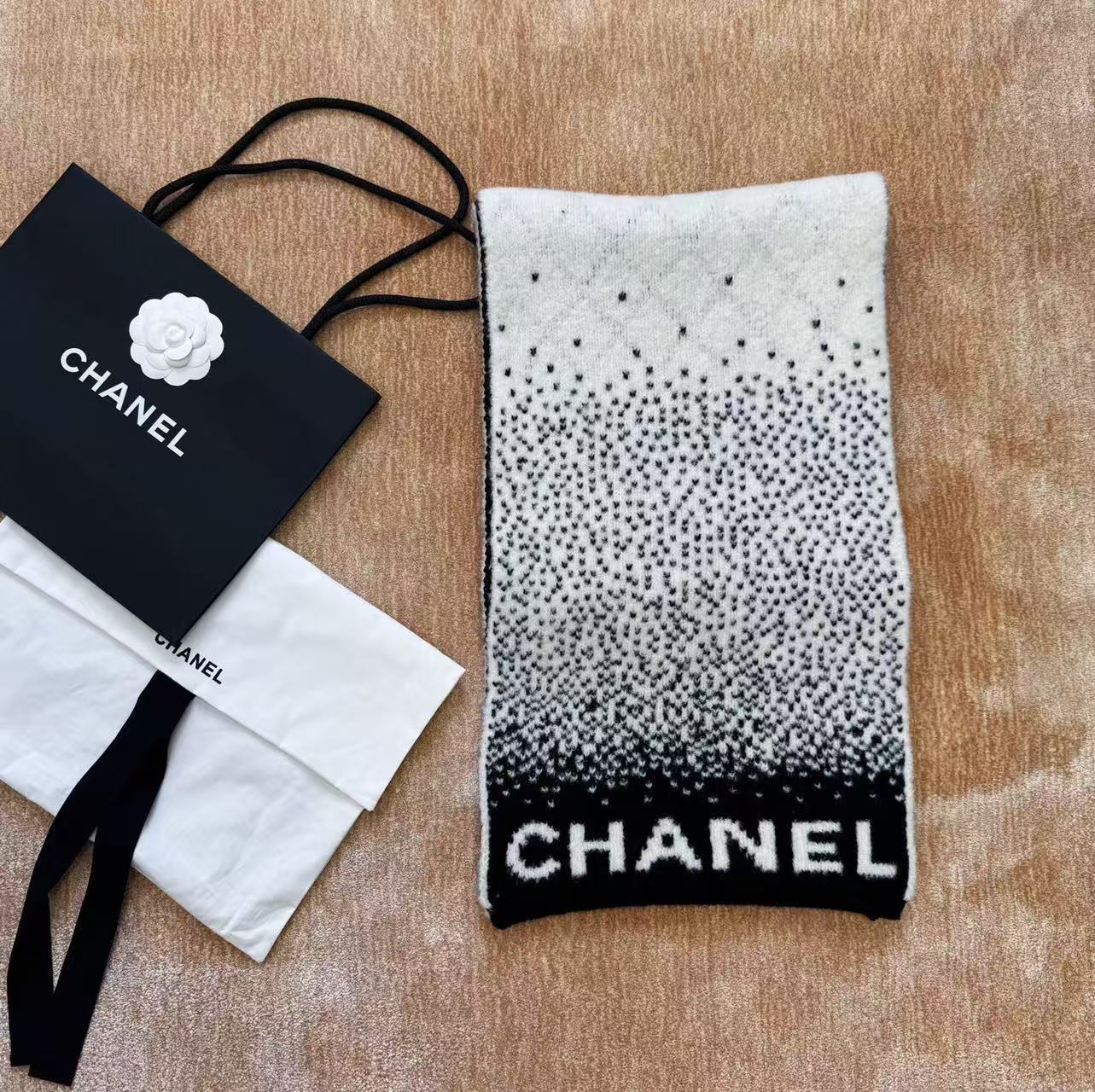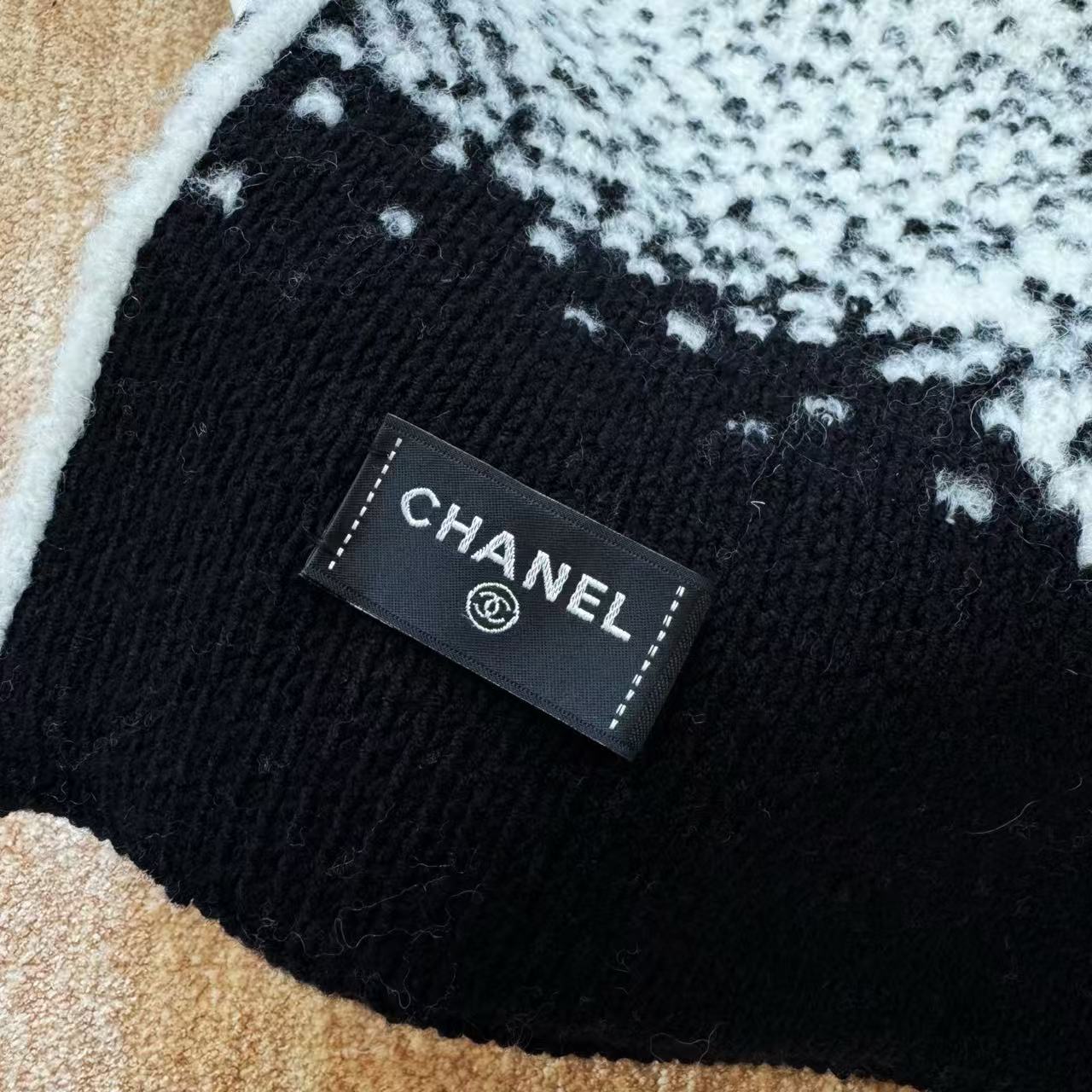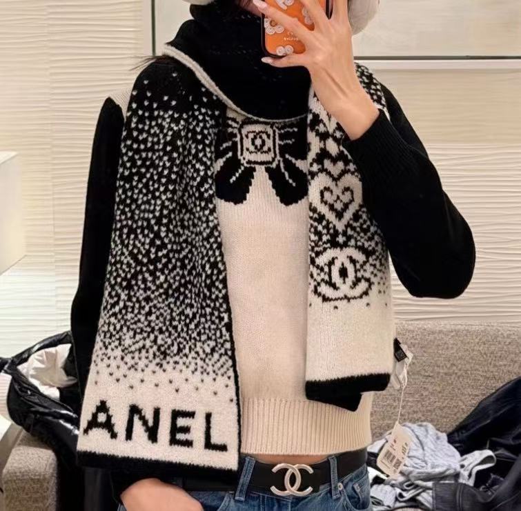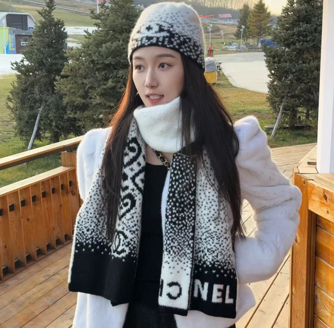 這條根本是「把雪山貴婦直接圍在脖子上」的夢幻單品,遠看就是黑白經典配色,近看才發現整條是立體7針拔花+凹凸格紋+漸變雙C若隱若現,隨便一圍整個氣場從台北變阿爾卑斯山頂,貴到讓路人自動幫你讓路~