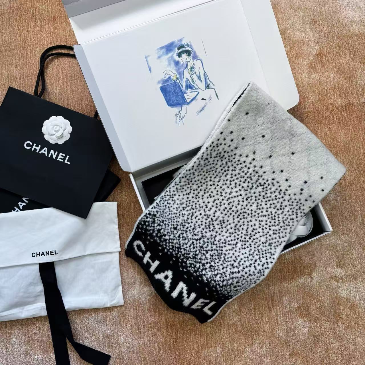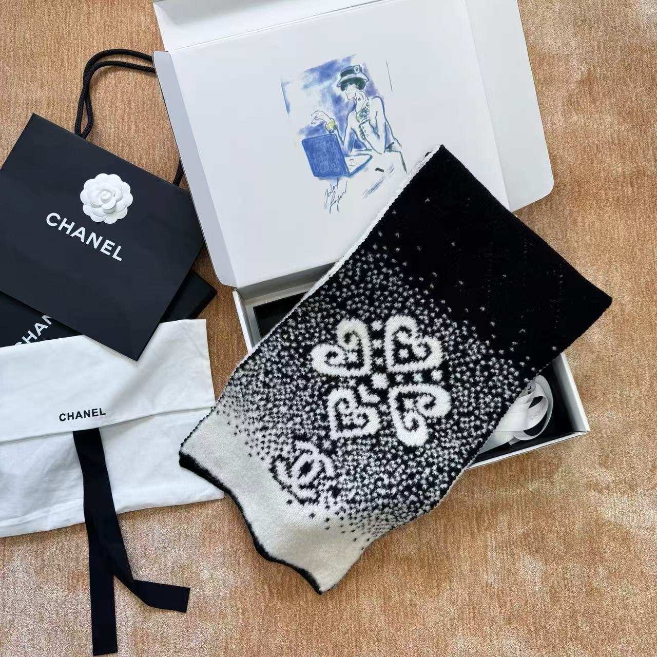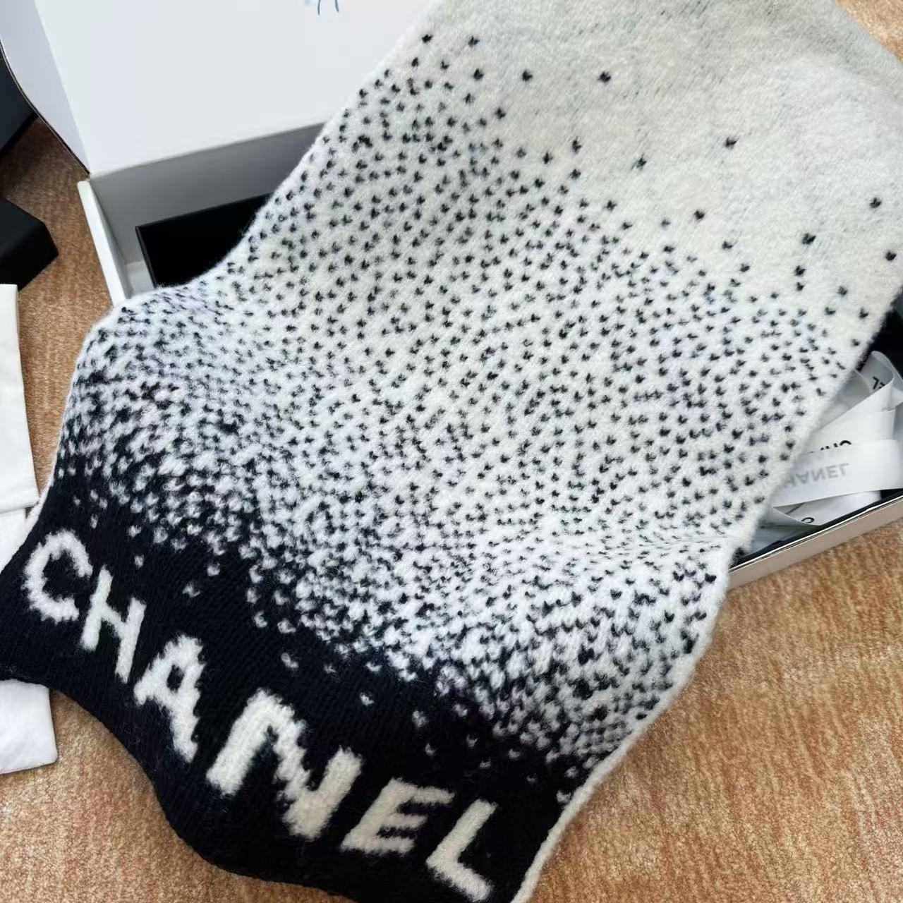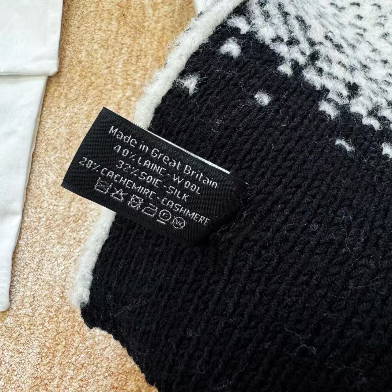 這條根本是「把雪山貴婦直接圍在脖子上」的夢幻單品,遠看就是黑白經典配色,近看才發現整條是立體7針拔花+凹凸格紋+漸變雙C若隱若現,隨便一圍整個氣場從台北變阿爾卑斯山頂,貴到讓路人自動幫你讓路~
