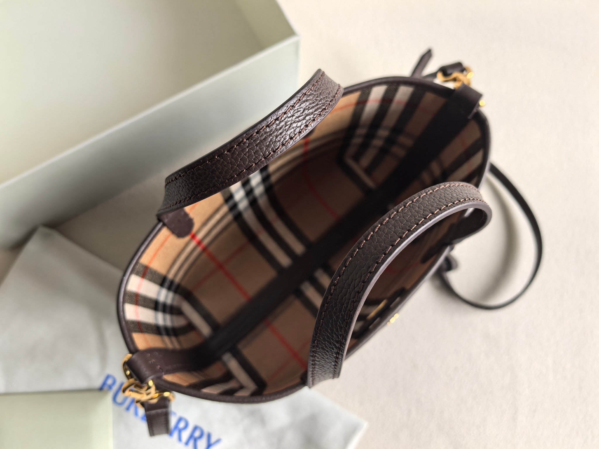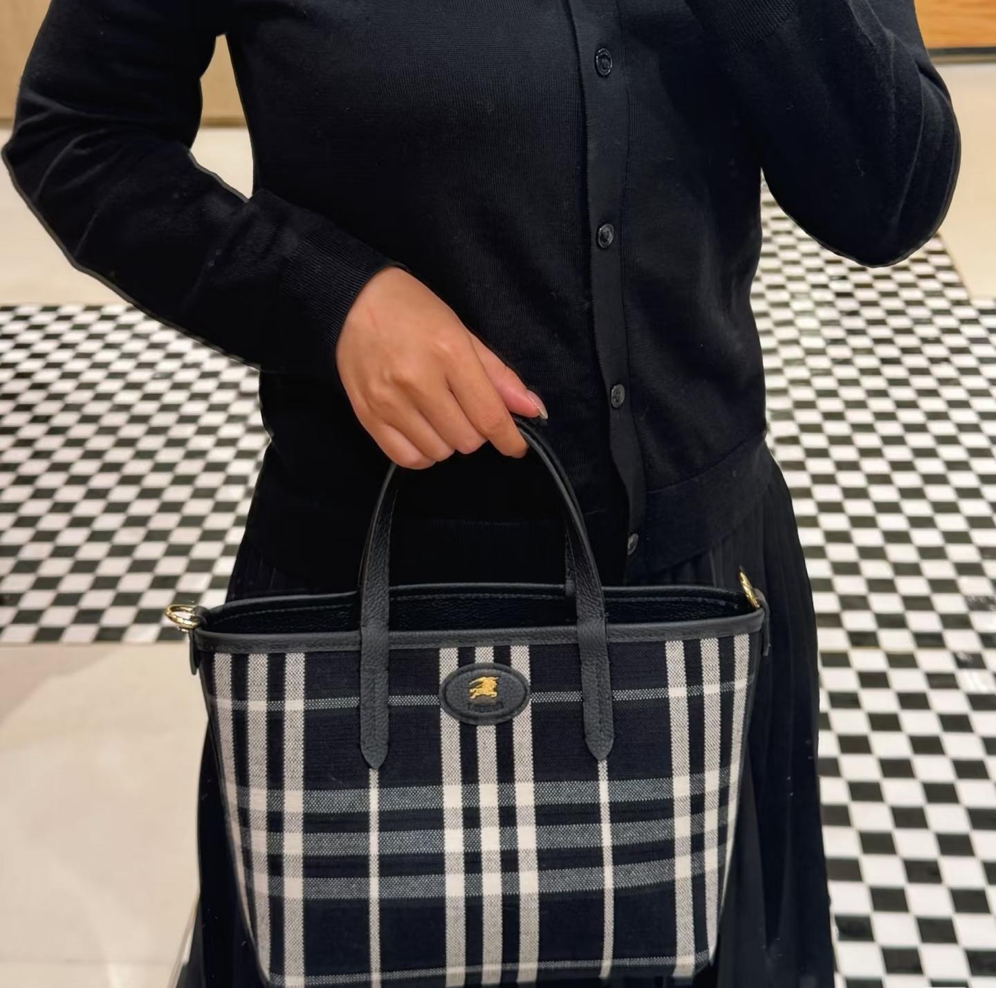 最加分的是它的雙面設計,一面是質感滿滿的粒紋皮革,另一面則是經典格紋拼接,等於一顆包直接擁有兩種風格,隨心情或穿搭切換,實用度真的很高。