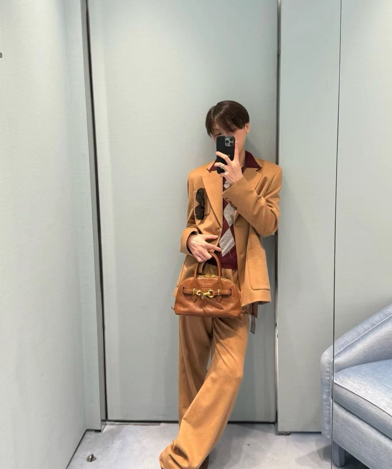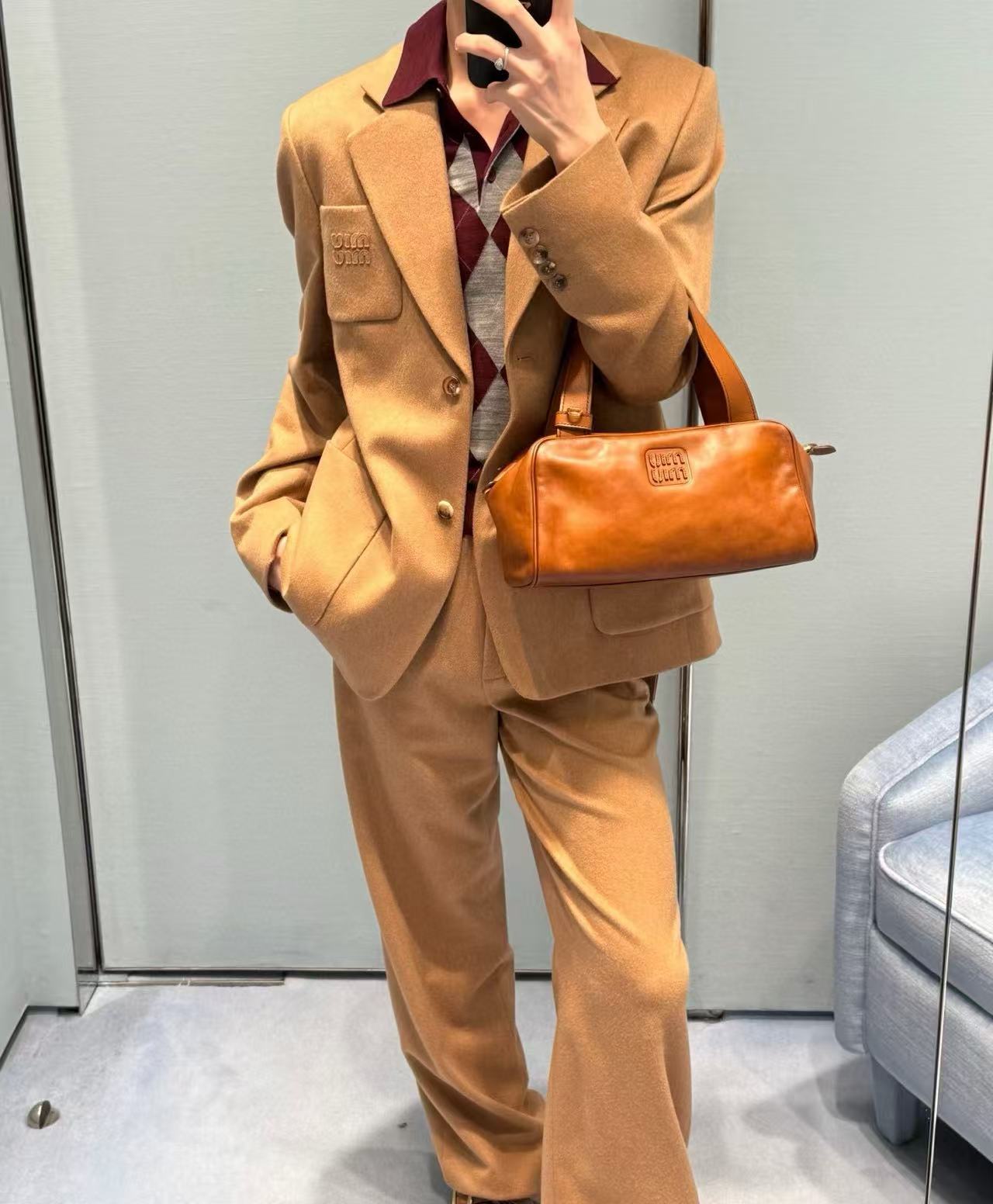 這套駱駝毛西服外套+長褲,展現 「低調卻不容忽視」 的奢華氛圍。簡單搭配一件襯衫或針織背心,就能隨時切換通勤、聚會或休閒模式,質感與實穿度都在線,是早秋衣櫃裡的必收單品。