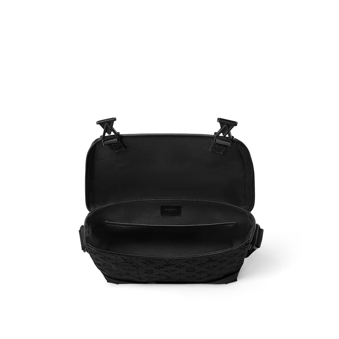這款郵差包的材質真的非常講究!它使用了頂級的 Monogram Shadow 小牛皮製成,最特別的是它採用了低調奢華的條紋壓花工藝。這種壓紋讓經典的老花圖案以更內斂、更具金屬感紋理的方式呈現,充滿了沉穩的男性魅力,質感一眼可見!