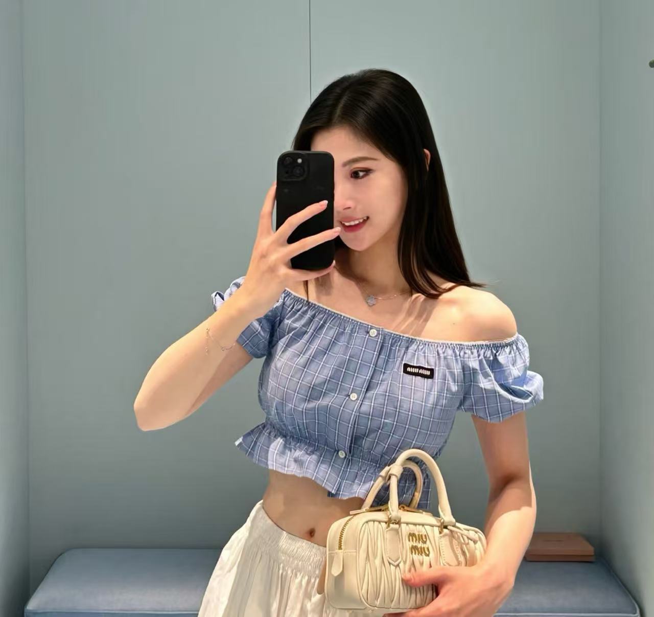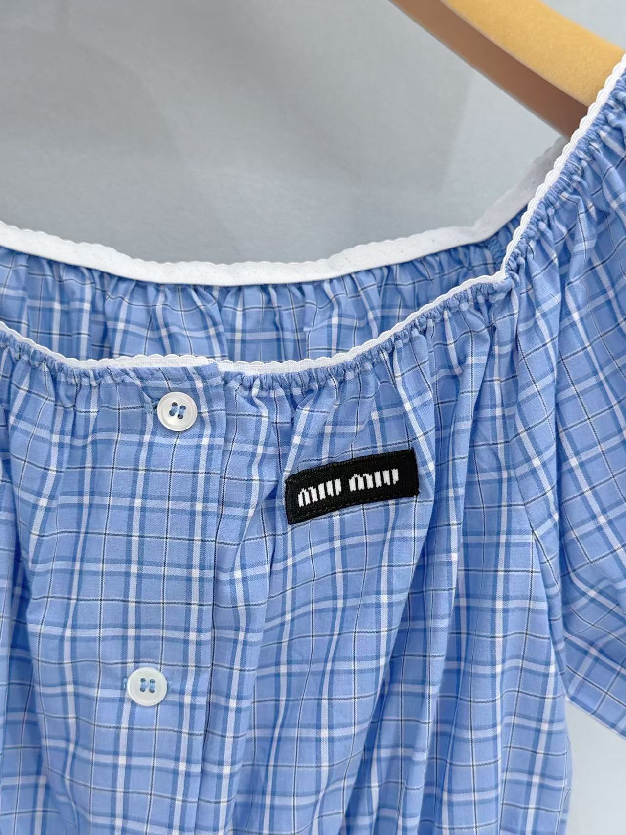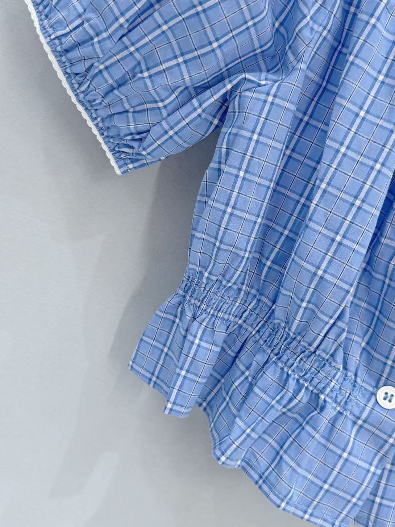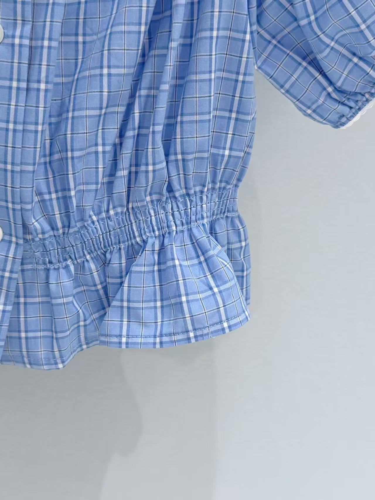 2026早春 Miu家 藍白格紋收腰泡泡袖上衣