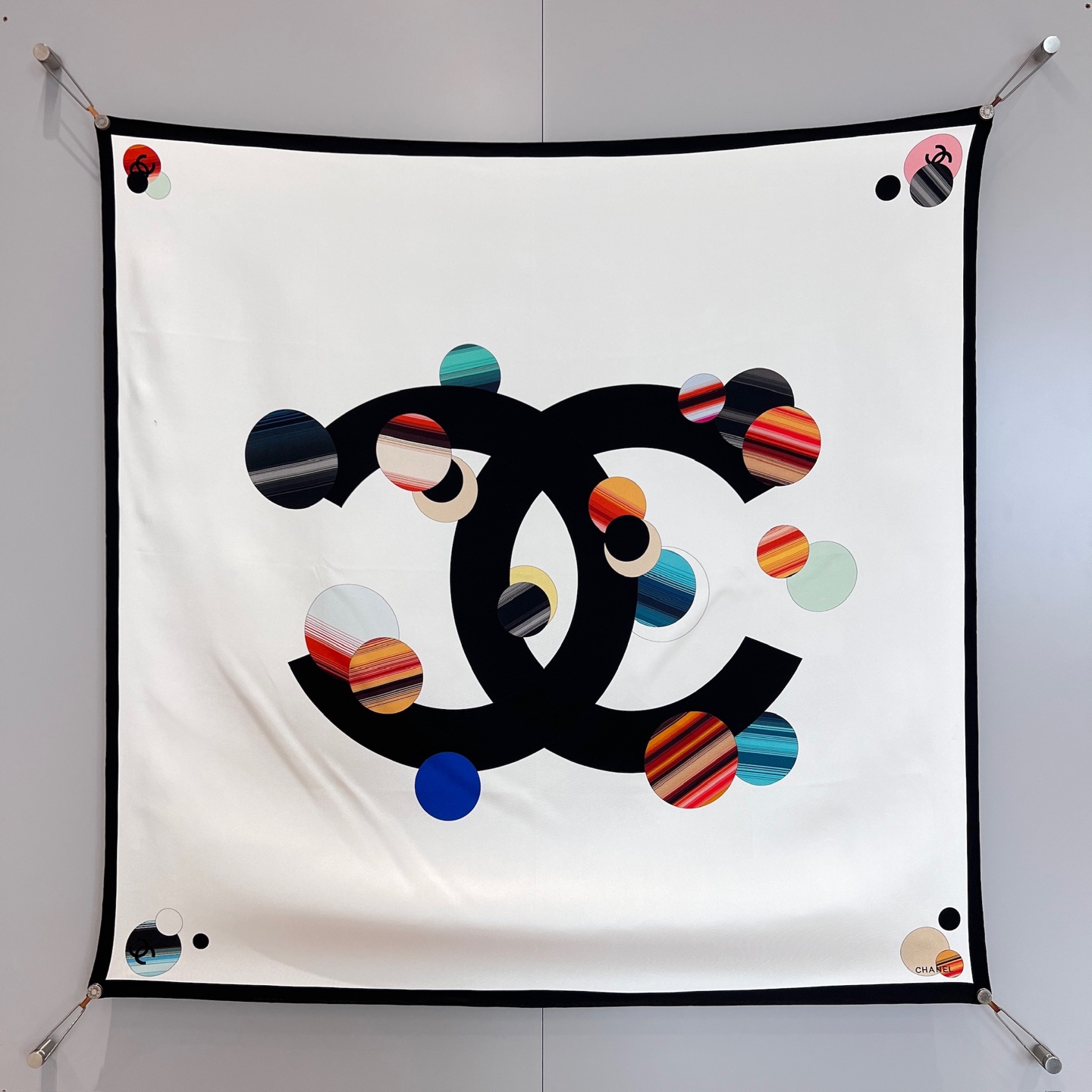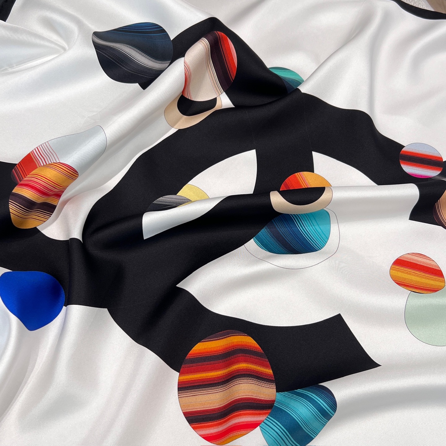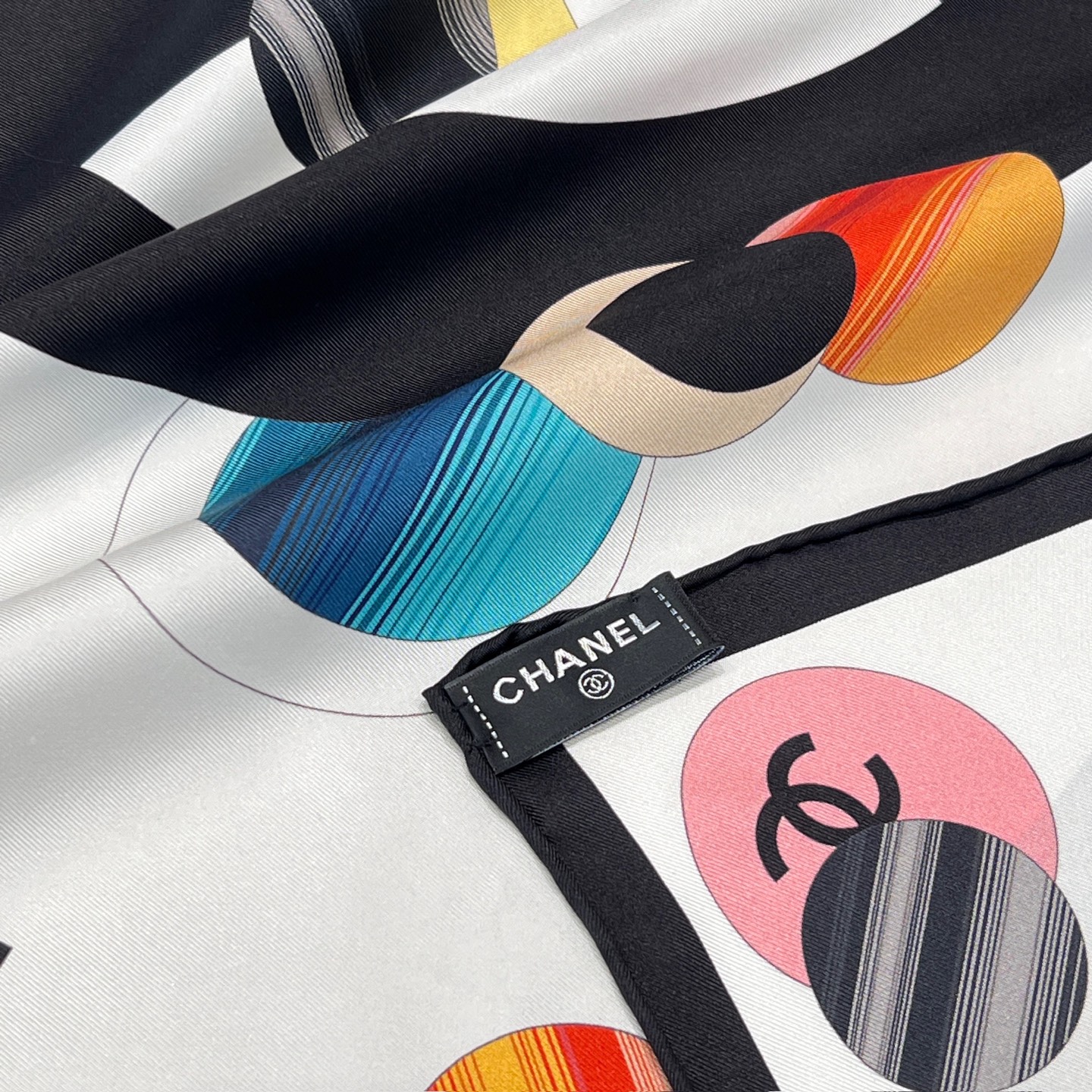 這款絲巾一拿到真的會被它的細節吸引。經典黑白基底搭配標誌性的雙C元素,再融入多彩圓形圖案,整體視覺既有層次又不會過於張揚。