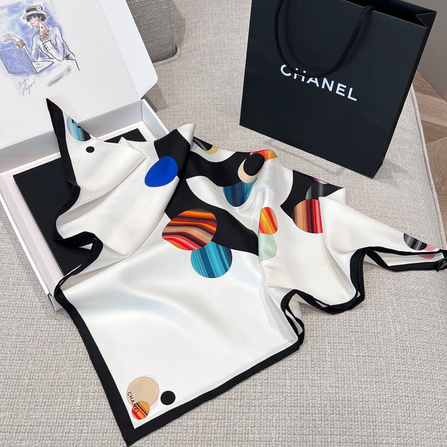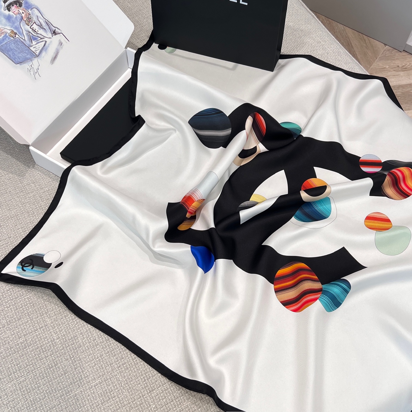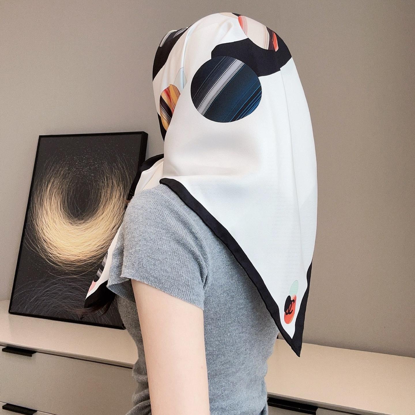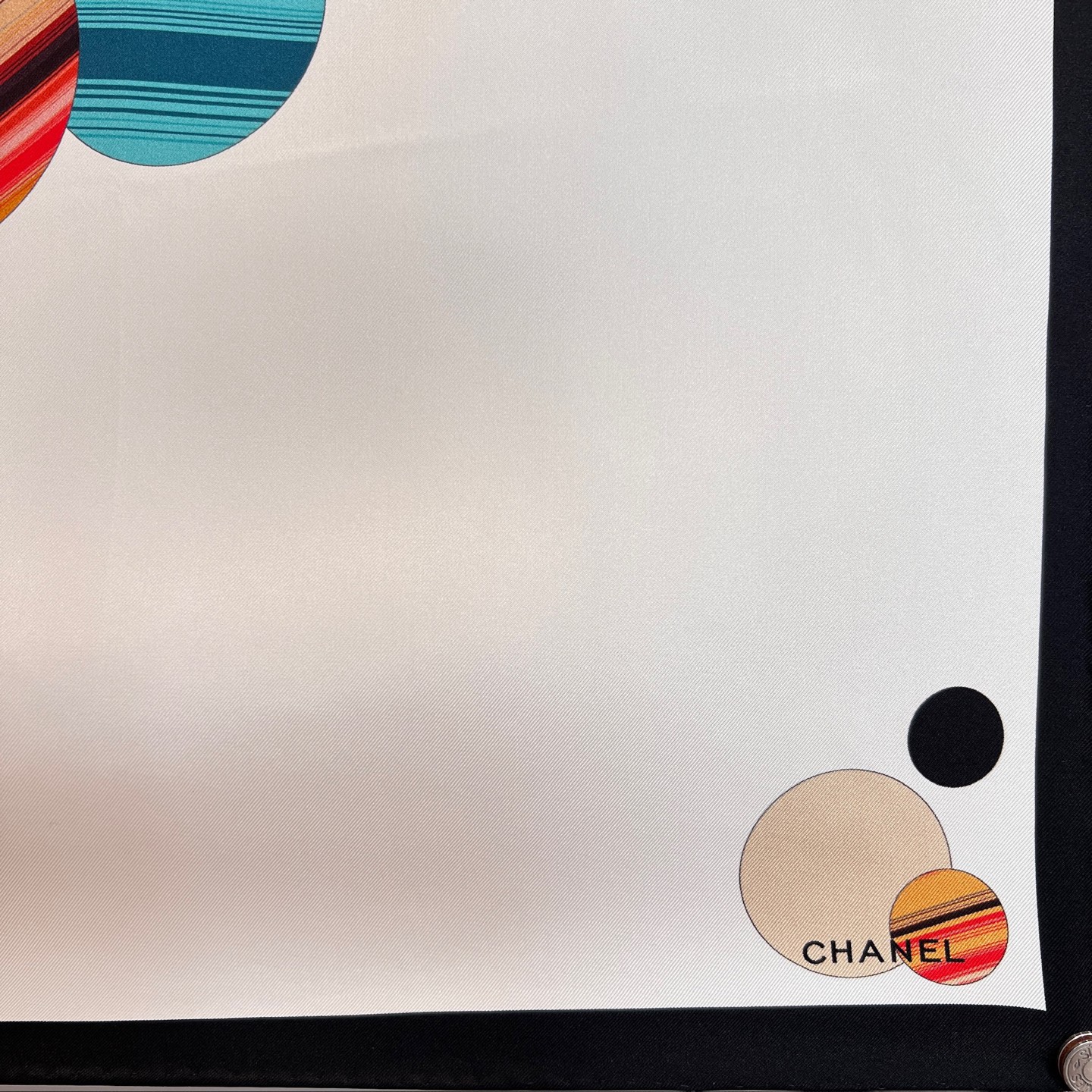 這款絲巾一拿到真的會被它的細節吸引。經典黑白基底搭配標誌性的雙C元素,再融入多彩圓形圖案,整體視覺既有層次又不會過於張揚。