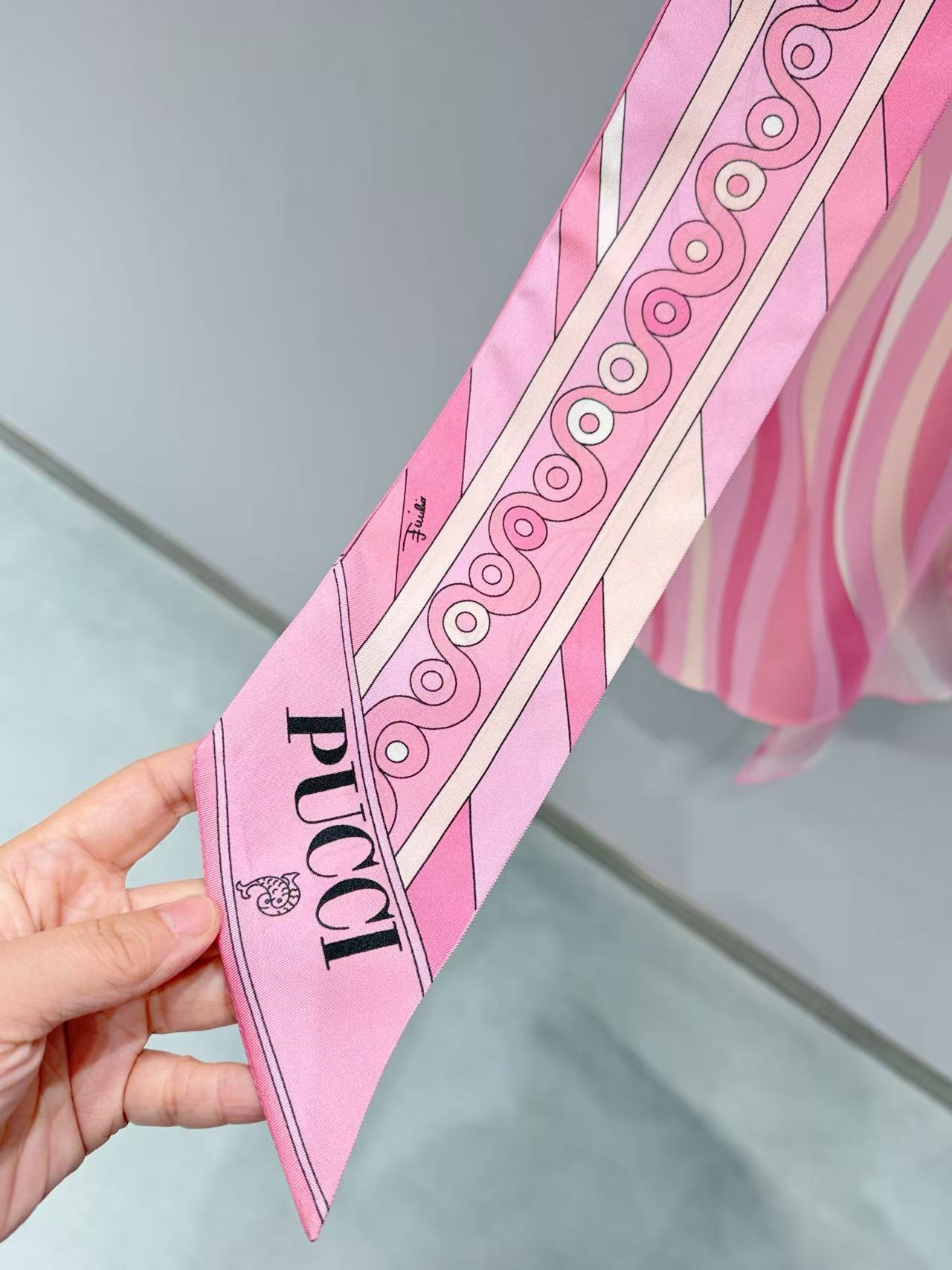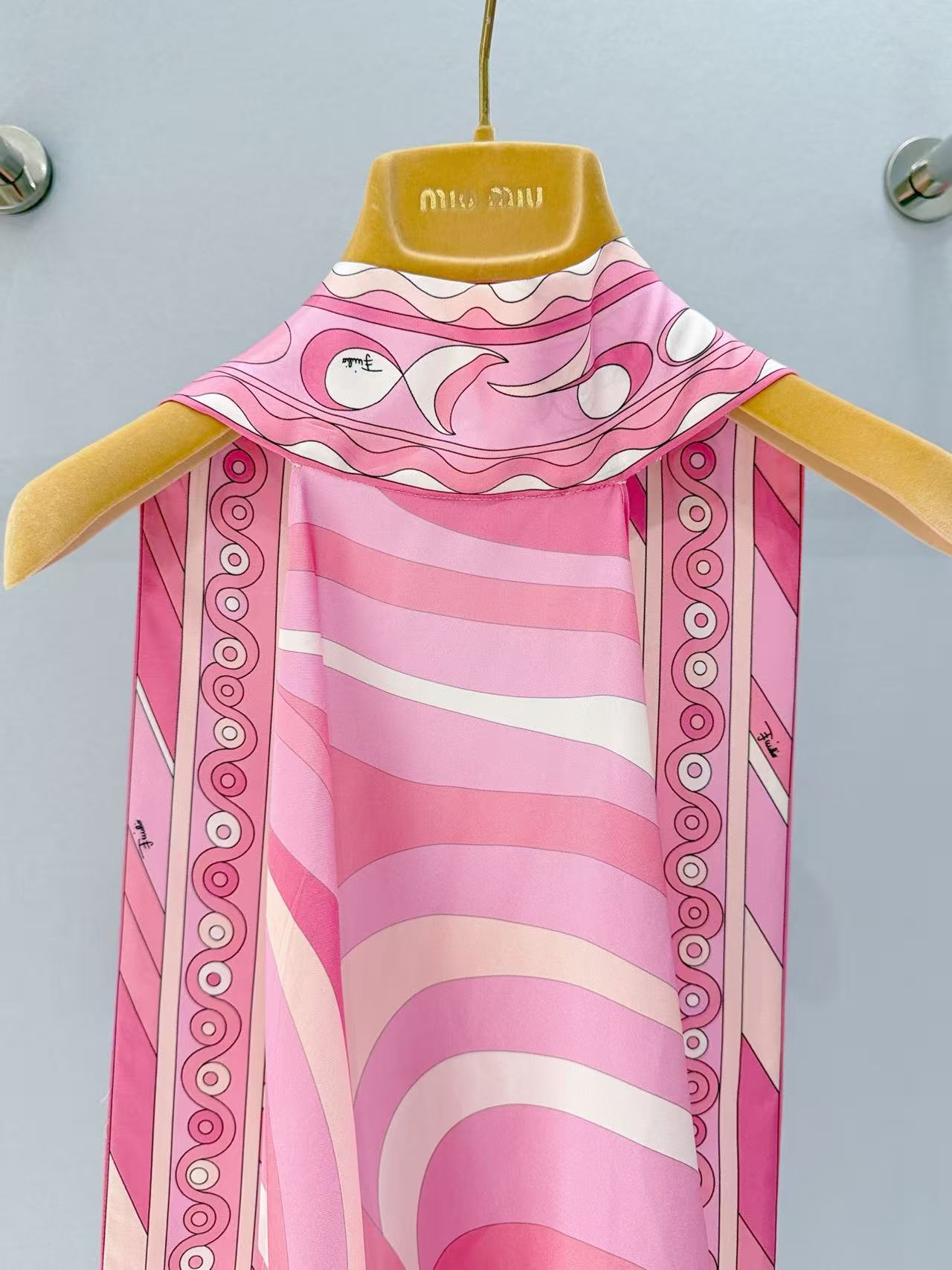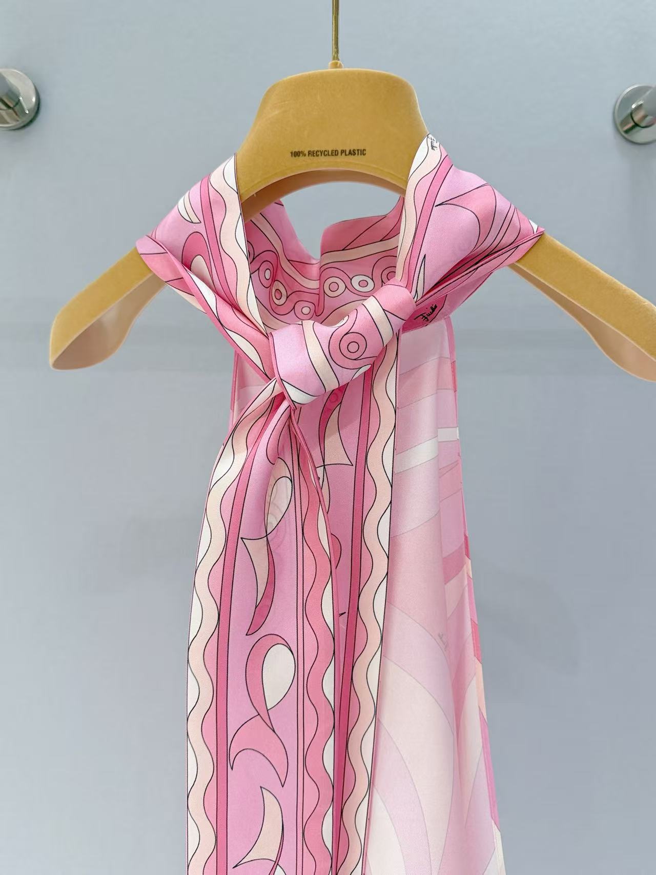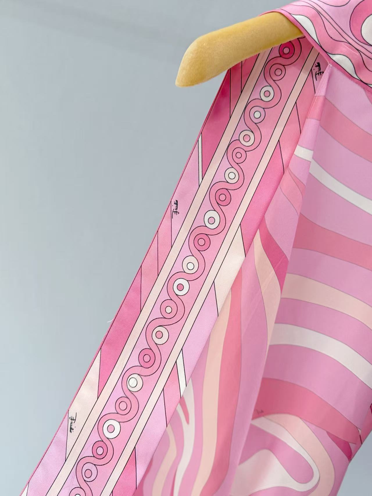 標誌性幾何漩渦噴繪: 採用高精密數位印染技術,將粉、橘、白相間的圖騰還原得色彩飽滿。印花色彩與絲綢光澤完美融合。
