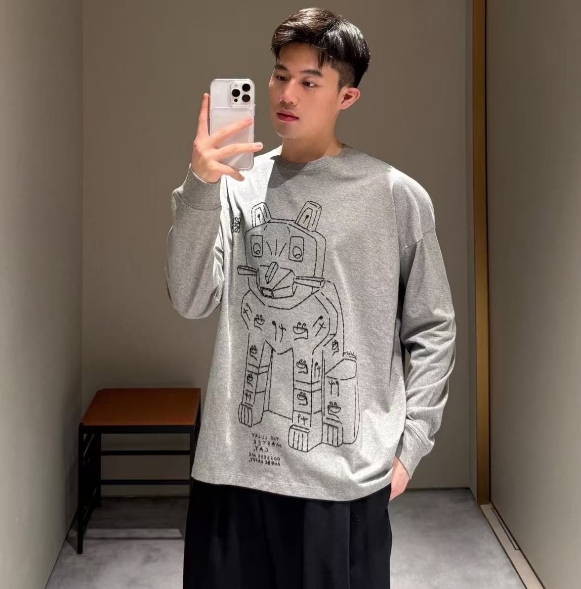 長袖棉質版型: 經典的圓領長袖 T 恤版型,版型修飾度高,適合早秋單穿或秋冬內搭。