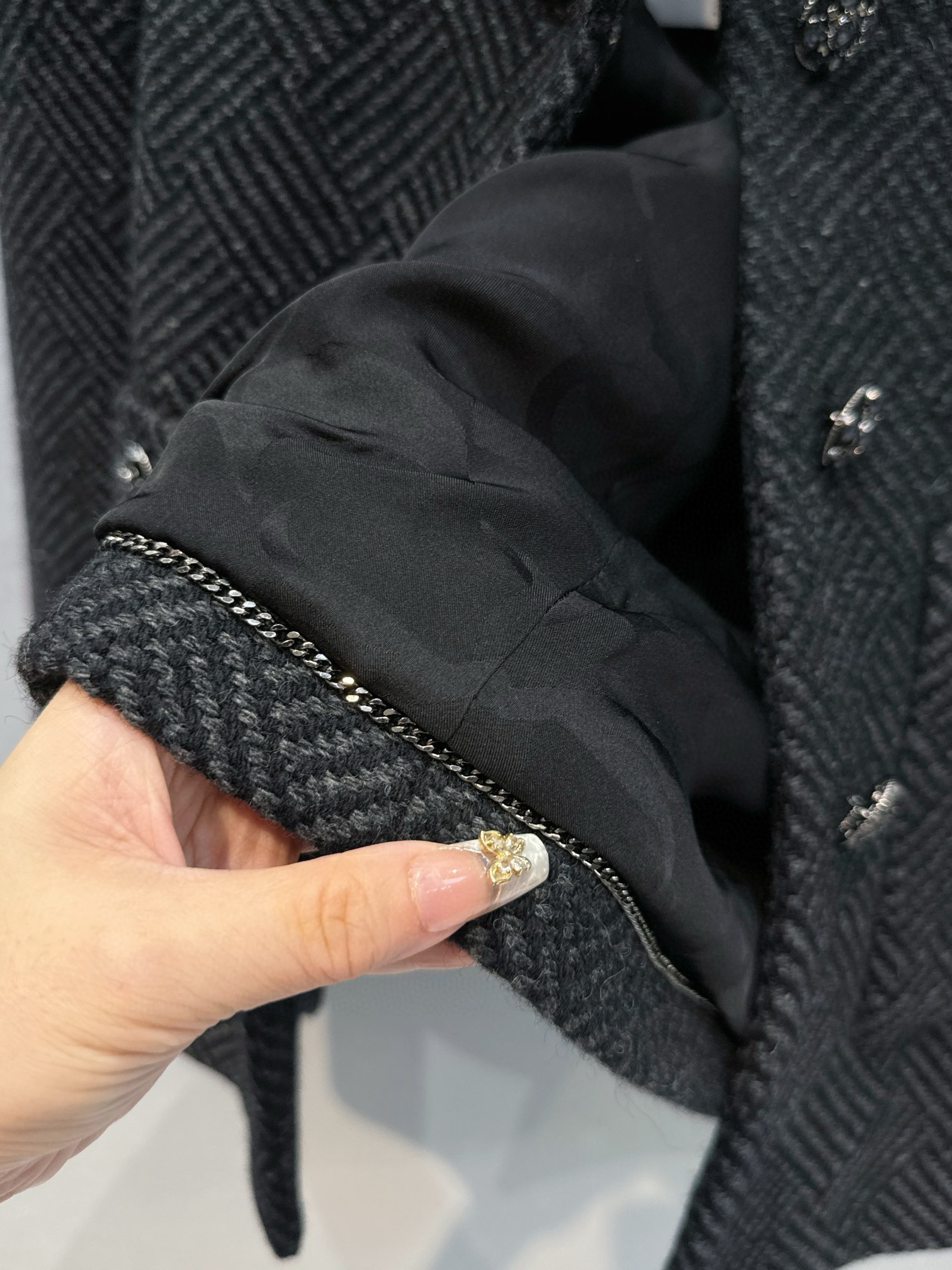 • 頂級面料:選用頂級綿羊毛斜紋粗花呢,觸感紮實有型,穿上即刻展現優雅氣質。
