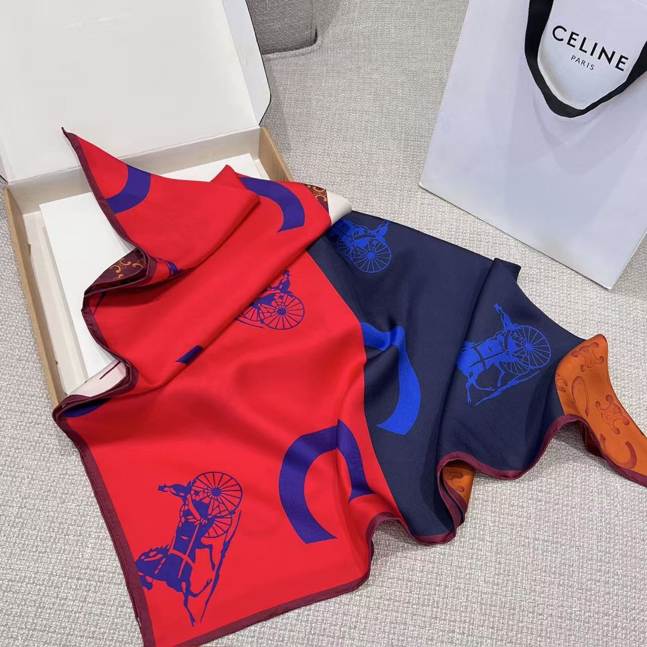 在 Hedi Slimane 掌舵下的品牌,始終致力於挖掘品牌創始人 Céline Vipiana 那份深植於馬術世界的先鋒精神。這次分享的 2026 春夏(26SS)旗幟絲巾,以經典的藍黃撞色演繹出極具張力的幾何美學。