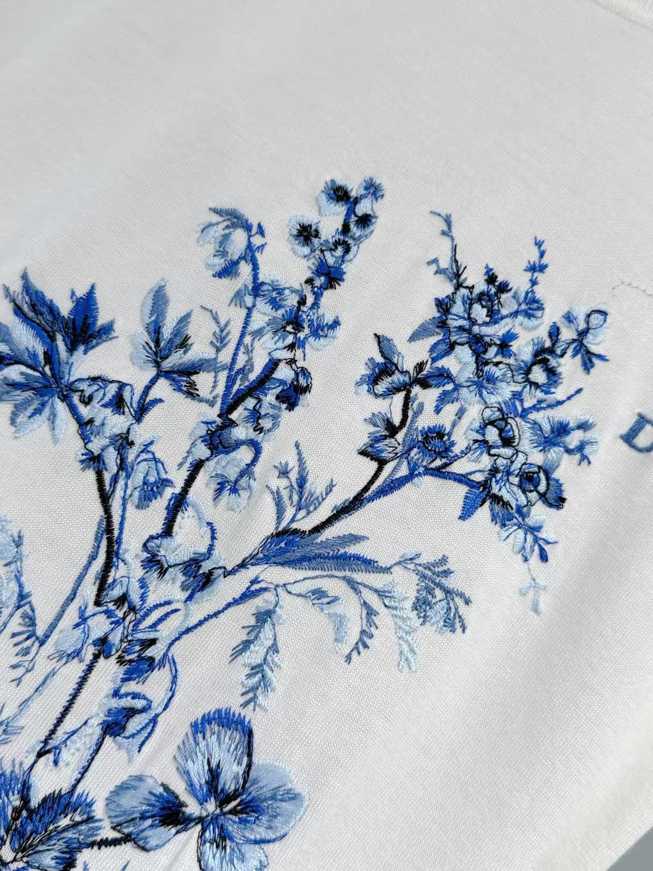 高密度青花電繡工藝: 正面的花卉與蝴蝶圖騰採用了極高密度的電繡技術,色彩過渡自然,完美還原了青花瓷那種「濃淡相宜」的墨韻感。刺繡平整細膩,內裡完全不刺癢肌膚。