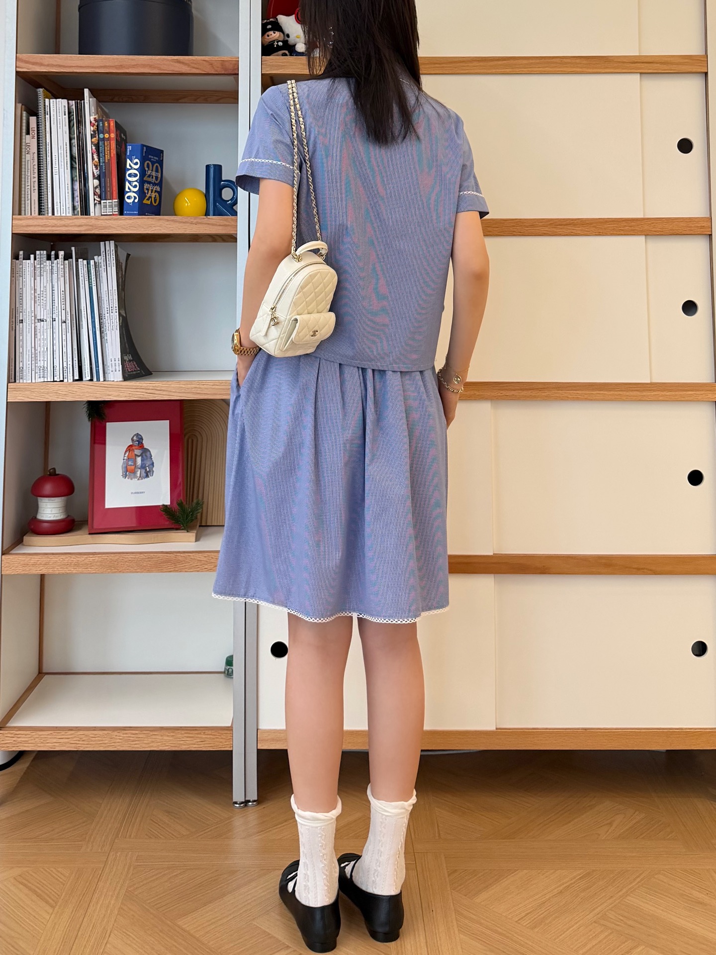 經典藍白格紋搭配柔和色調,視覺上非常舒服,同時也帶出滿滿的學院風氛圍,減齡效果很有感,但又不會過於幼稚,剛剛好的甜美與氣質。