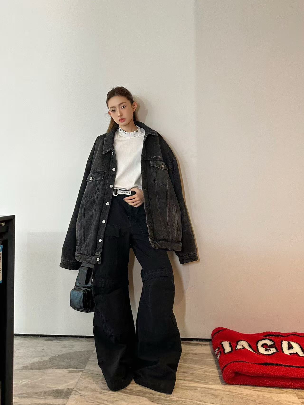材質:高品質黑色環錠紗牛仔布,經過多重洗水與做舊工藝,布面呈現柔和的復古色澤,同時保留牛仔的耐磨與結實特性。內裡填充棉料,保暖又不厚重,秋冬換季穿正好。