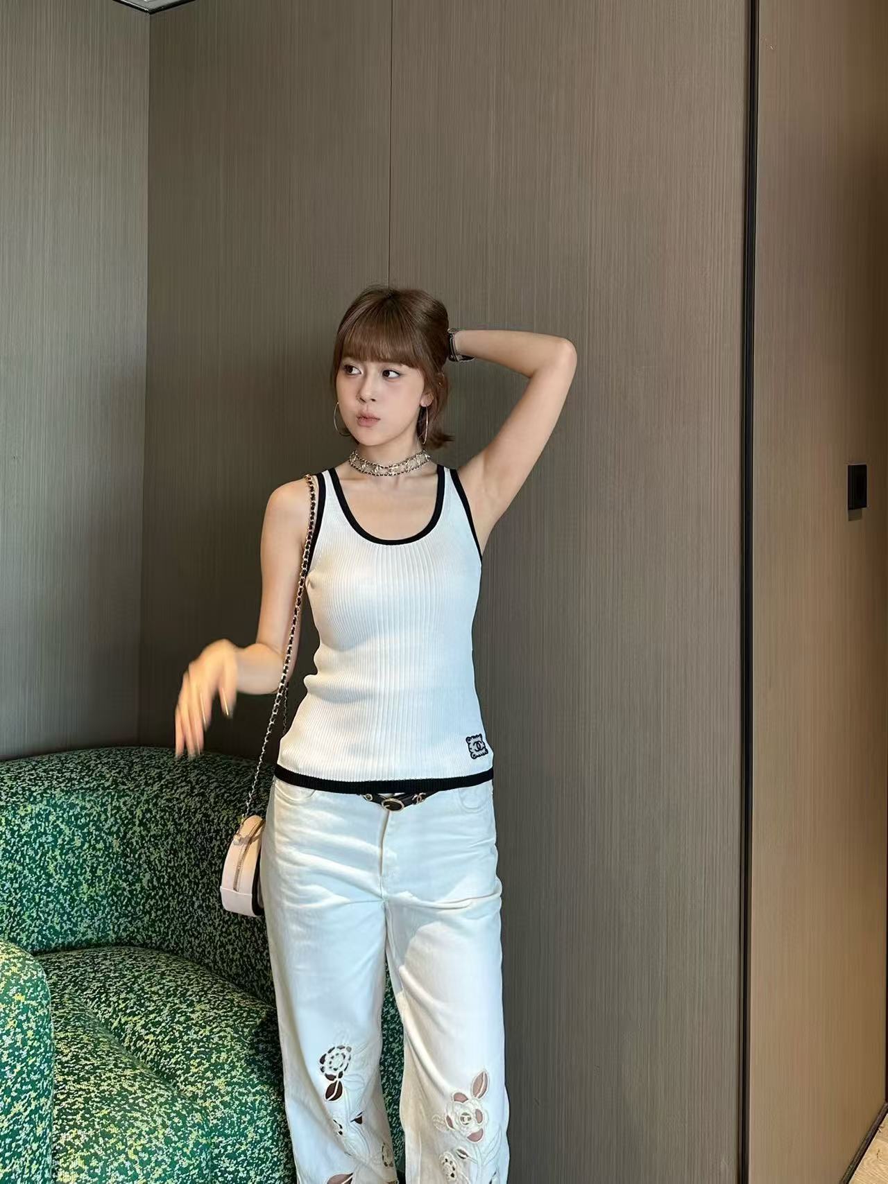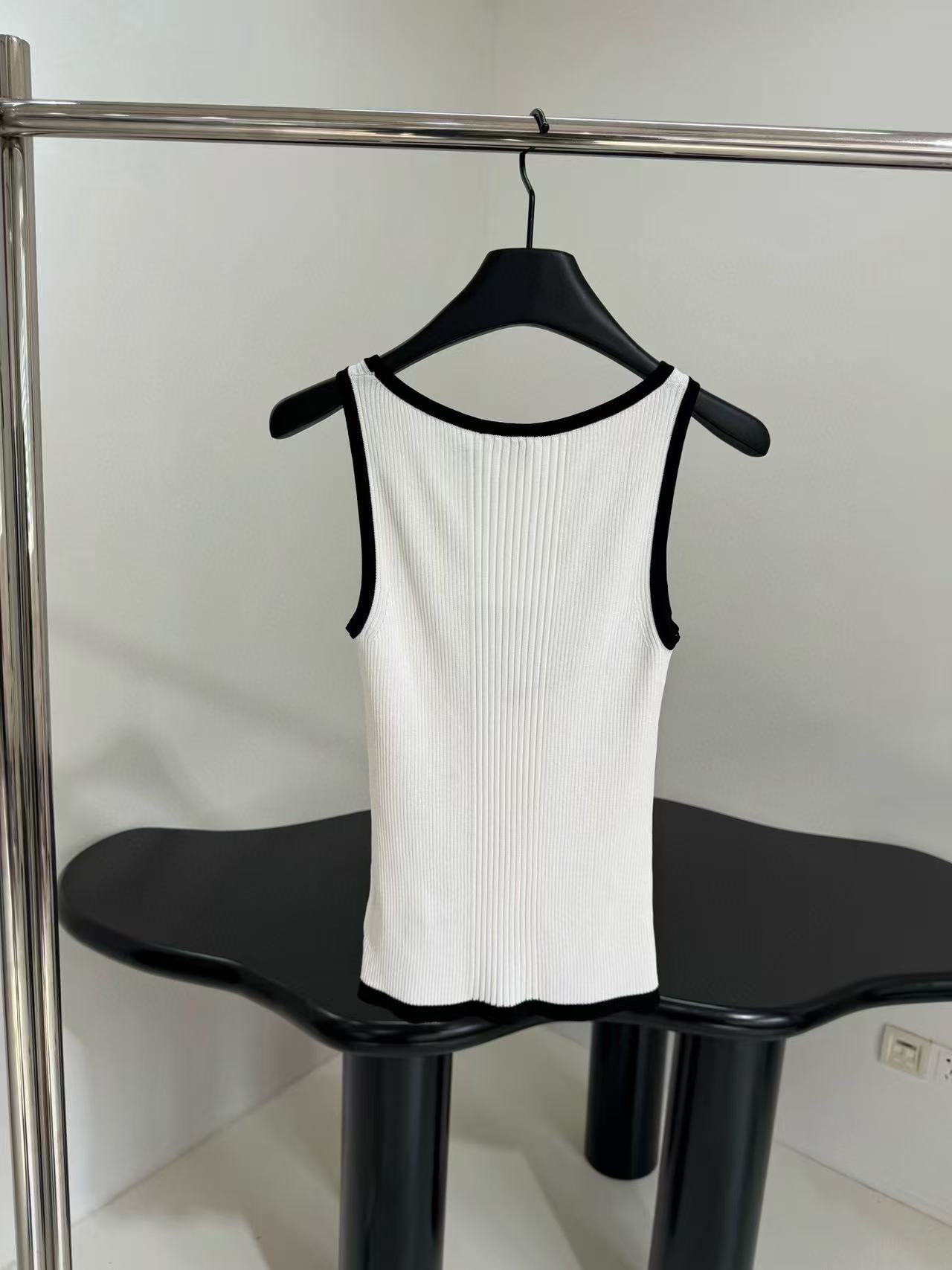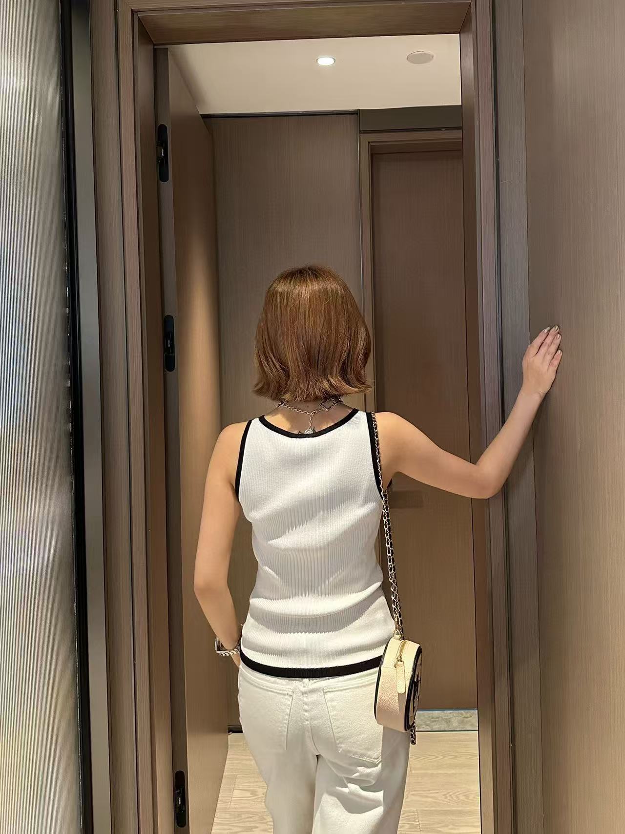 撞色飾邊:背心採用了經典的黑白撞色飾邊,這個設計不僅充滿了標誌性風格,也讓整件衣服看起來更加精緻、俐落。