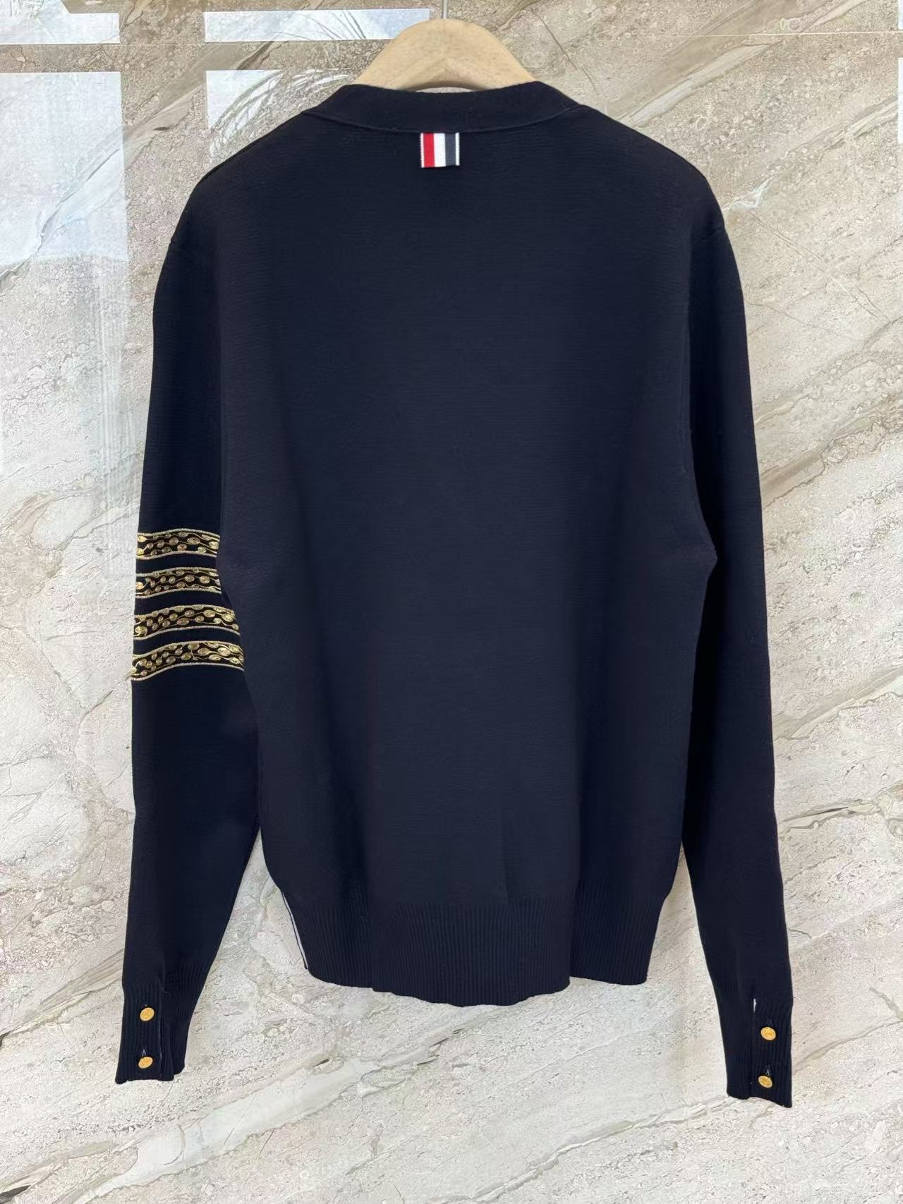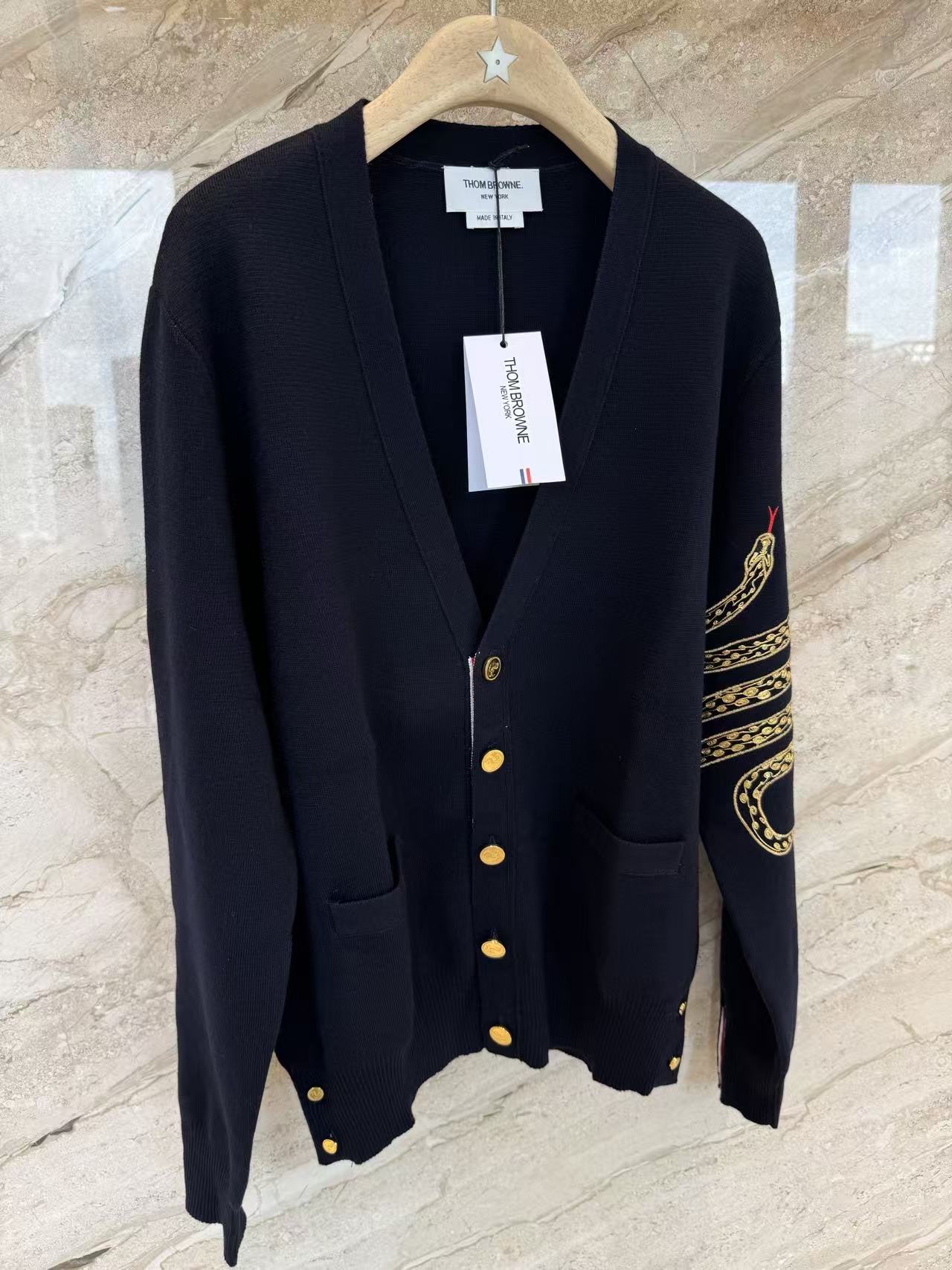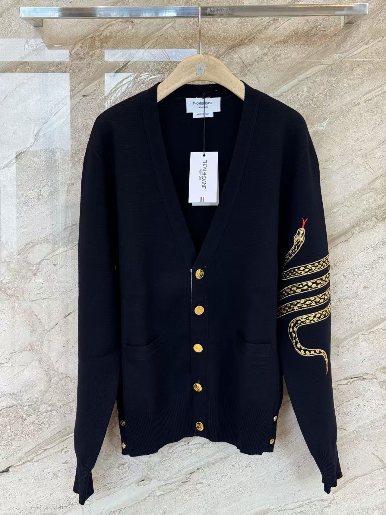 蛇年圖案:開衫巧妙地融入了蛇年的限定元素,將充滿設計感的蛇形圖案以精緻的刺繡或提花工藝呈現在羊毛衫上。這個設計不僅充滿了節日氛圍,也讓經典的 TB 開衫多了一份個性和收藏價值。