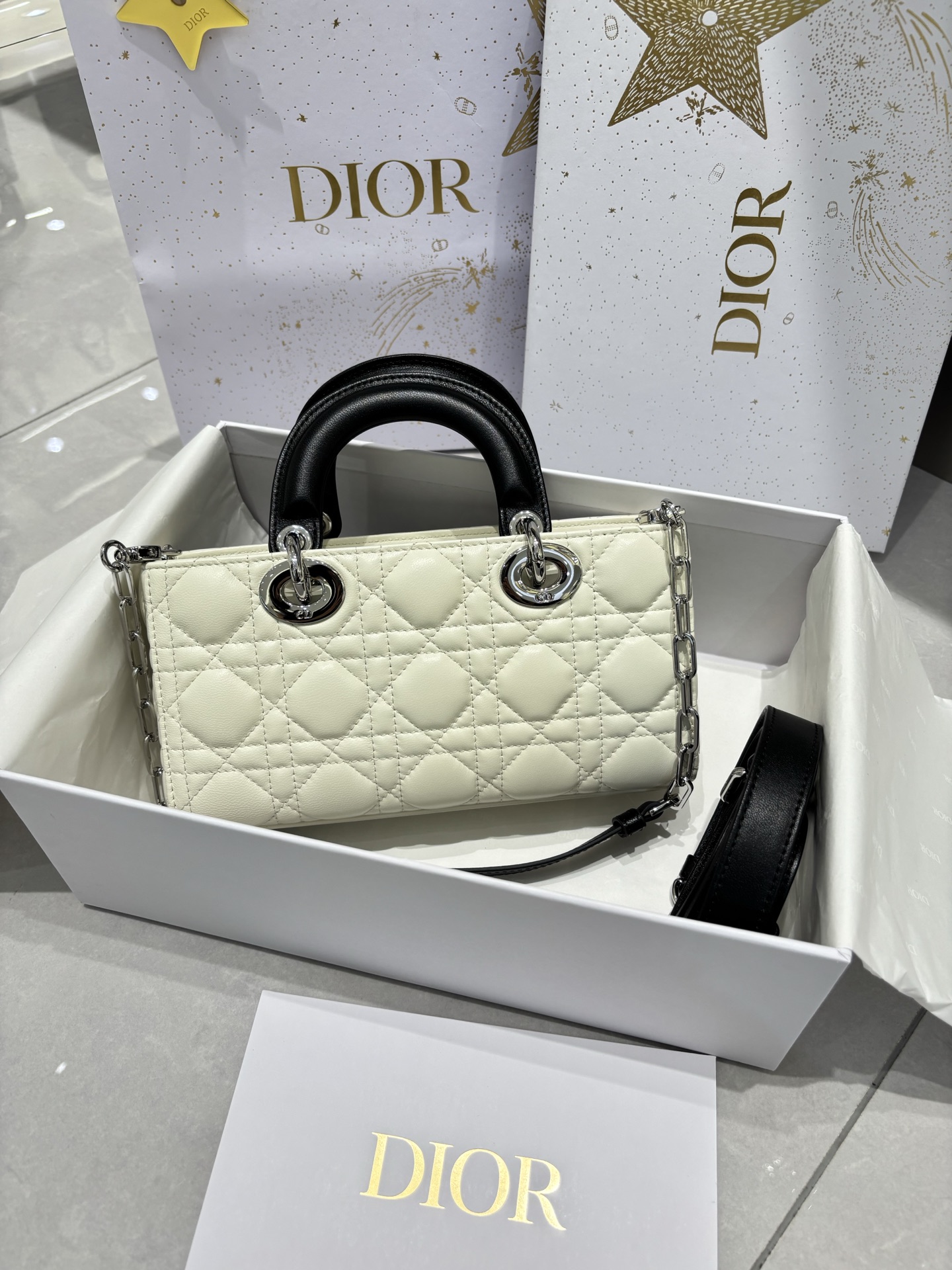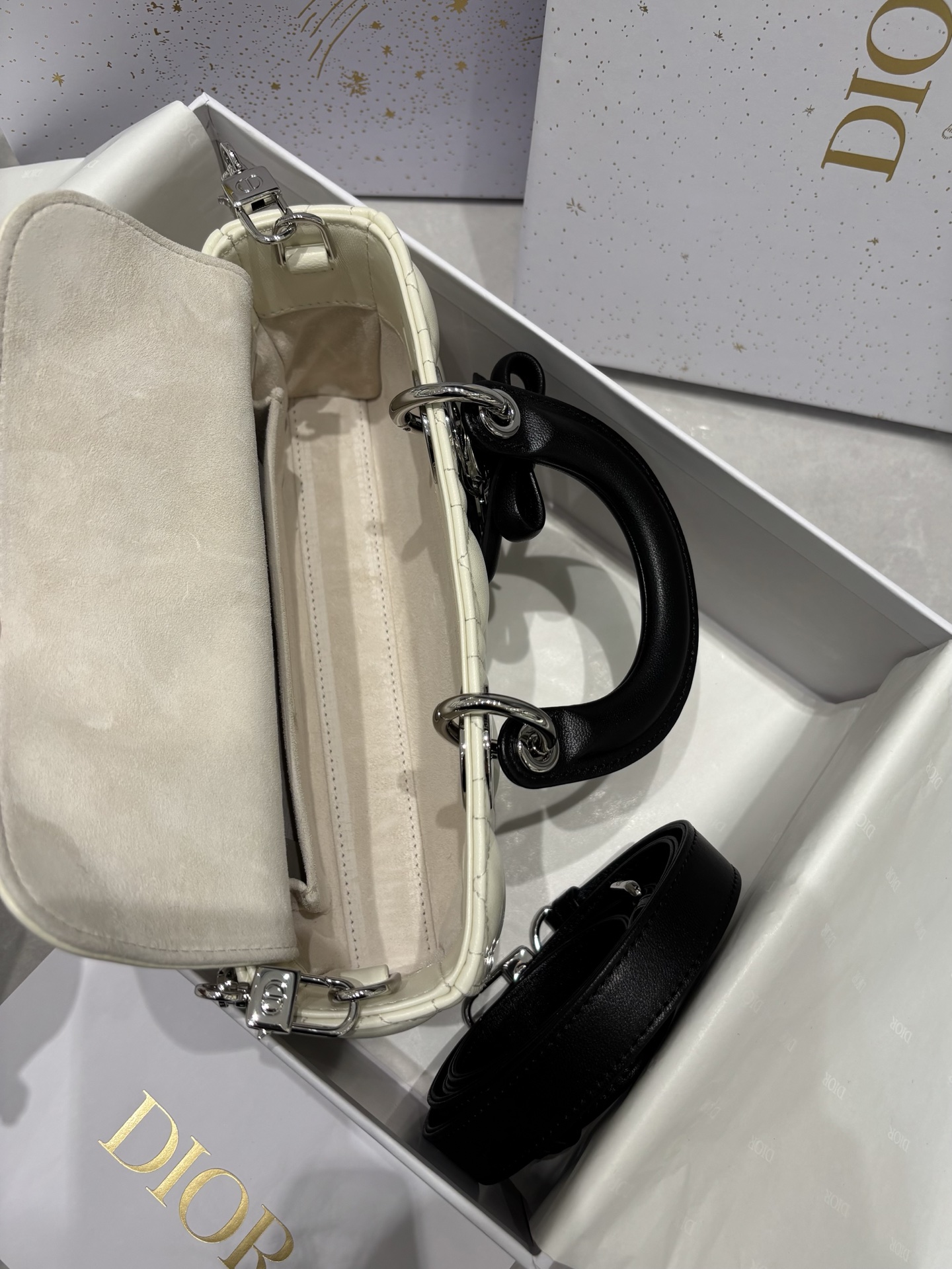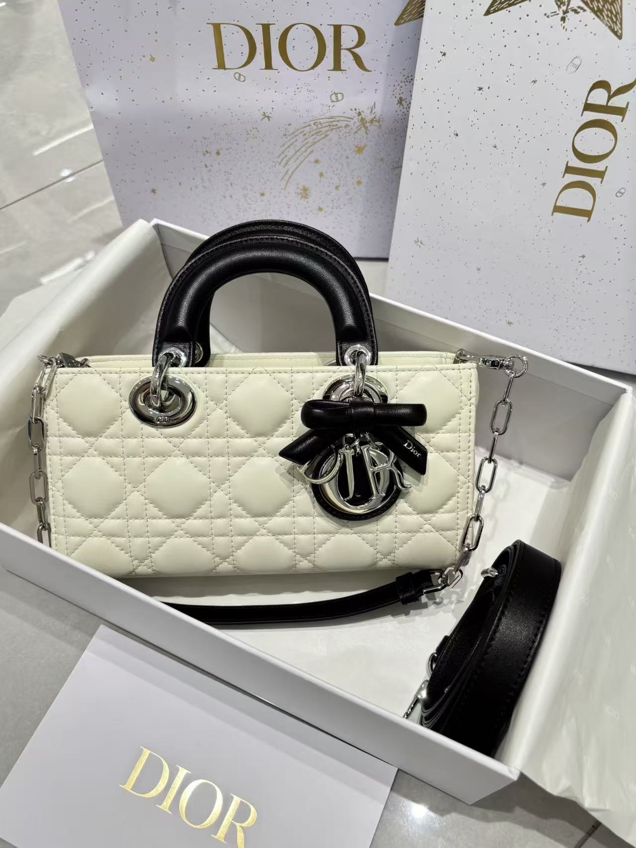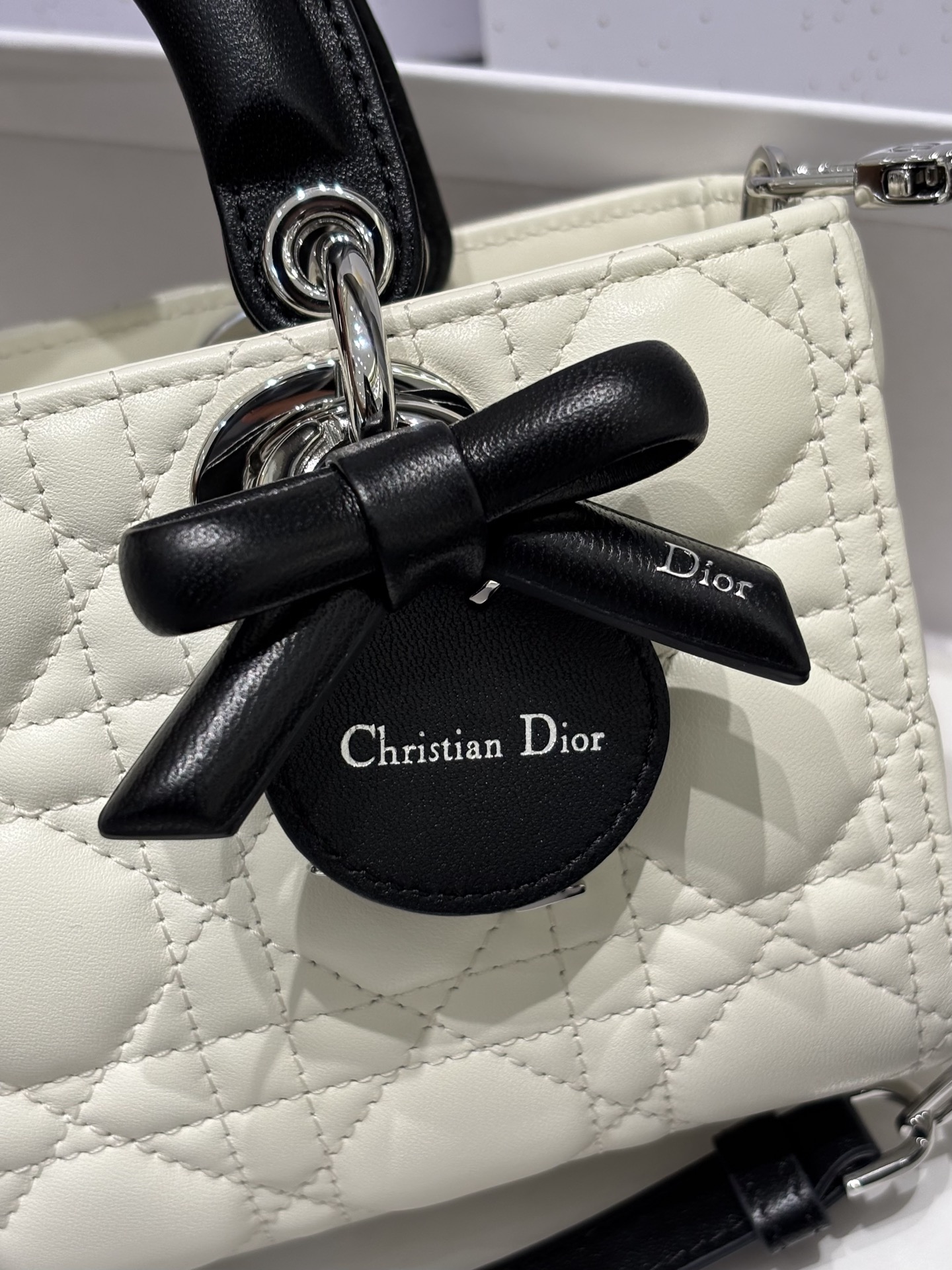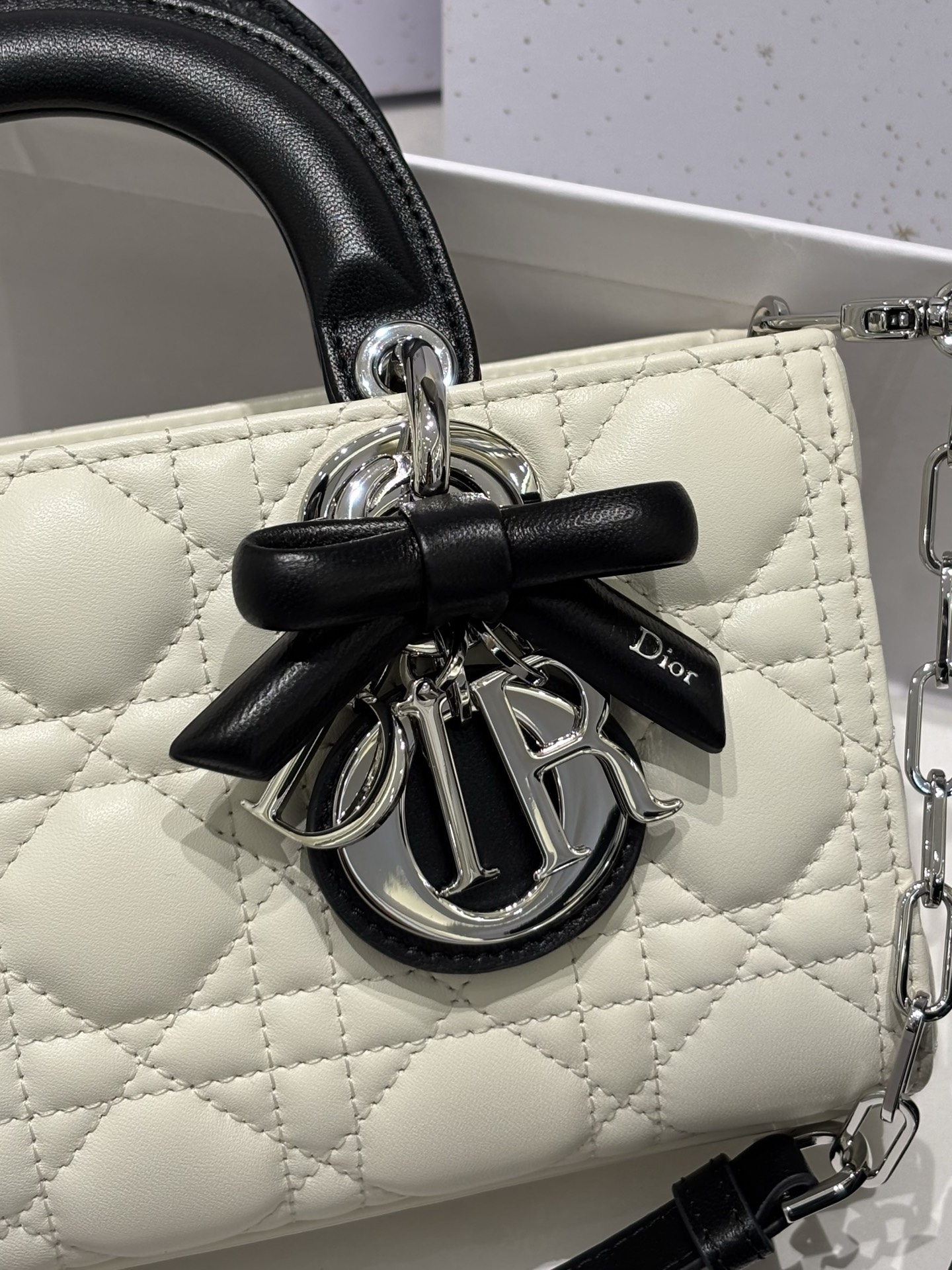 奶白拼色的D-joy小號包,這次推出更精緻的小尺寸,整體比例更俐落,也更有時髦感。