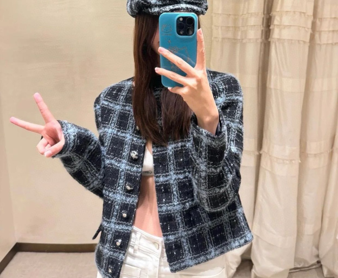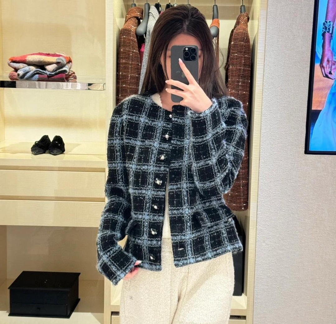 2024秋冬新品 C家格子黑藍配色軟呢外套