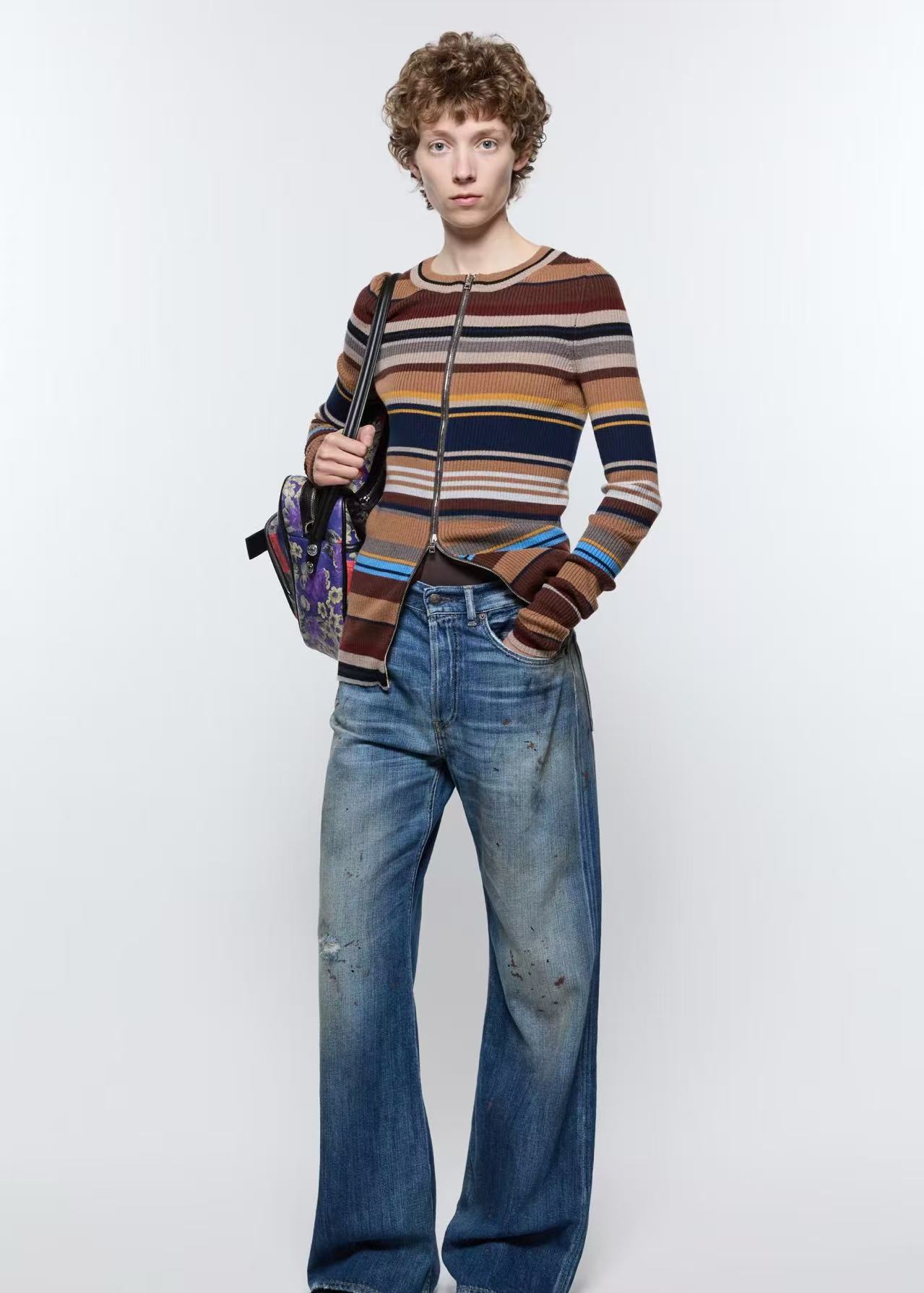 整條褲子採用了層次極其豐富的髒染做舊與破洞工藝,搭配獨特的水洗褶皺設計,細節感直接拉滿。