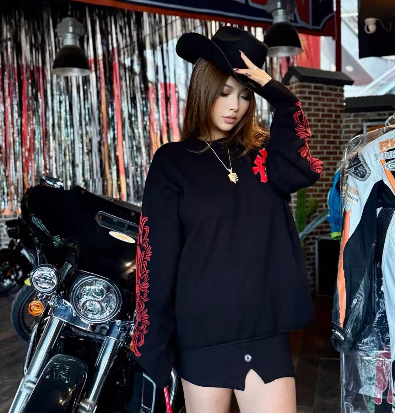 最令人驚豔的細節在於鮮紅色的皮革十字架貼飾,與衣身織紋形成強烈的異材質碰撞,賦予了這件針織衫鮮明的層次感。