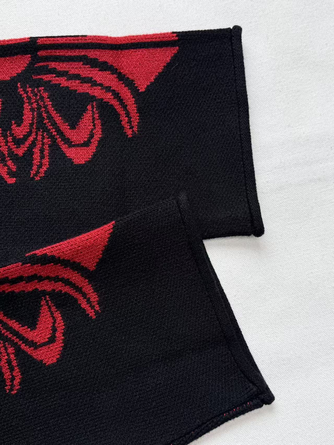 視覺衝突的叛逆交響:十字架紅色皮標撞色提花針織衫