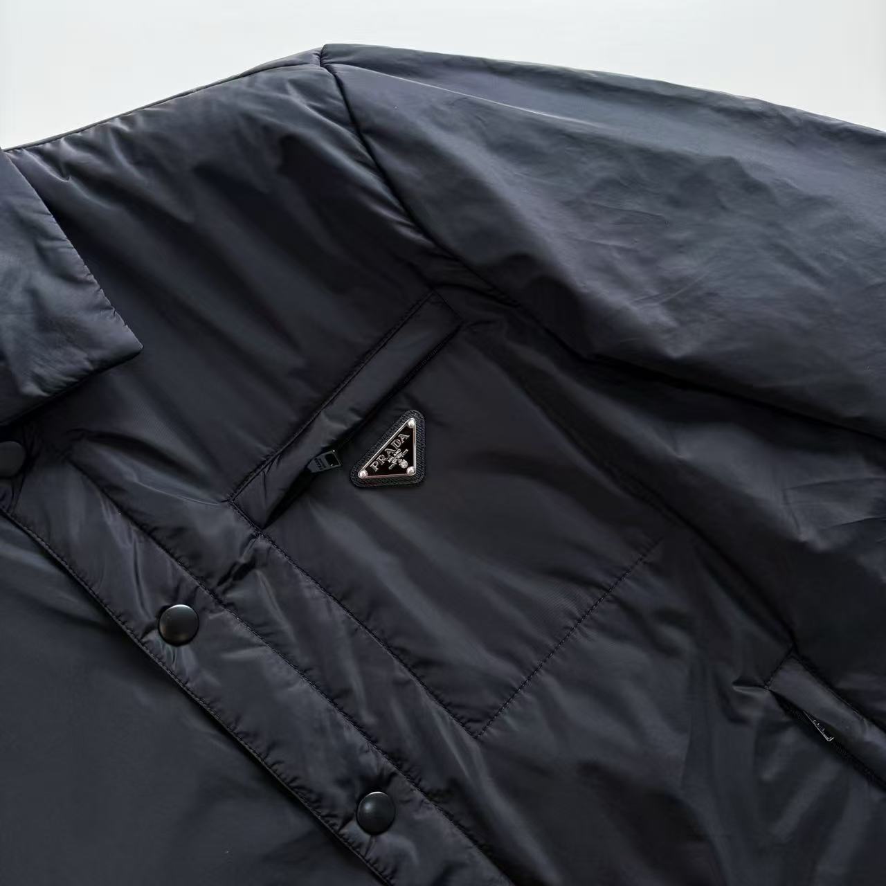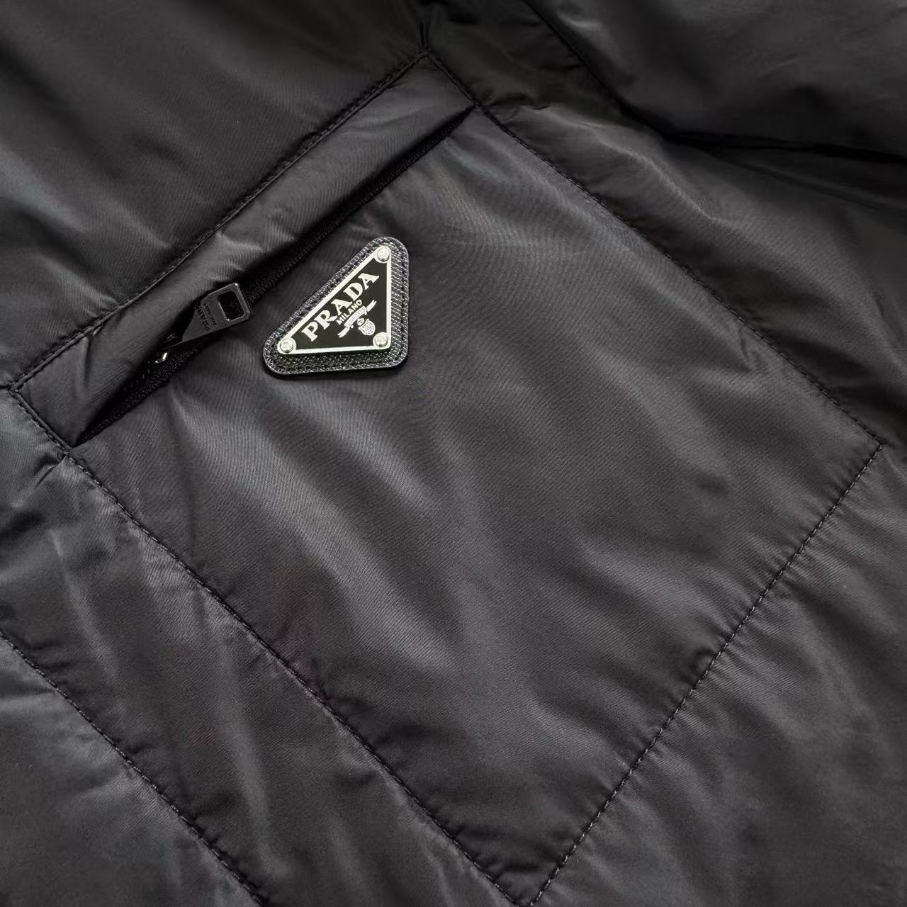 刻字拉鍊:口袋使用了 Prada 刻字拉鍊,這種五金細節的處理,完美地體現了品牌的精緻工藝。