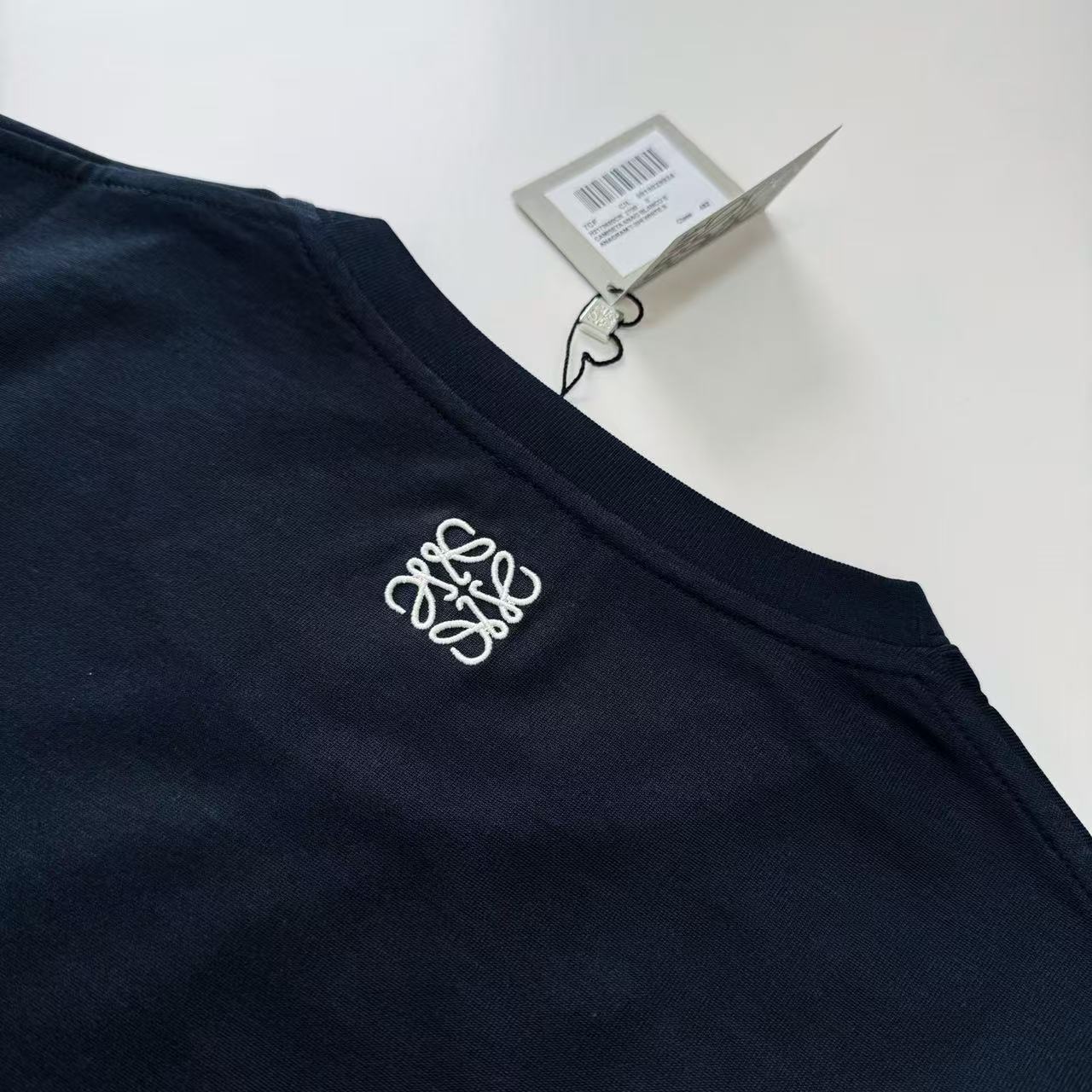 翻到背面,品牌標誌性的 Anagram 則以立體刺繡呈現,針腳間距與曲線精準還原,飽滿且清晰。搭配兼具真絲觸感的絲光棉材質,讓這件短 T 在視覺張力與穿著體感之間,達成了堪稱完美的平衡。
