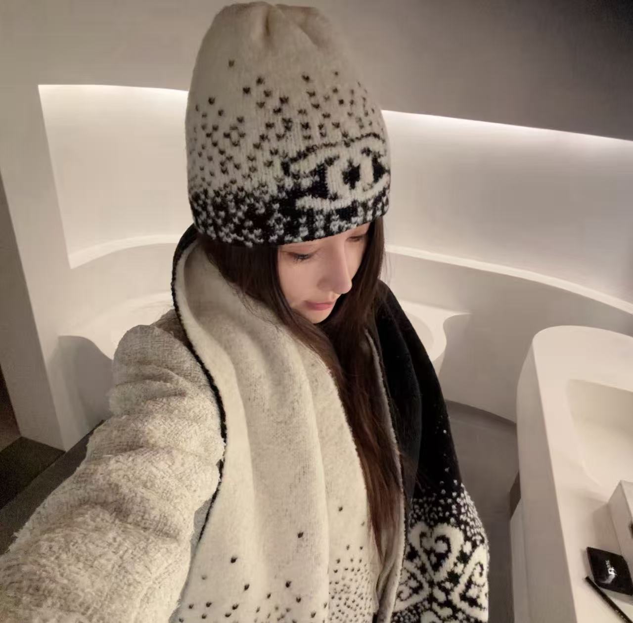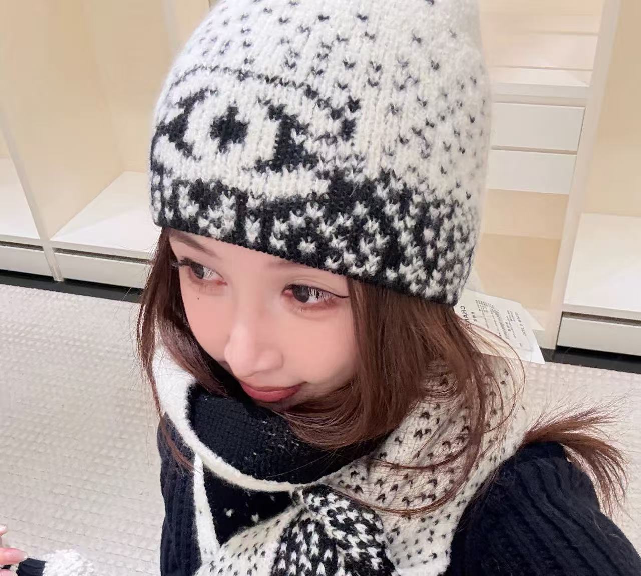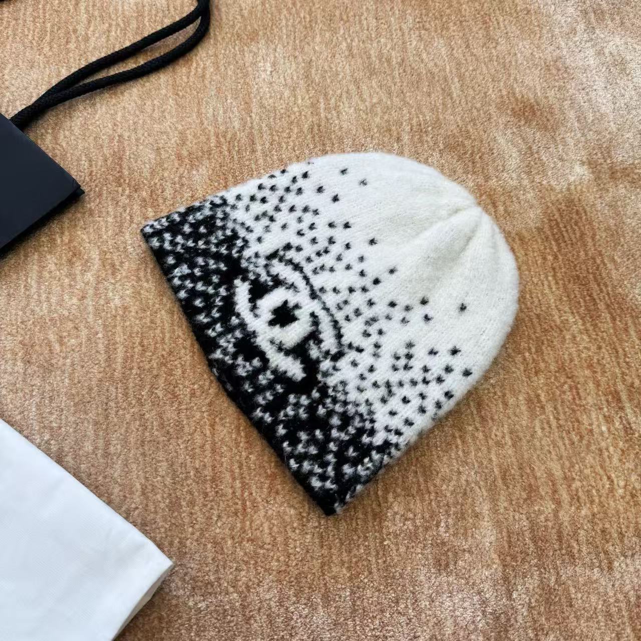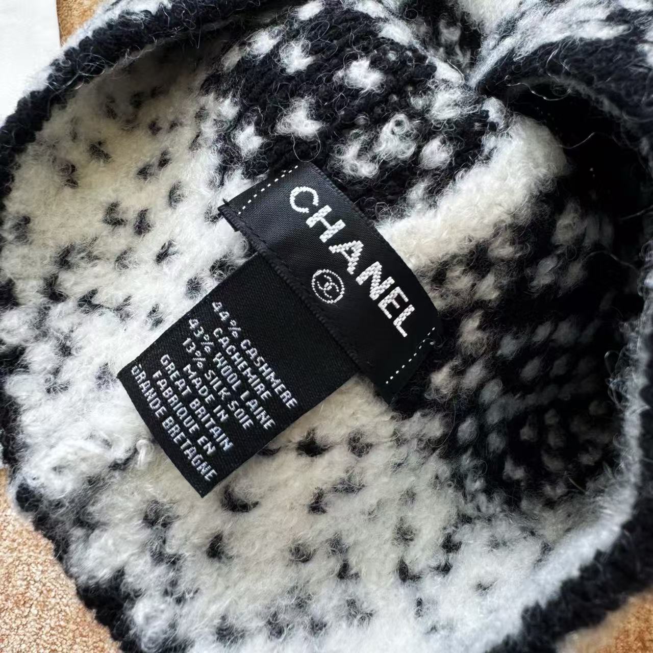 這頂根本是「把雪山貴婦直接戴在頭上」的夢幻神器,遠看就是一頂低調黑白毛帽,近看才發現整頂是7針拔花凹凸格紋+漸變錯位雙C若隱若現,戴上去整個頭型瞬間變精緻小臉,貴到讓路人自動幫你讓路~