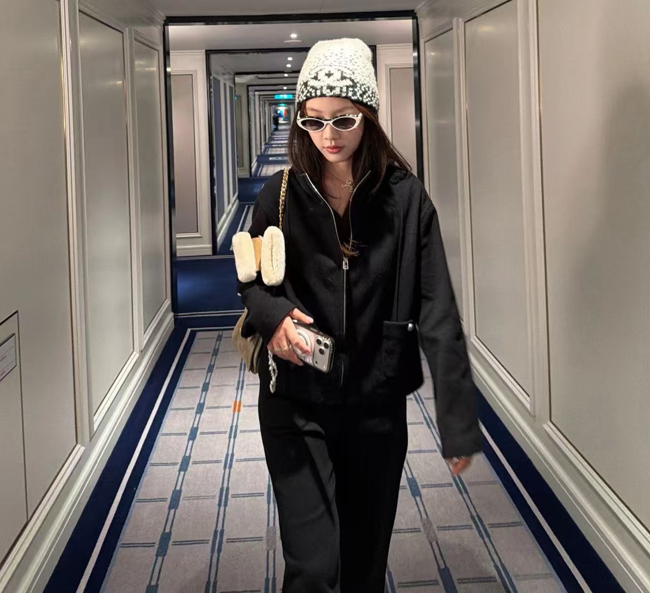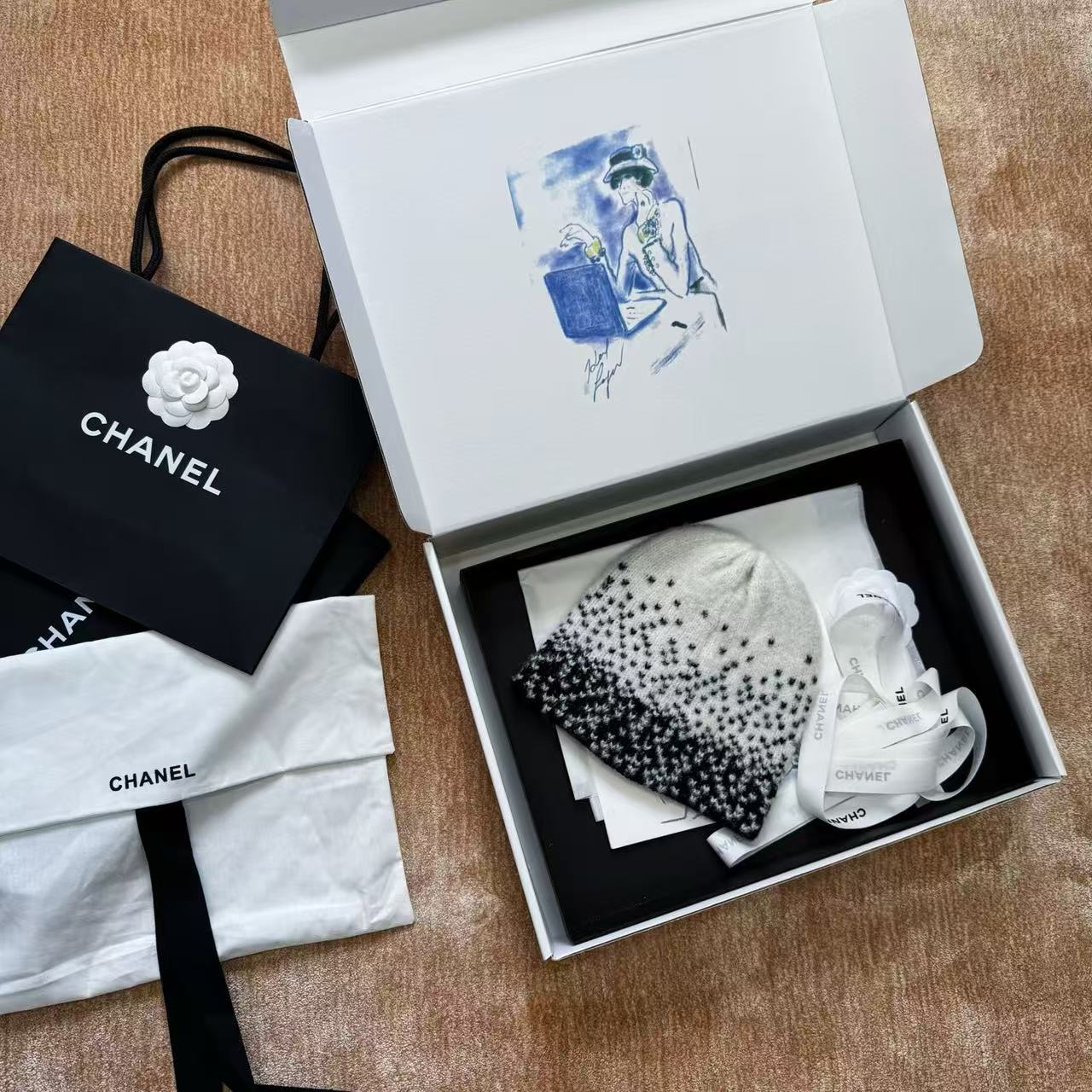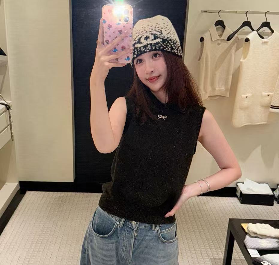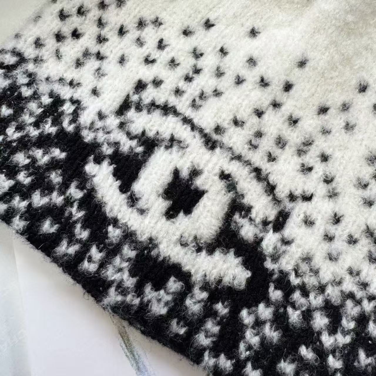 這頂根本是「把雪山貴婦直接戴在頭上」的夢幻神器,遠看就是一頂低調黑白毛帽,近看才發現整頂是7針拔花凹凸格紋+漸變錯位雙C若隱若現,戴上去整個頭型瞬間變精緻小臉,貴到讓路人自動幫你讓路~