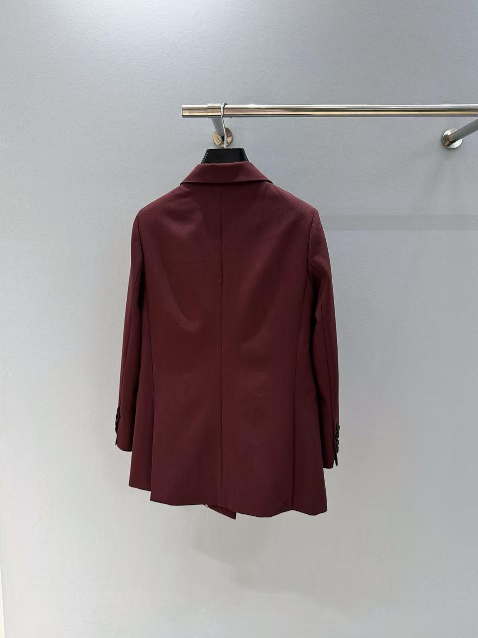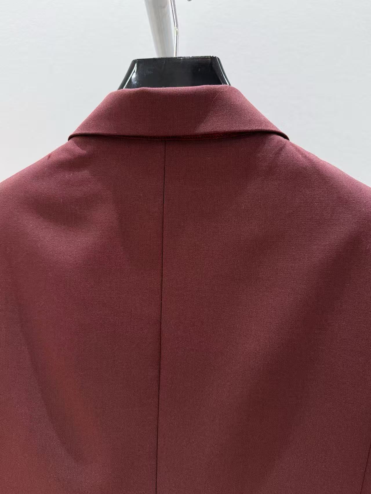 這款西裝一登場,就完美詮釋了所謂的「高級氣場」。正肩廓形設計俐落挺拔,搭配槍駁領與胸前立體剪裁,線條乾淨又極具結構感,讓整體比例更加修長。