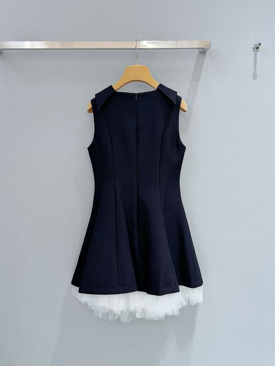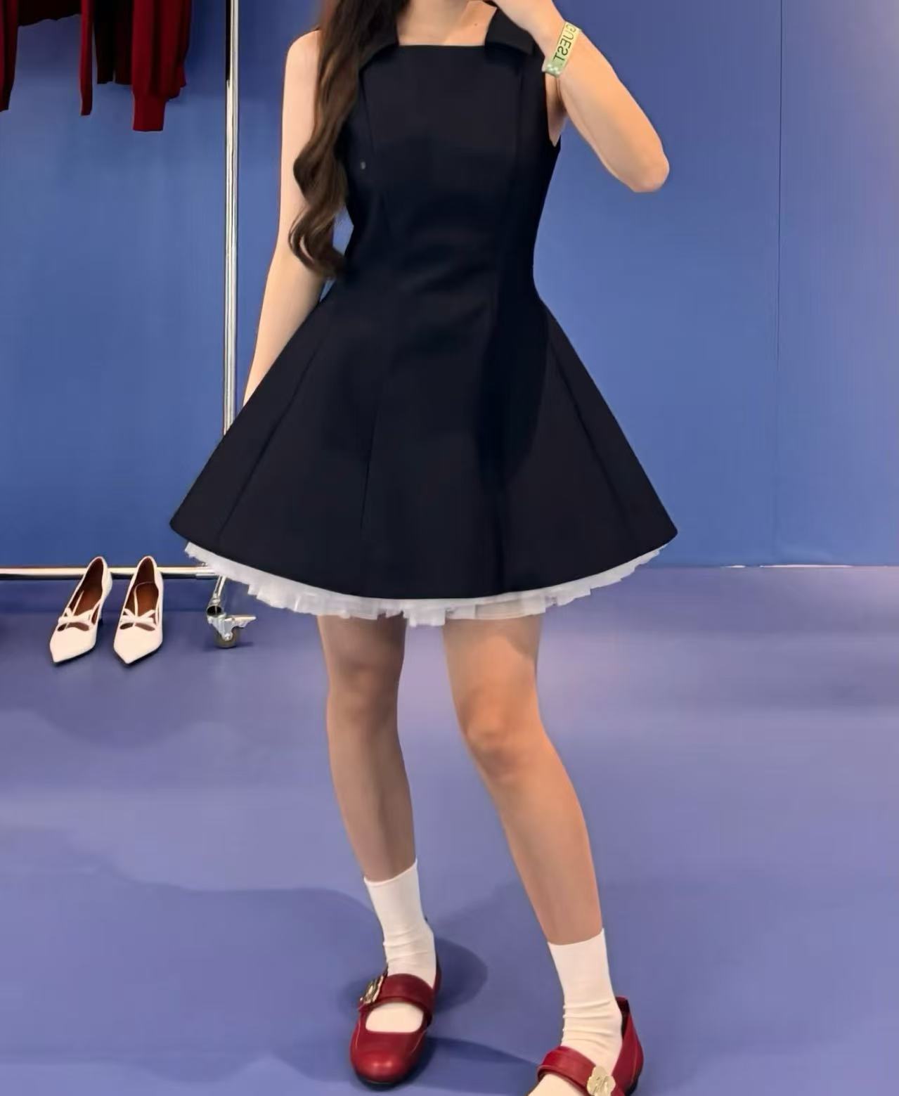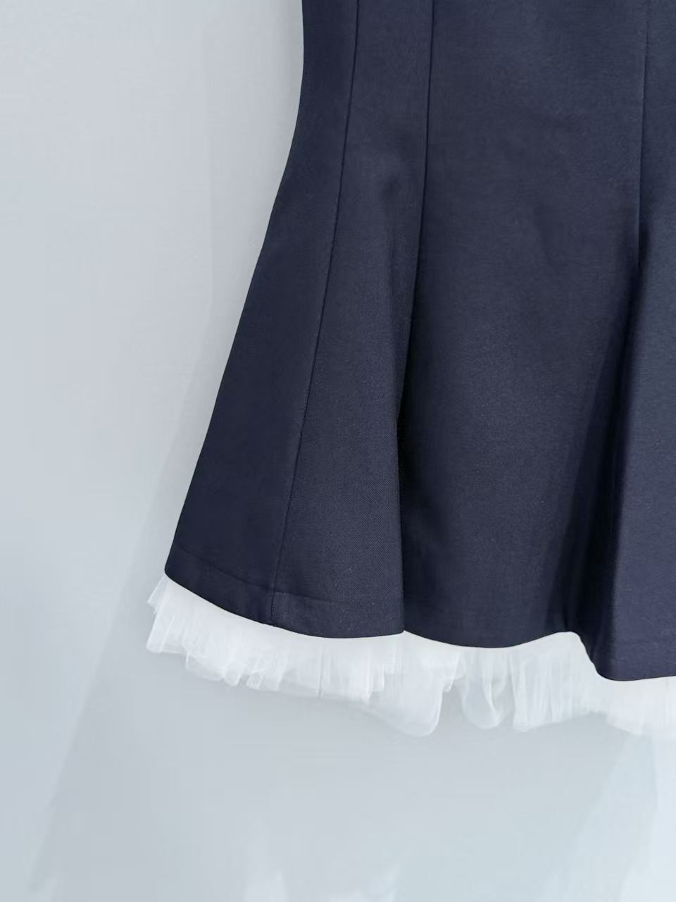 下擺拼接的一層白色細緻薄紗,在挺括的材質下若隱若現,完美平衡了藏青色的沉穩,注入了一份靈動的夢幻感。