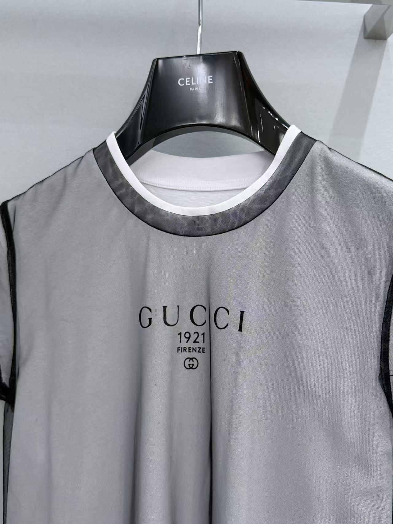 正面印有的「GUCCI 1921 FIRENZE」與雙 G 標誌,在網紗下隱約浮現,質感極佳。