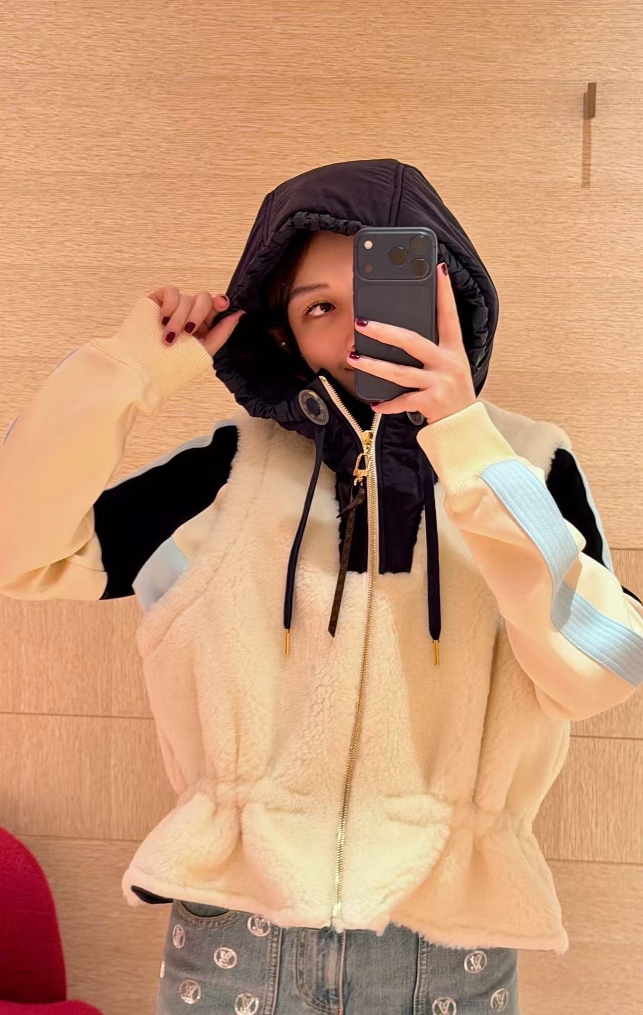 白色主體搭配黑色連帽內襯,設計簡約卻充滿奢華感,金色拉鏈的點綴讓整體細節更加精緻,真的滿分!