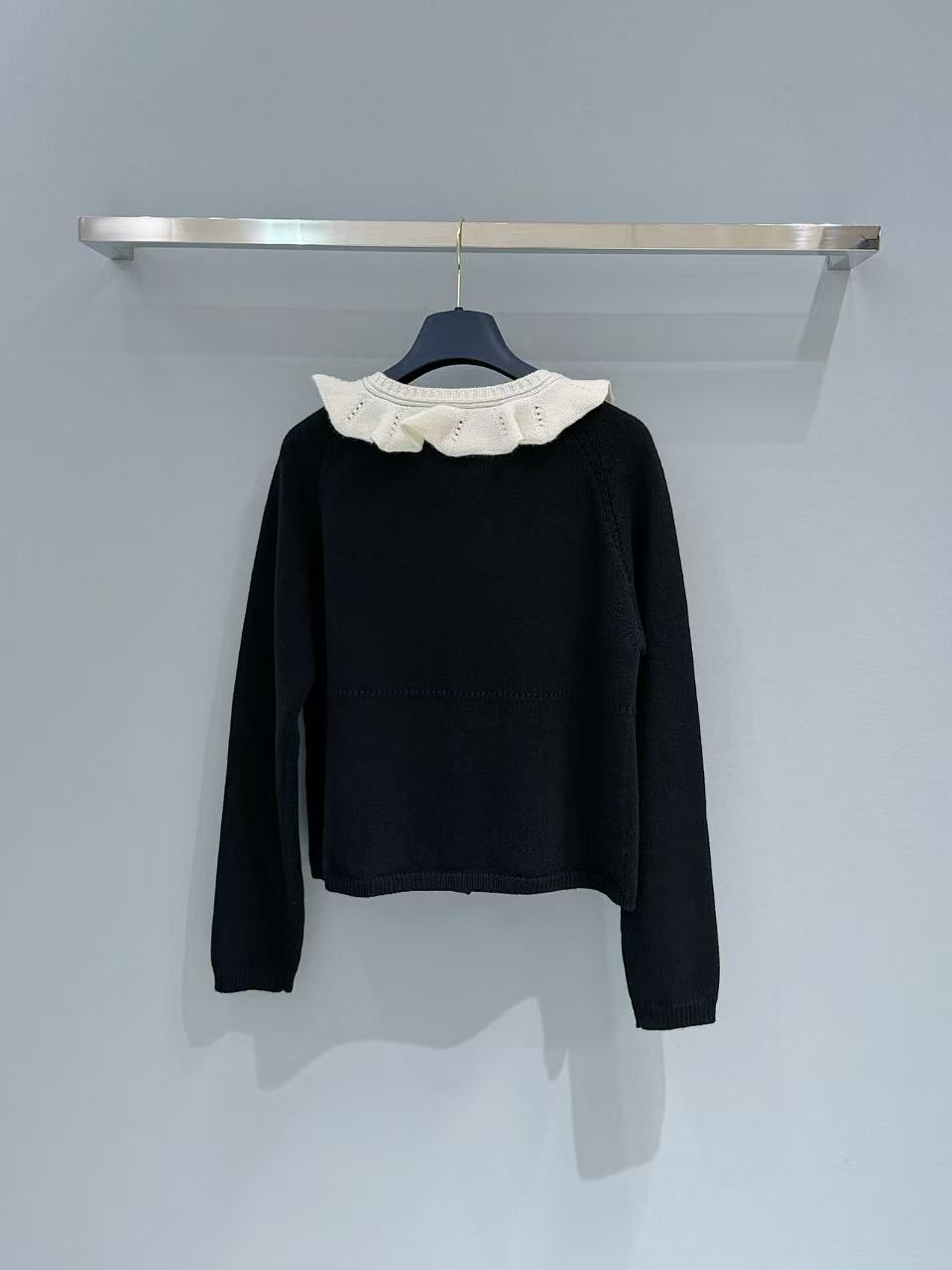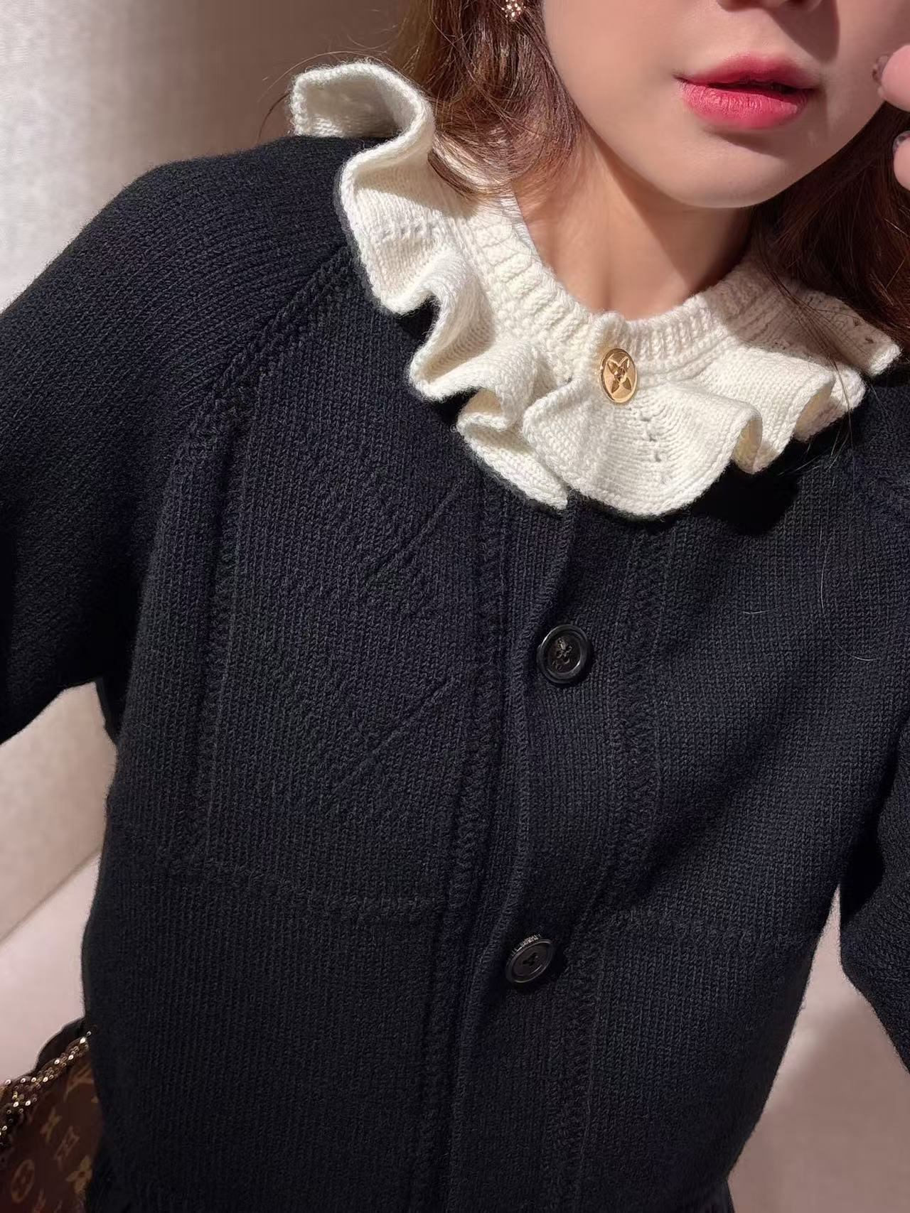 領口那圈奶白色的針織荷葉邊真的太美了,軟綿綿的褶皺帶來滿滿松弛感,再搭配金色 Monogram 紐扣,甜度剛好,不會過頭,瞬間提升整件衣服的精緻度。