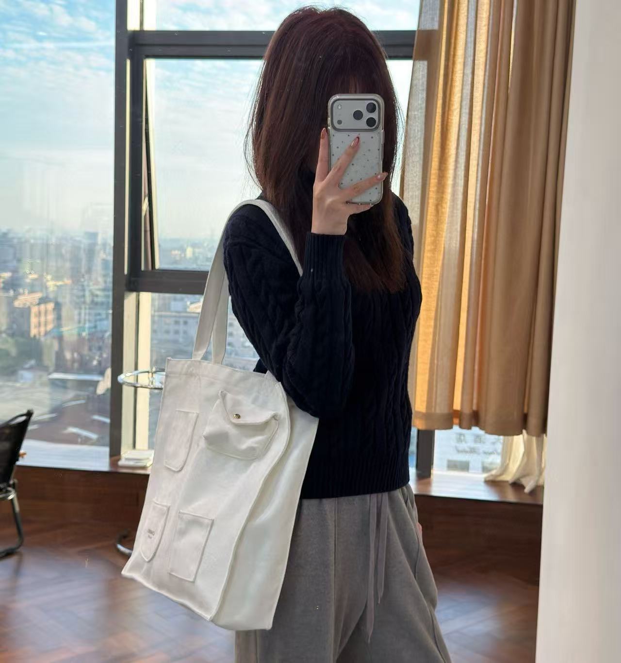 設計亮點:大容量與超強收納力這款托特包將大容量和收納機能發揮到極致,完全是日常通勤和收納的完美幫手:工裝風多口袋設計: 包身直接設計了 4 個不同形狀的外層貼袋,可以輕鬆收納各種隨身小物。