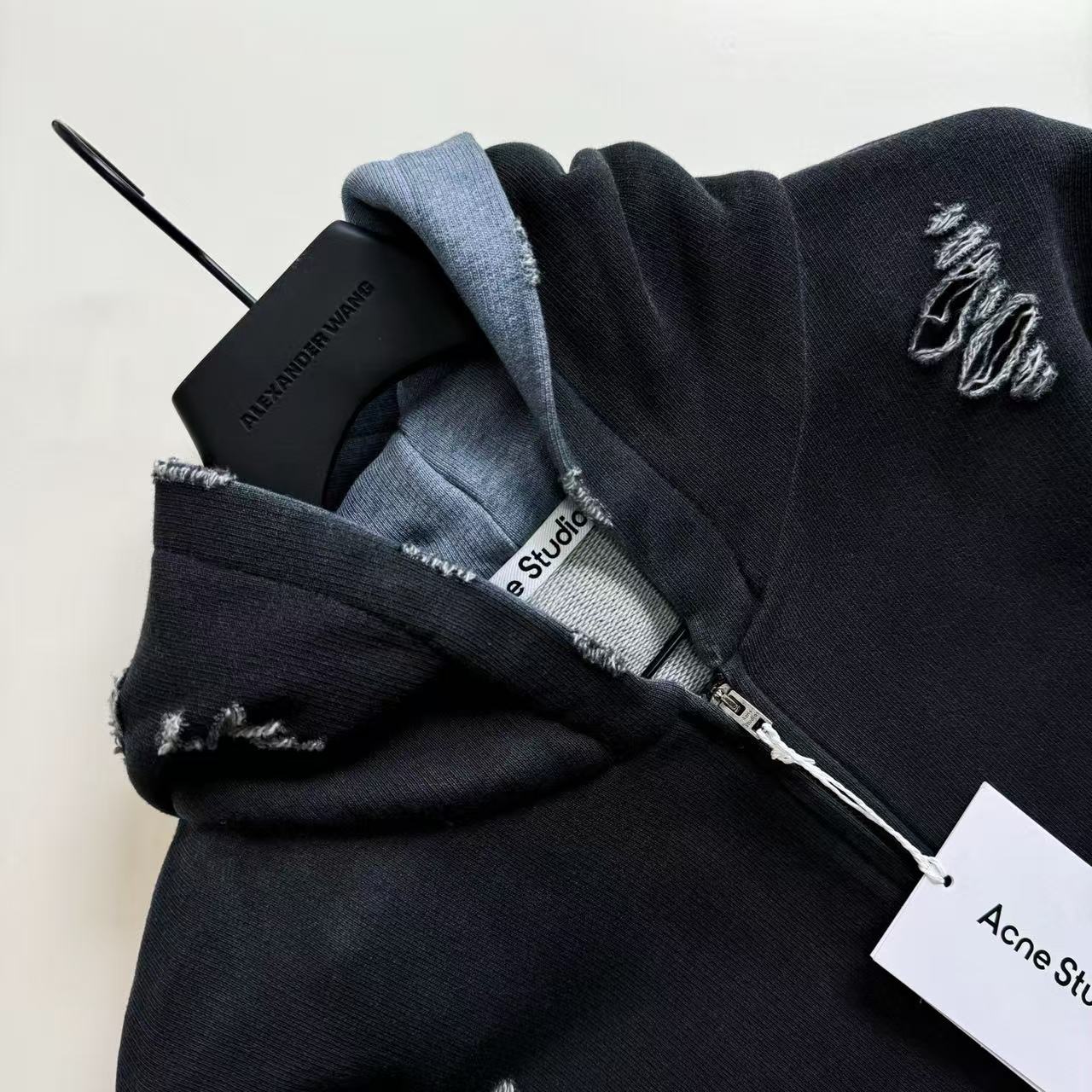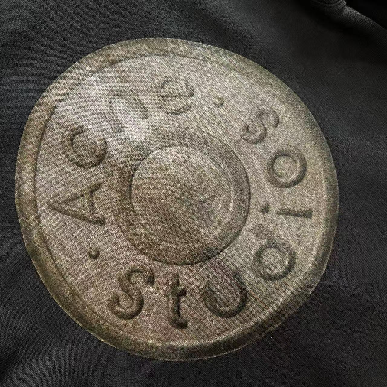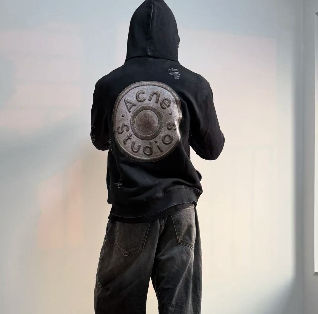布料從紗線開始就下重本:280g 定織定染精梳棉,先無塵燒毛去雜毛,再輕度蝕毛讓表面起絨,摸起來軟厚不粗糙。印花部分先用進口膠漿手工定位,再疊加數碼直噴,層次分明不掉色。成衣完成後整件馬騮噴色做舊,色澤深淺自然過渡,最後人工定點磨破——袖、袖口、口袋邊多處破壞點,位置、深淺都照正品 1:1 還原,壞得剛剛好,不會過火。