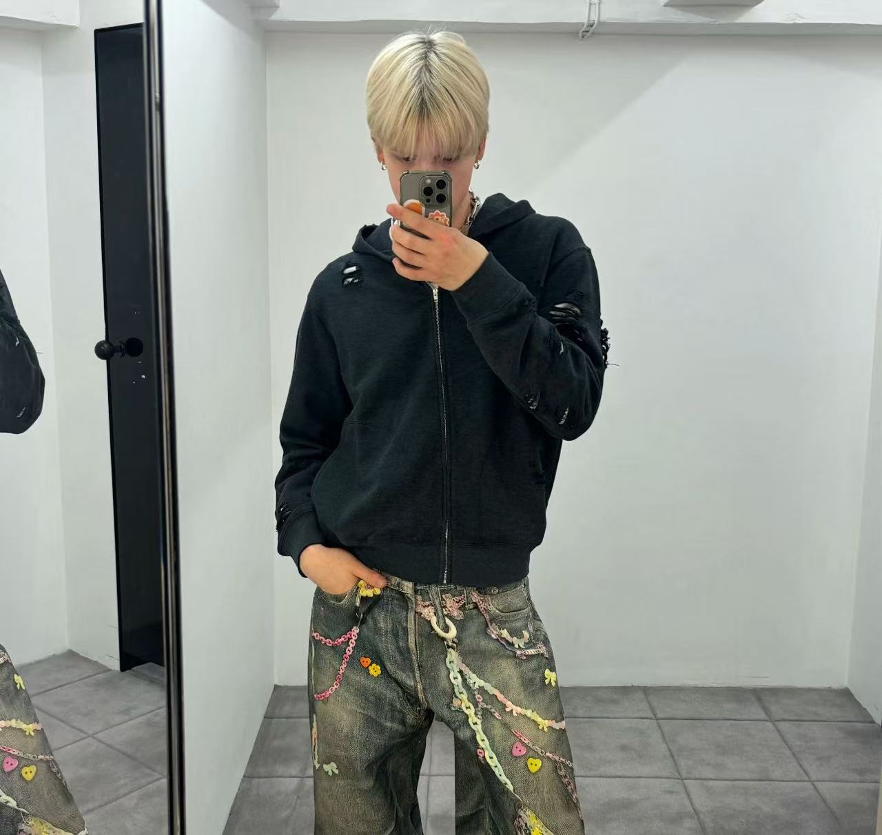 紐扣印花做舊拉鏈外套,版型俐落帶點街頭叛逆,灰藍基調低調又耐看,隨手一穿就是秋冬造型主角。