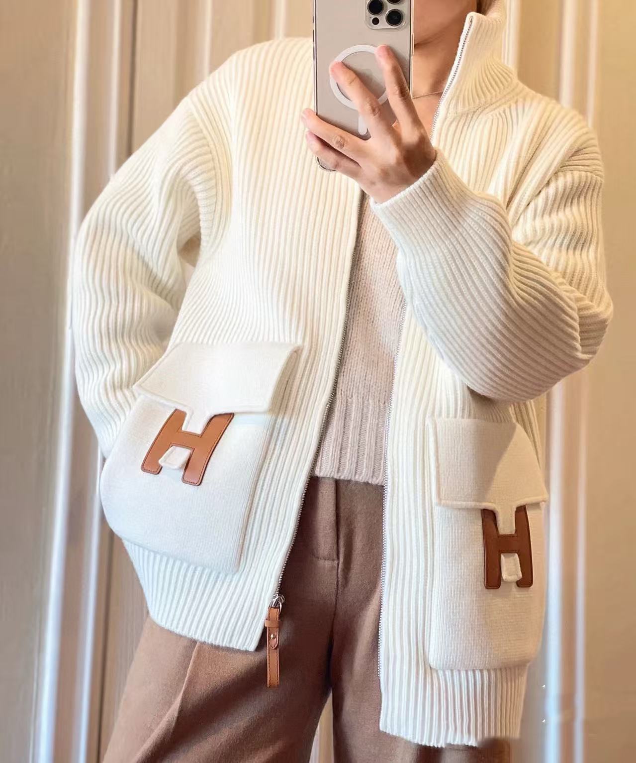 奶油白毛呢搭配 棕色皮革 “H” 口袋設計,低調卻極具辨識度,細節之處展現品牌高級工藝。
