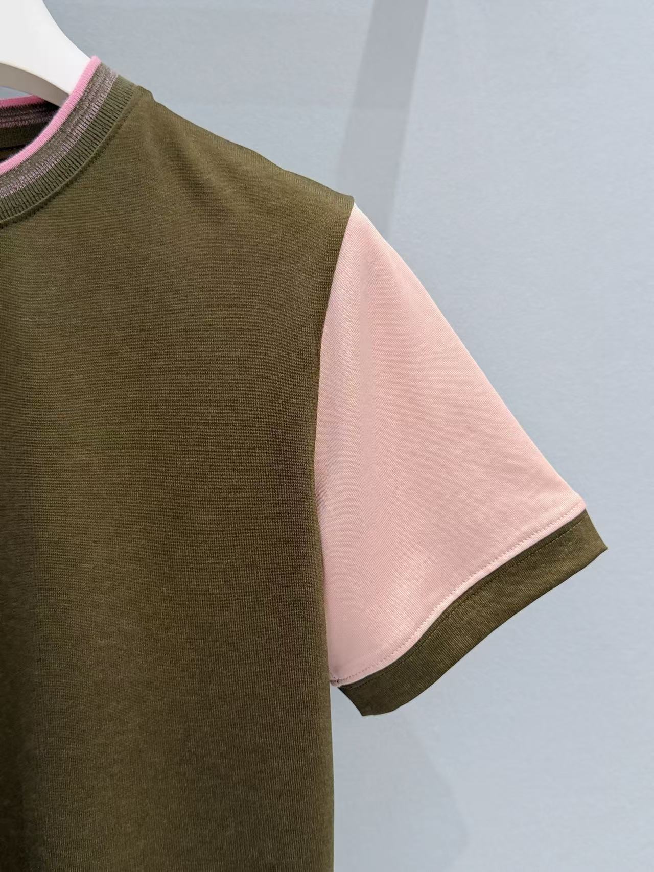 主體的卡其綠結合袖口的櫻花粉,打破了單色 T 恤的沉悶,讓整個人看起來既有質感又充滿活力的律動感。