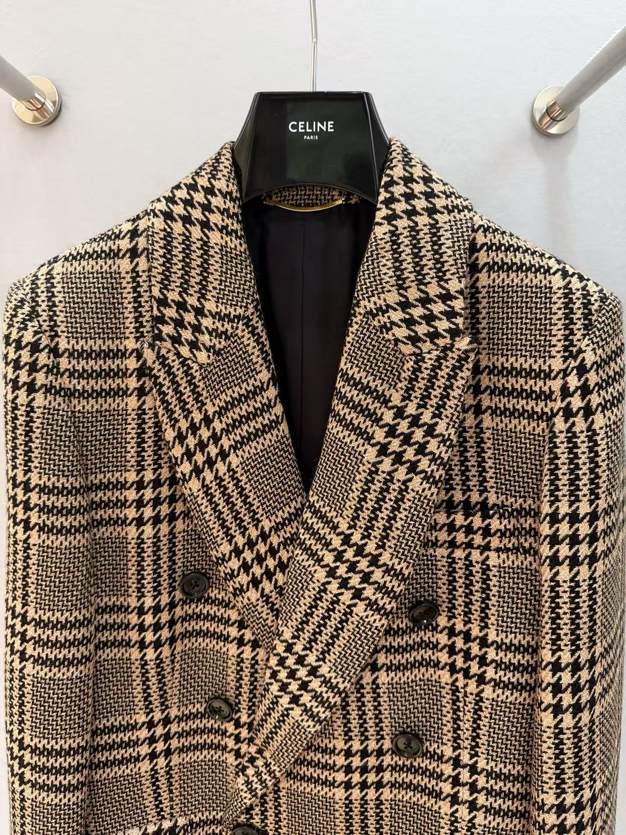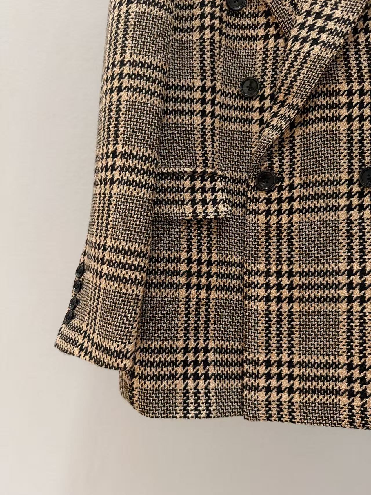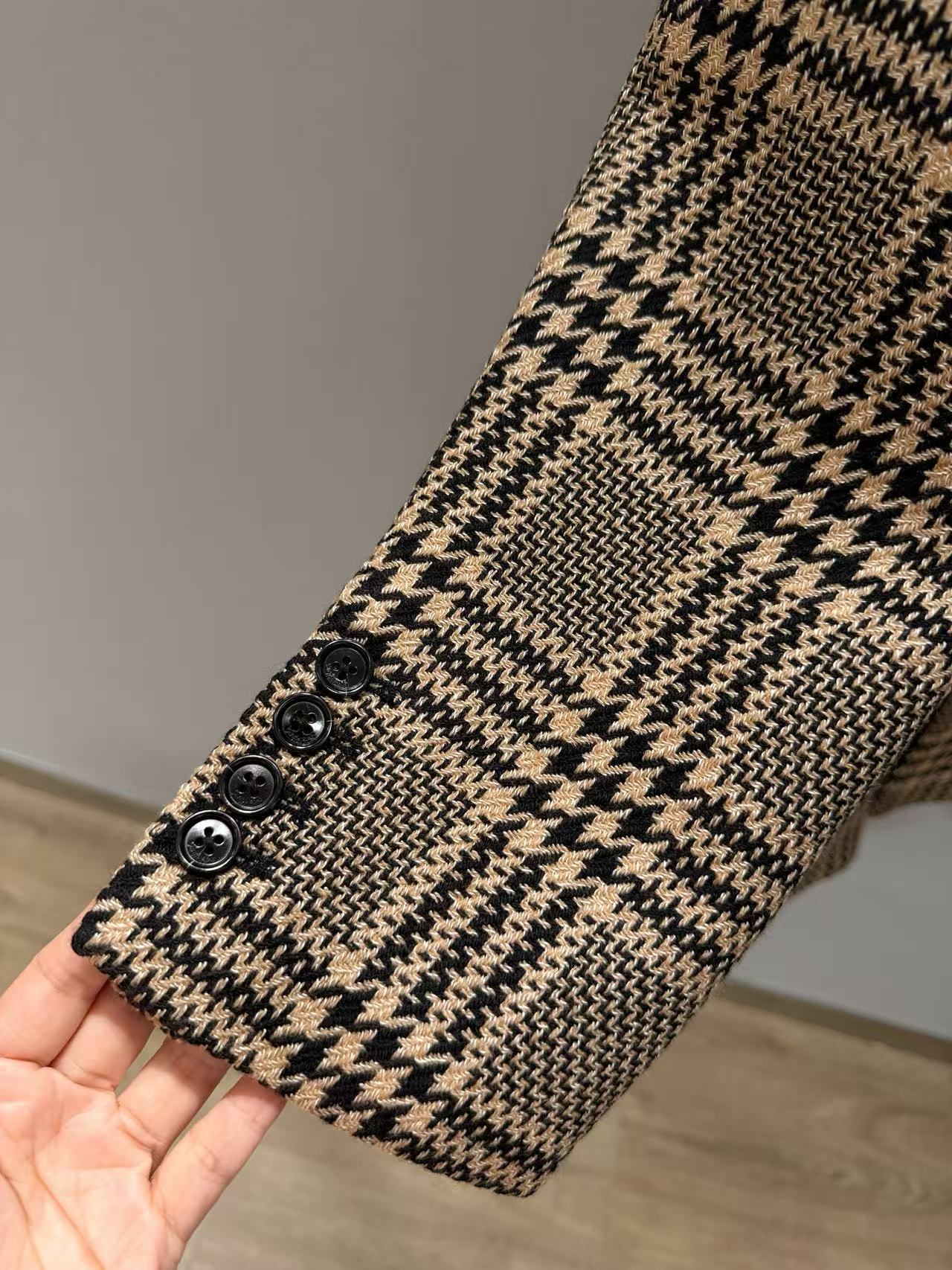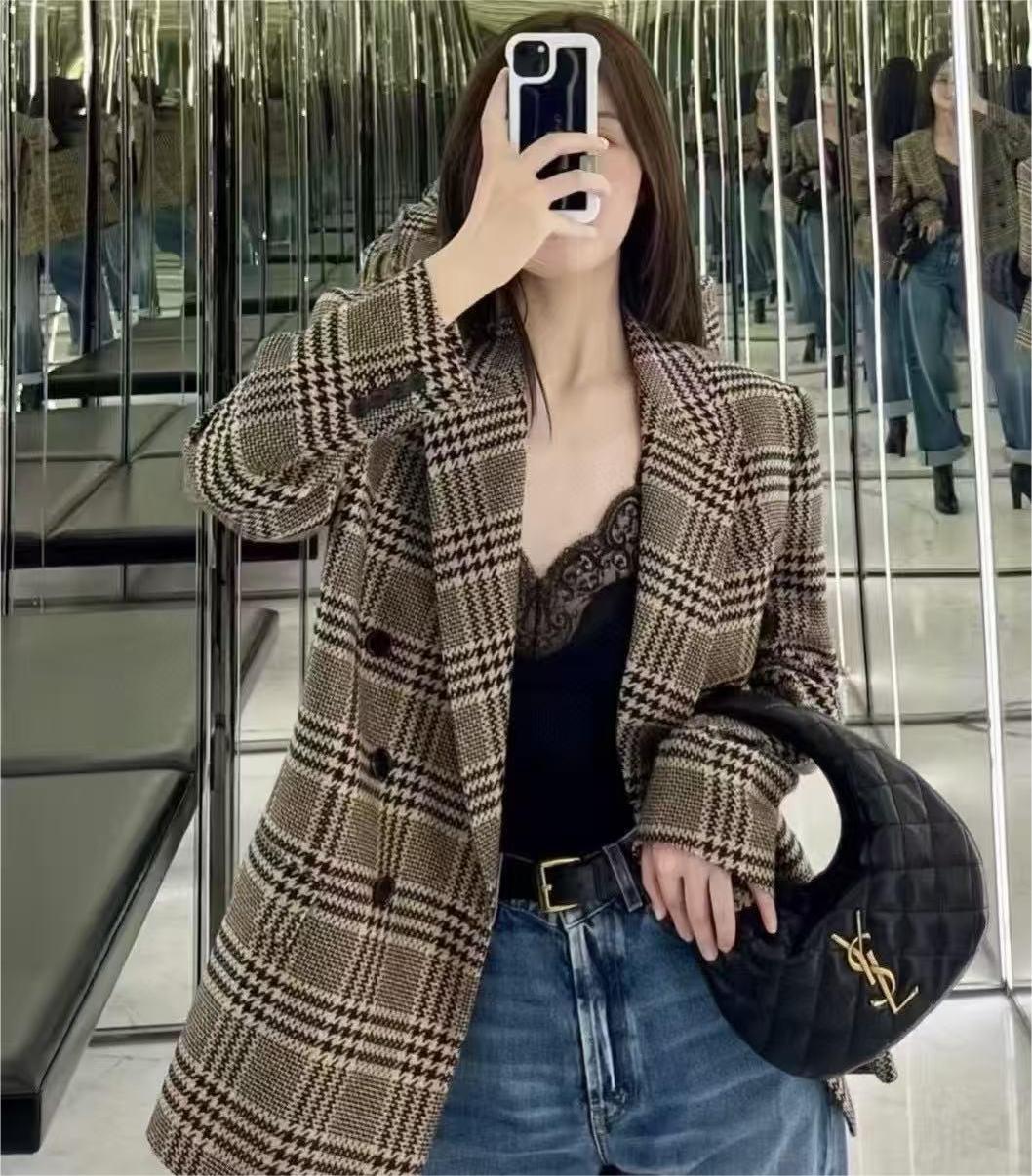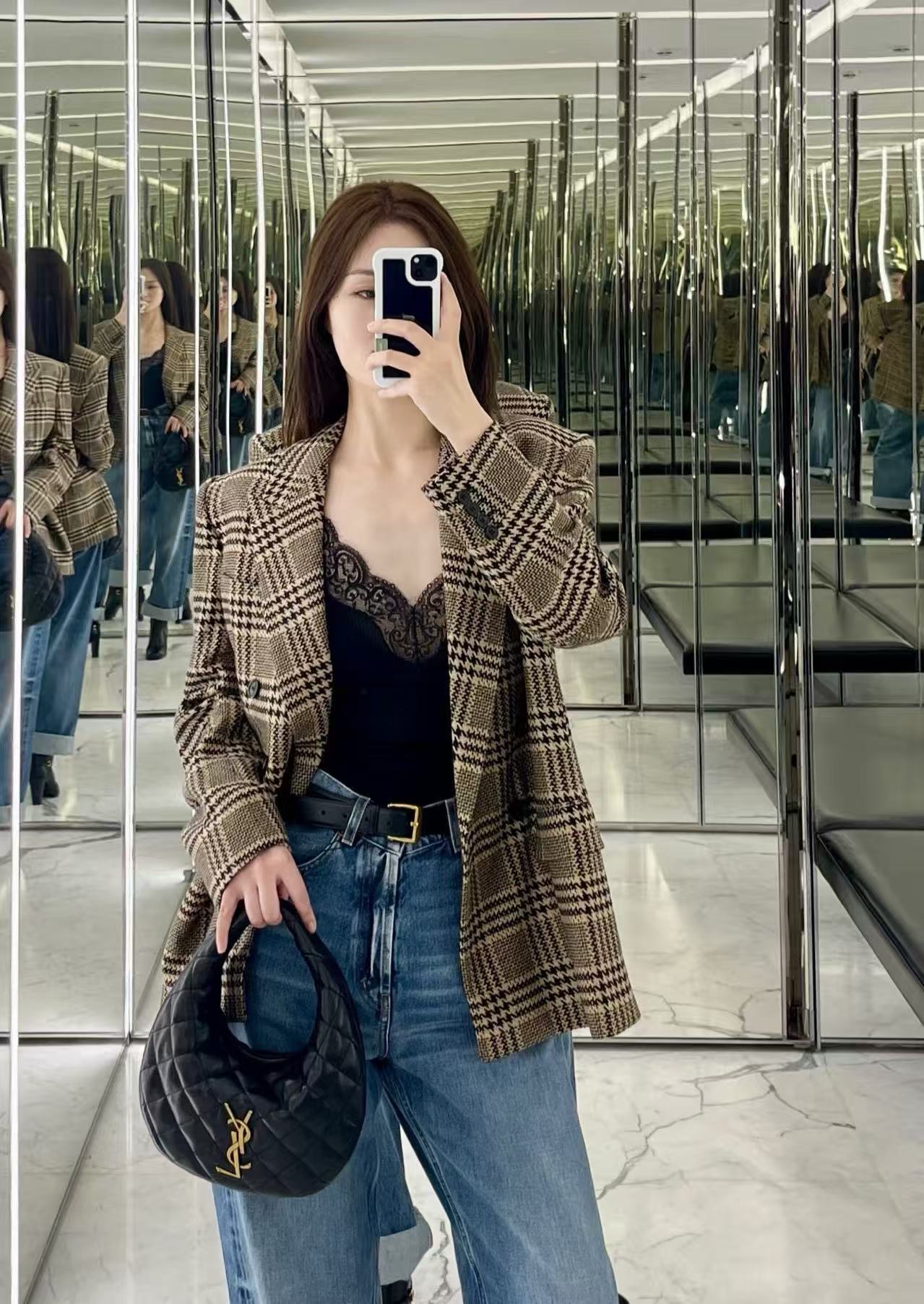復古格紋帶著淡淡英倫氣息,寬鬆剪裁讓整體更顯慵懶隨性。