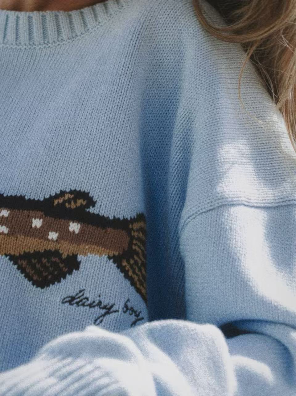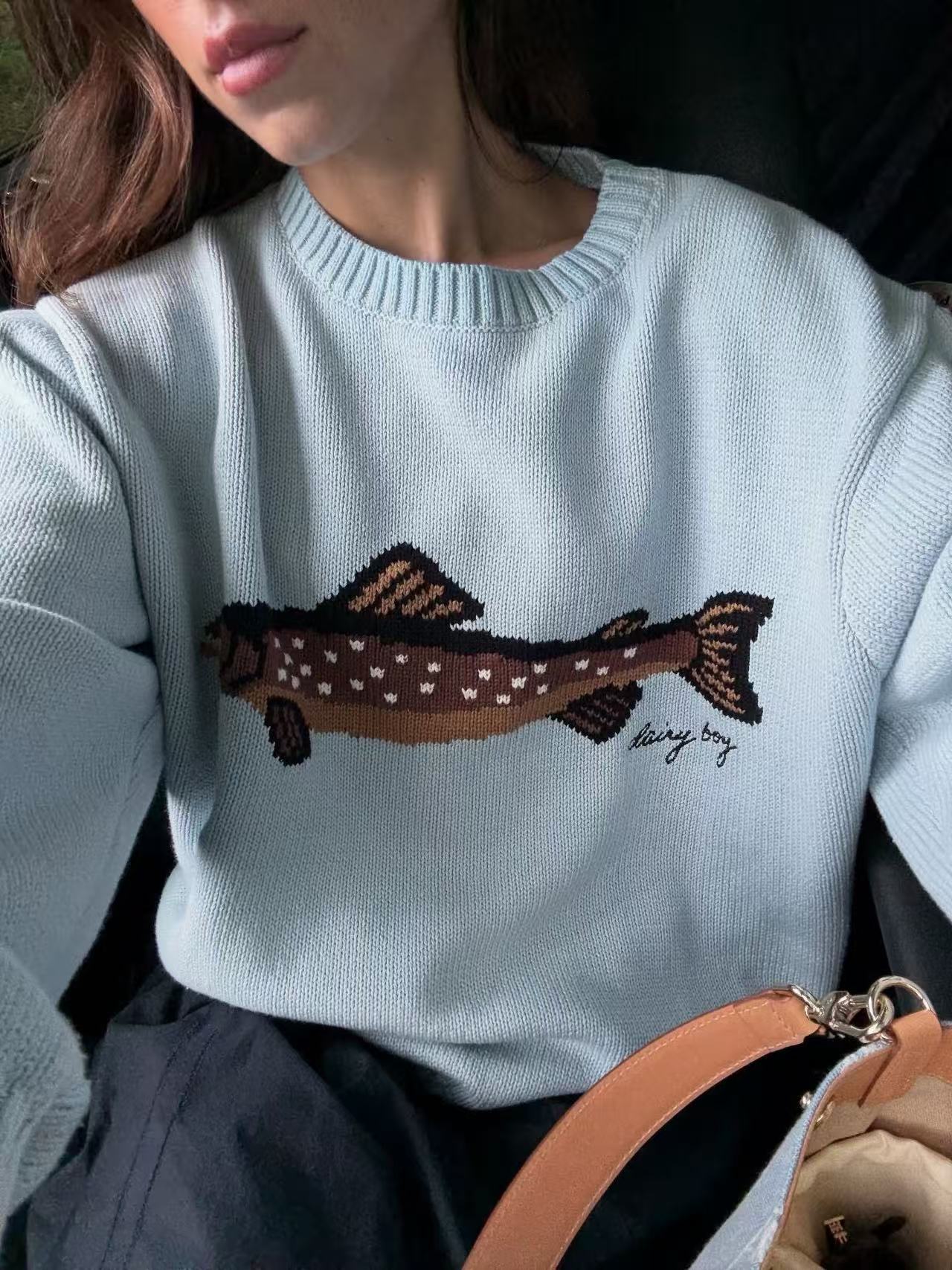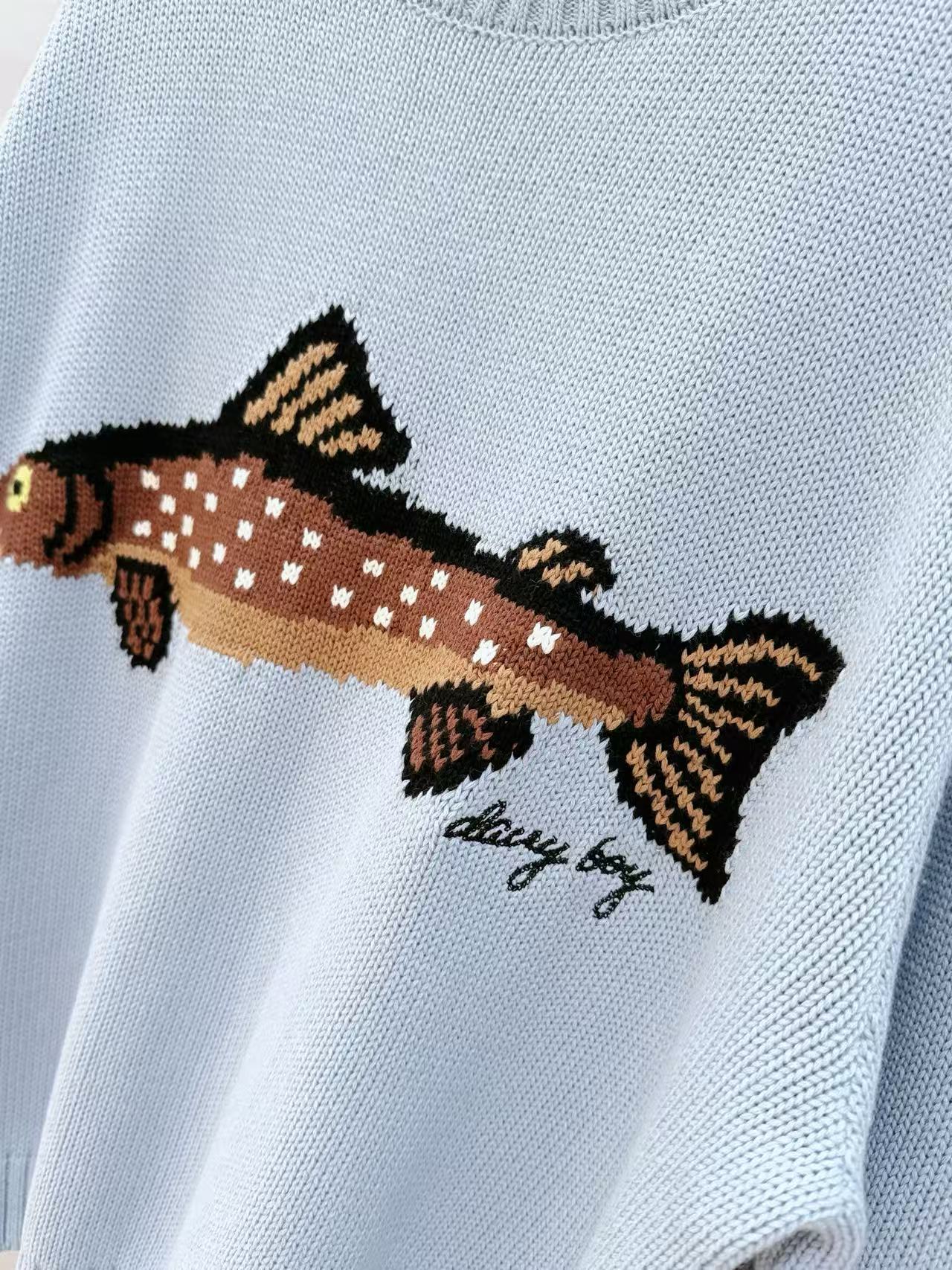 2025早秋 D家 手繪嵌織魚圖案落肩毛衣