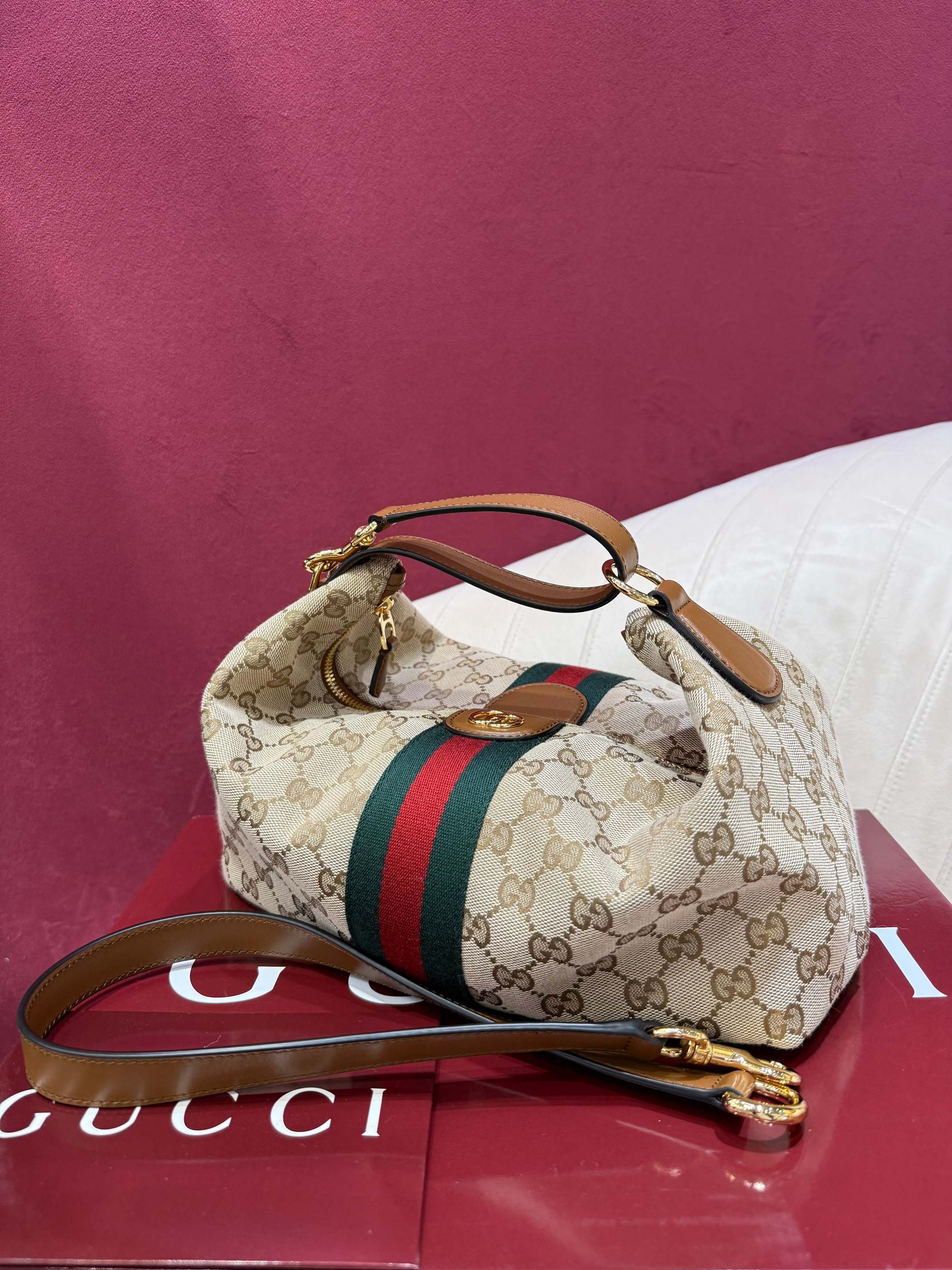 經典米色與棕色 GG 帆布搭配棕色皮革滾邊,整體視覺溫潤耐看,完全不挑季節、不挑穿搭。