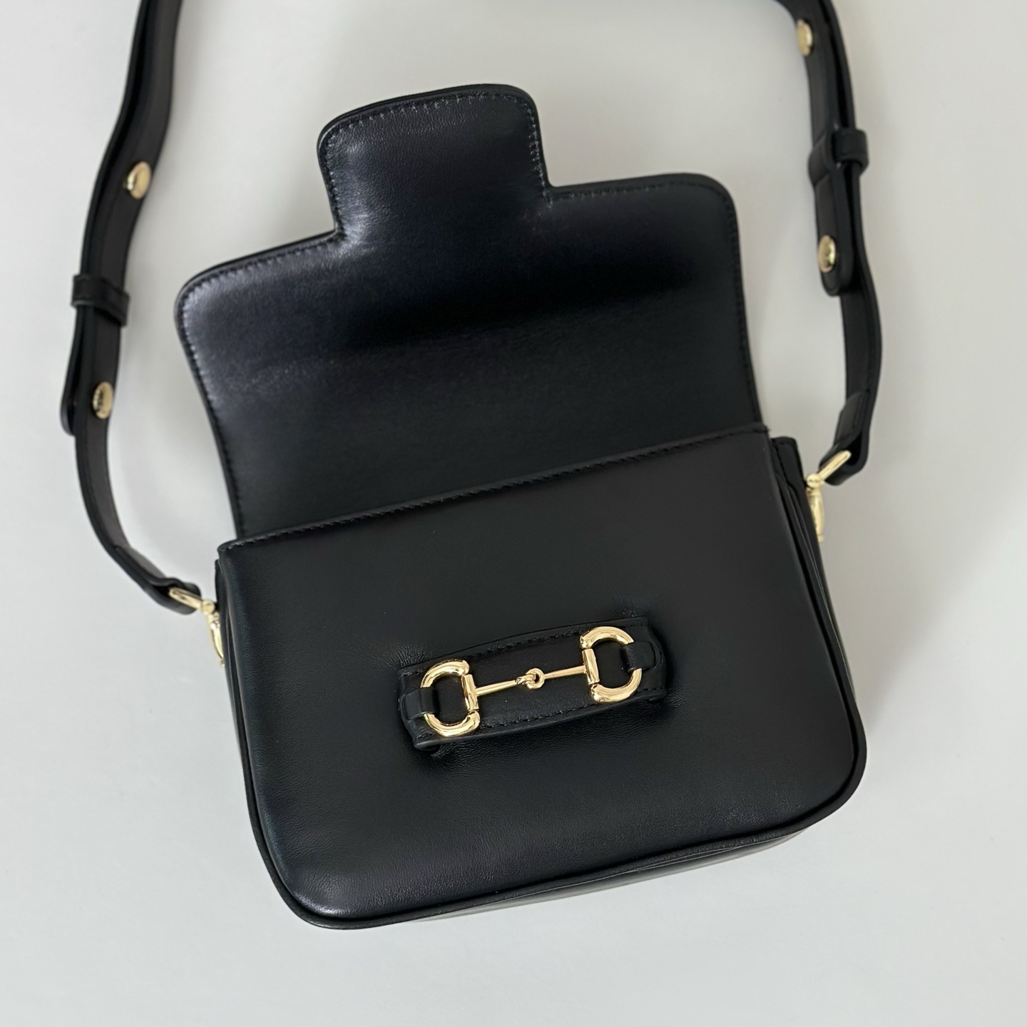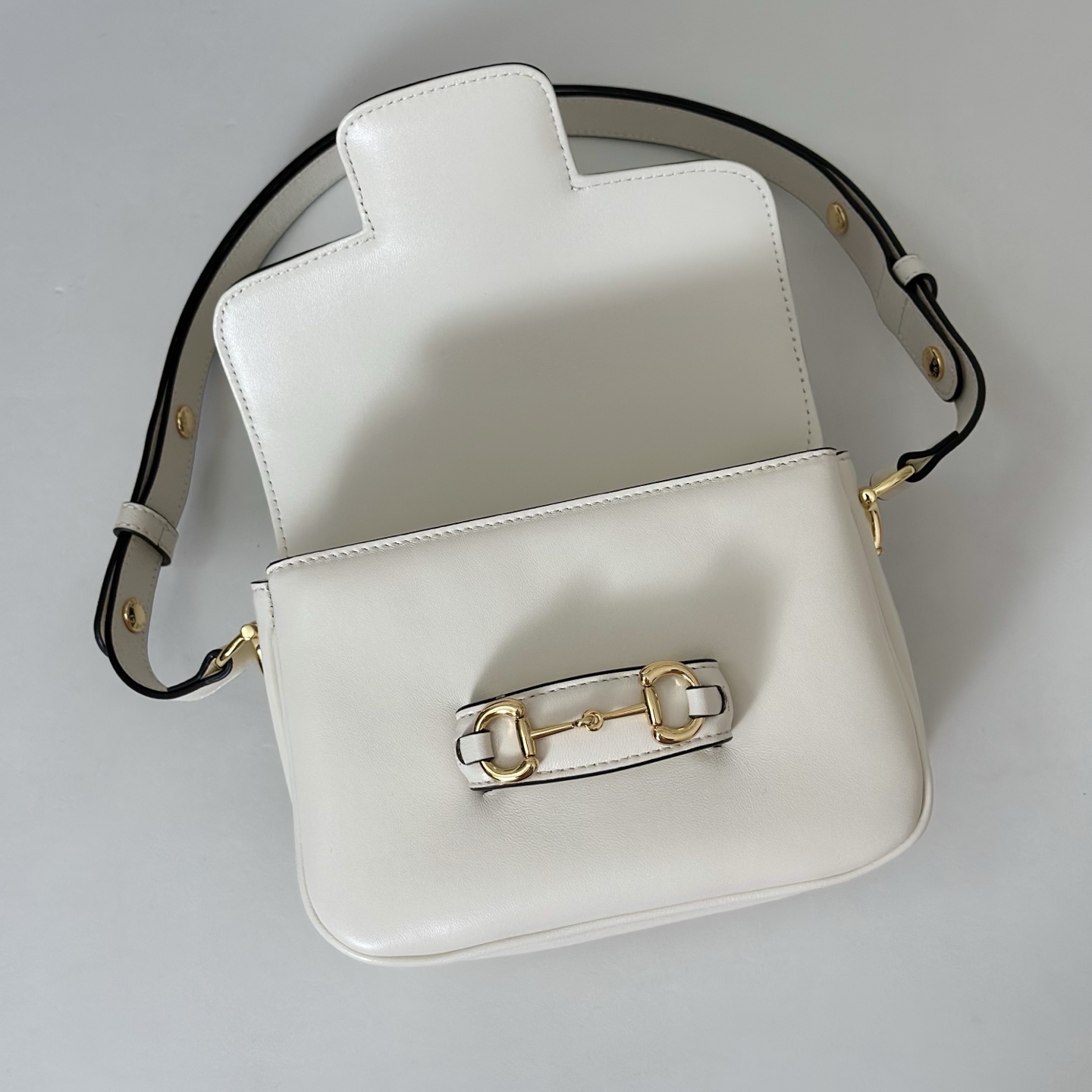 包身以光面軟皮打造,整體線條俐落卻不僵硬,搭配淺金色調的雙環與長條 Horsebit 配件,細節精緻卻不張揚。