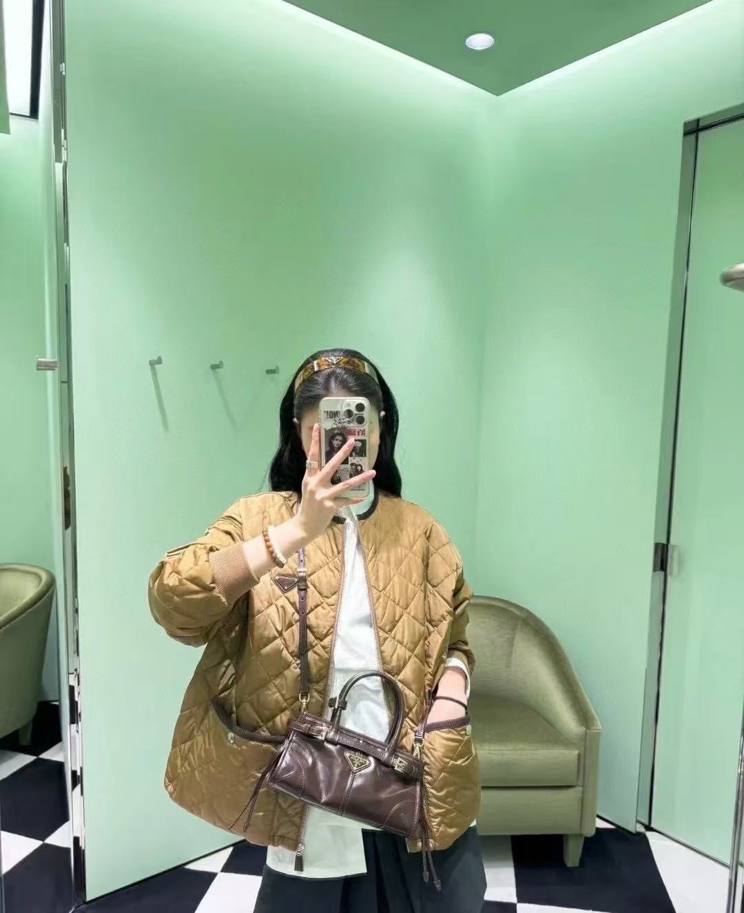 表面採用平整挺括的棉質材質,布面平滑且耐磨,穿起來有一定的份量感,能維持外套的立體廓形。,因此實品色調與質感都更有層次。三角標與口袋處的做工特別講究,細節上能看出品質差異。
