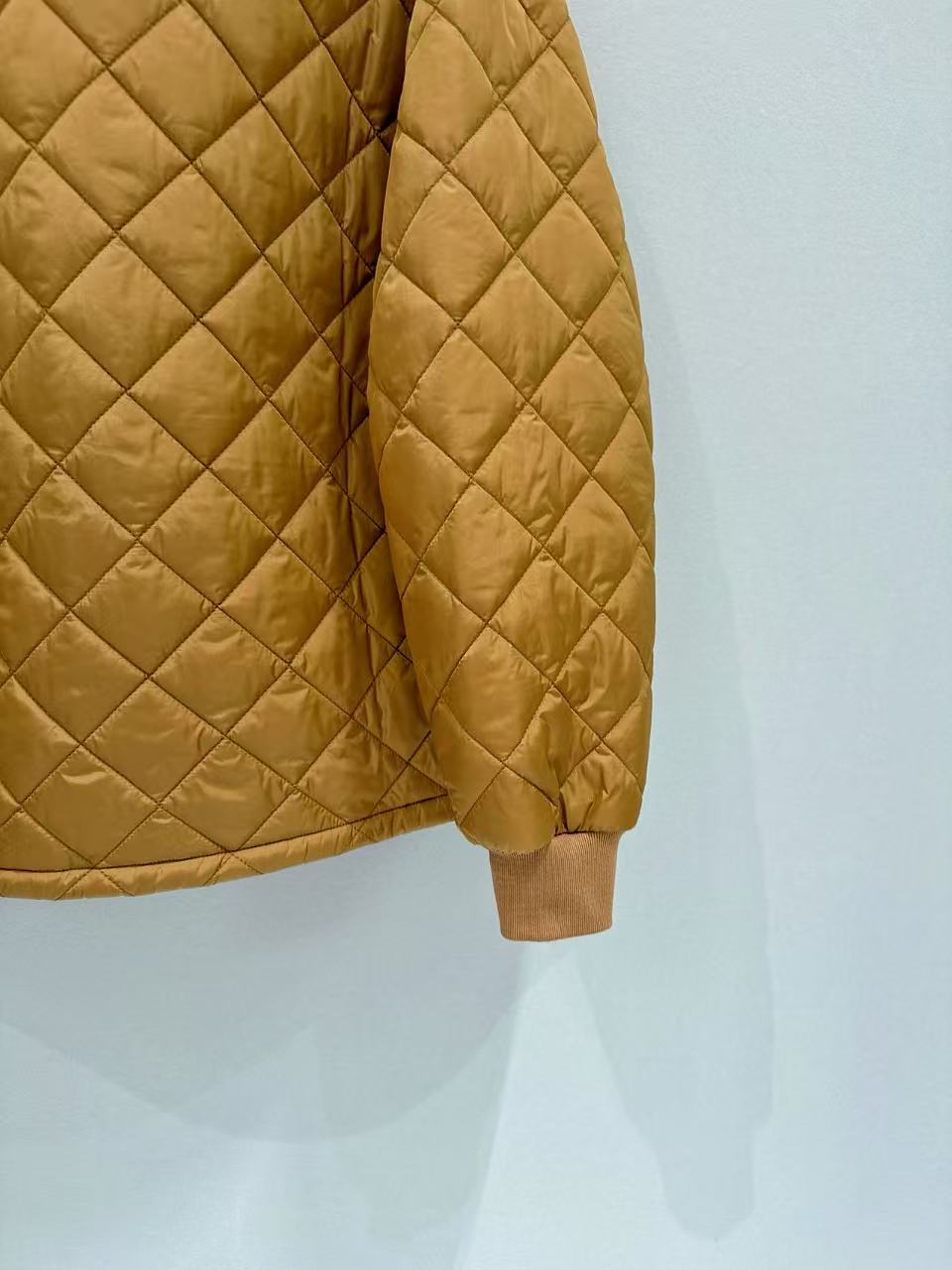 這件圓領棉服外套乍看簡約,但細節非常有誠意。焦糖色的菱形車縫設計帶出復古質感,經典雙口袋與三角標作為點綴,整體看起來既耐看又有辨識度。